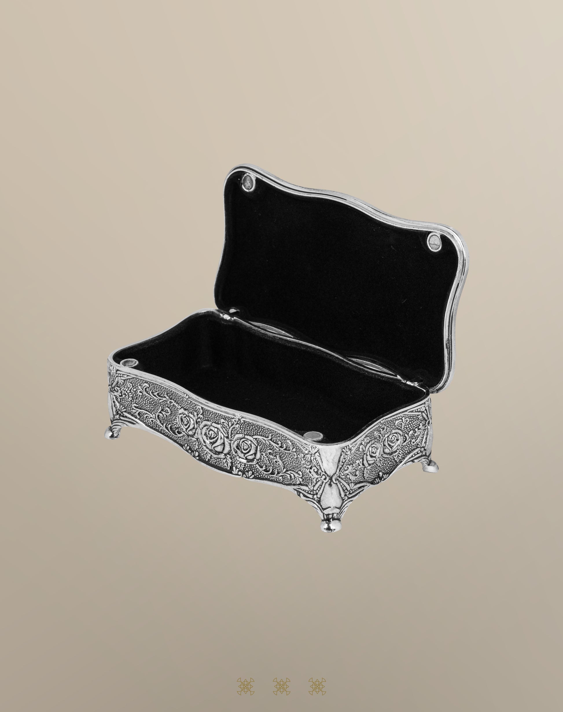 Alhajero metálico rectangular con ornamentos florales y forro interior acolchado, color plata.