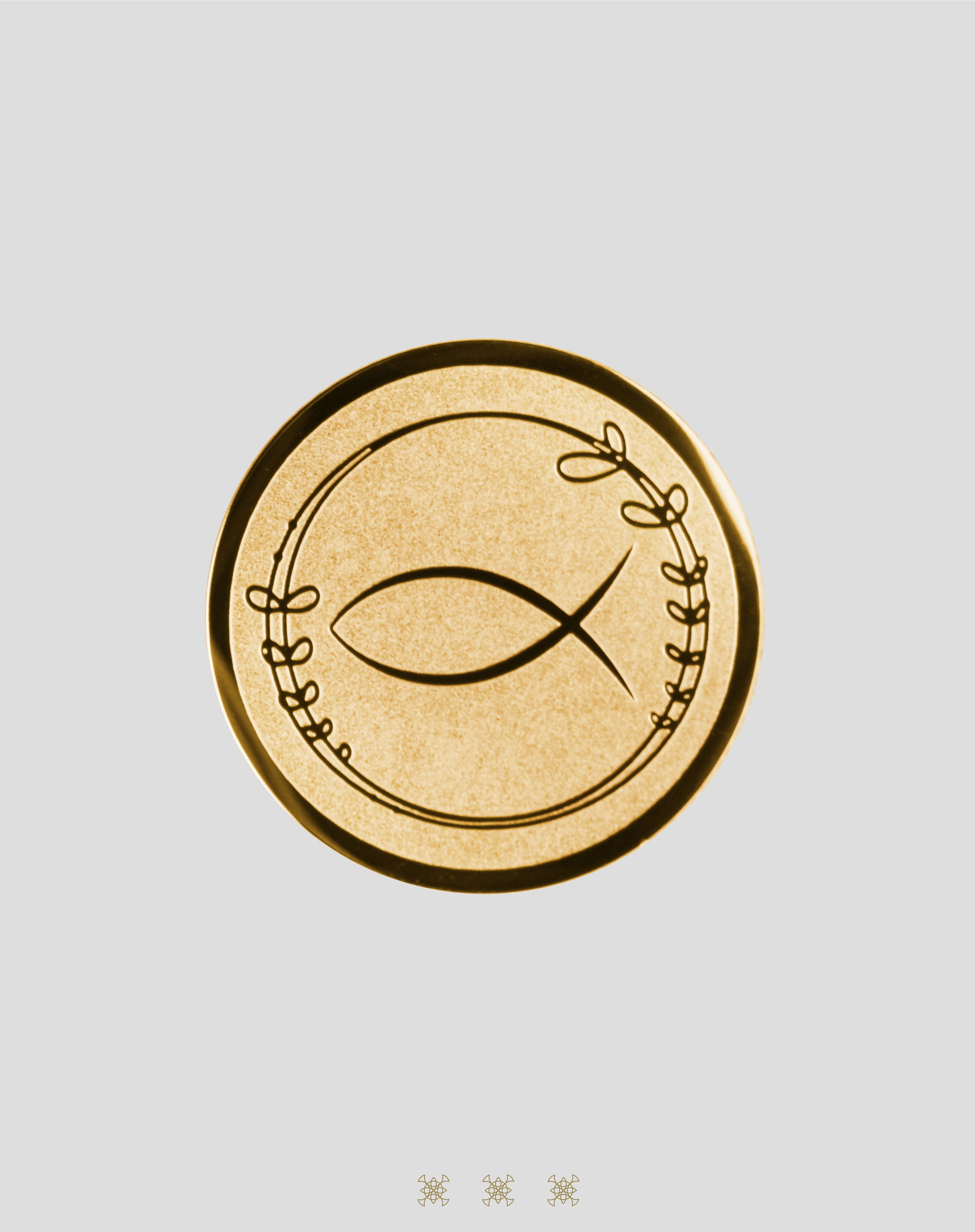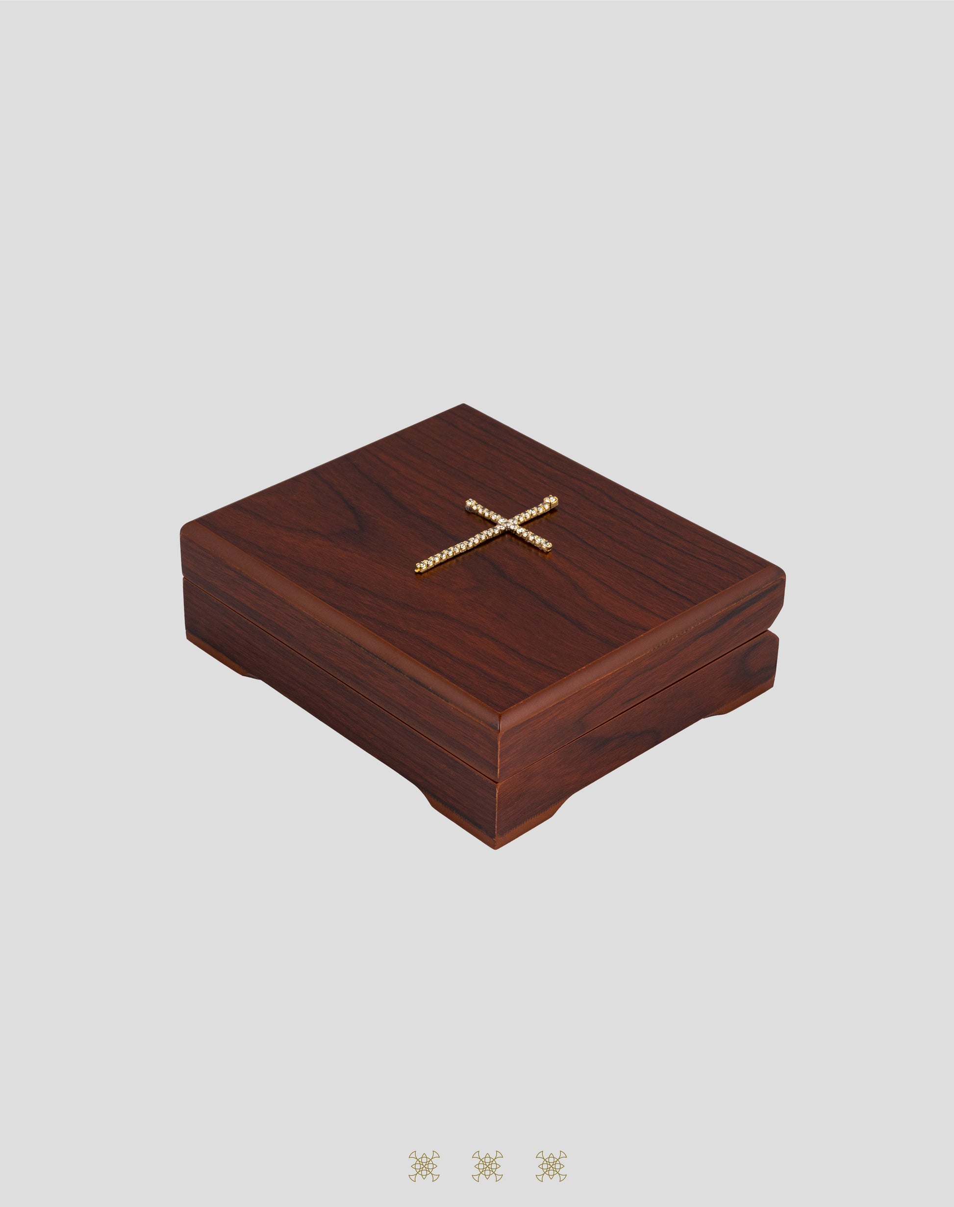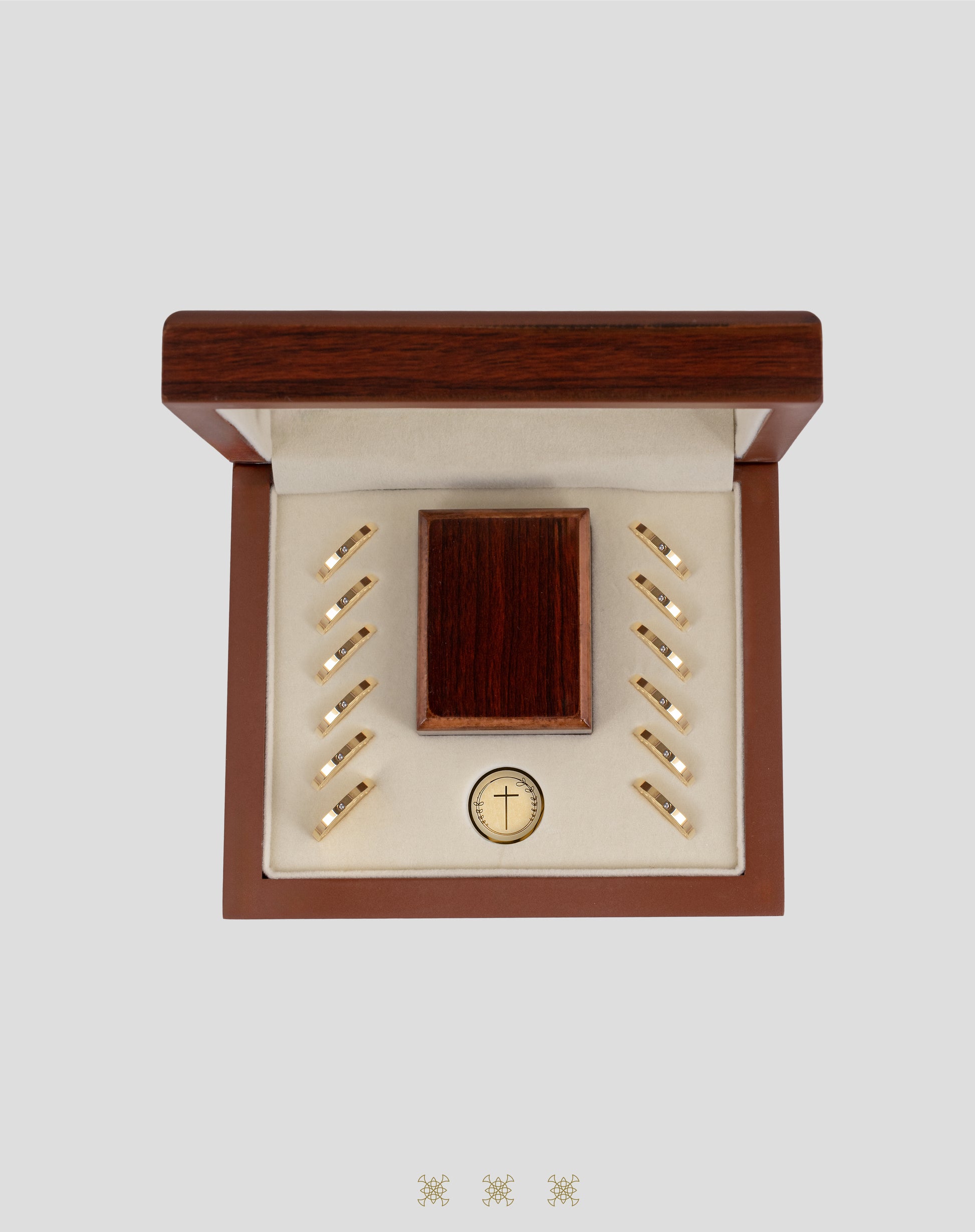 Arras de boda con baño de oro de 14k en cofre pequeño. Incluye cofre para guardar con monedas de Ichtus Jesús y la Cruz.