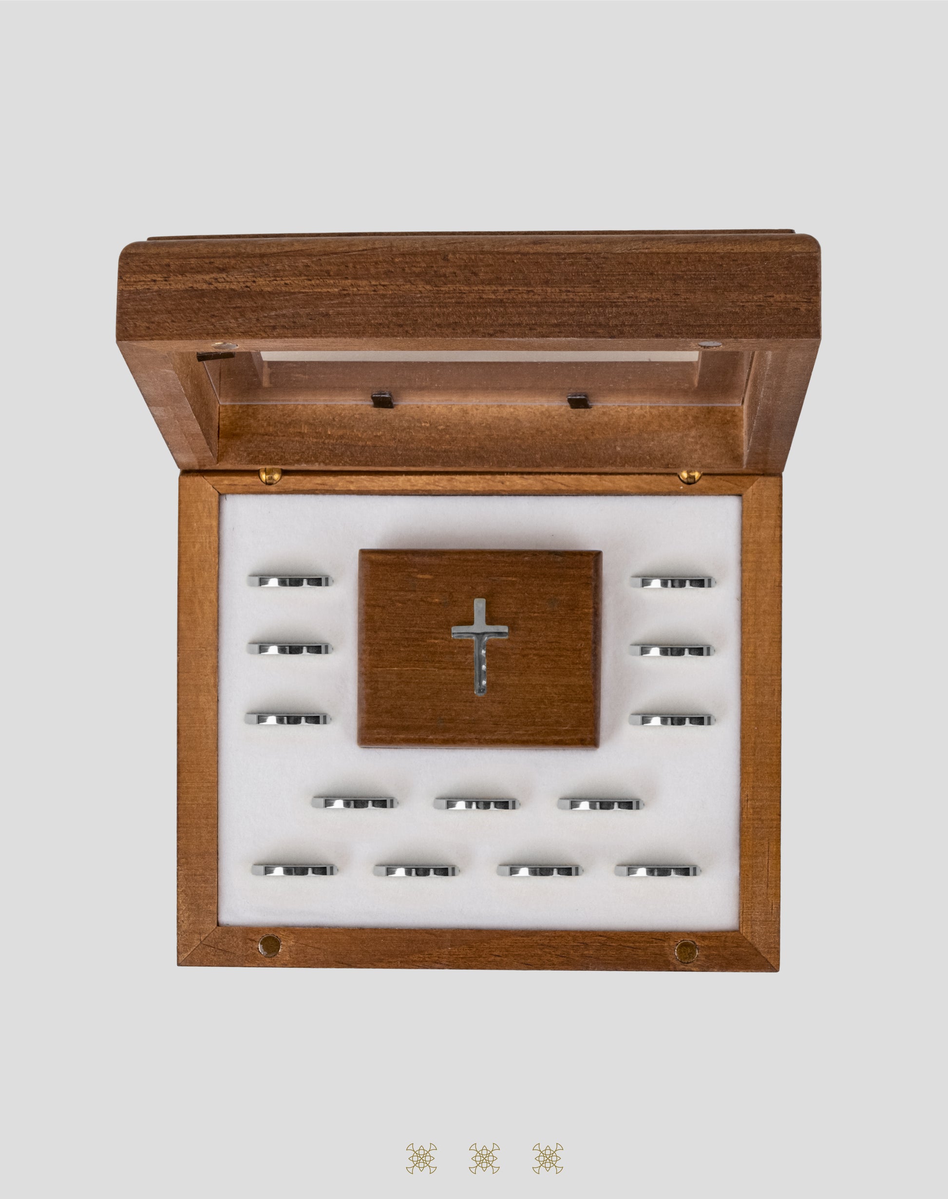 Arras de boda con baño de plata con cofre para guardar con monedas con grabado de la Virgen de Guadalupe.