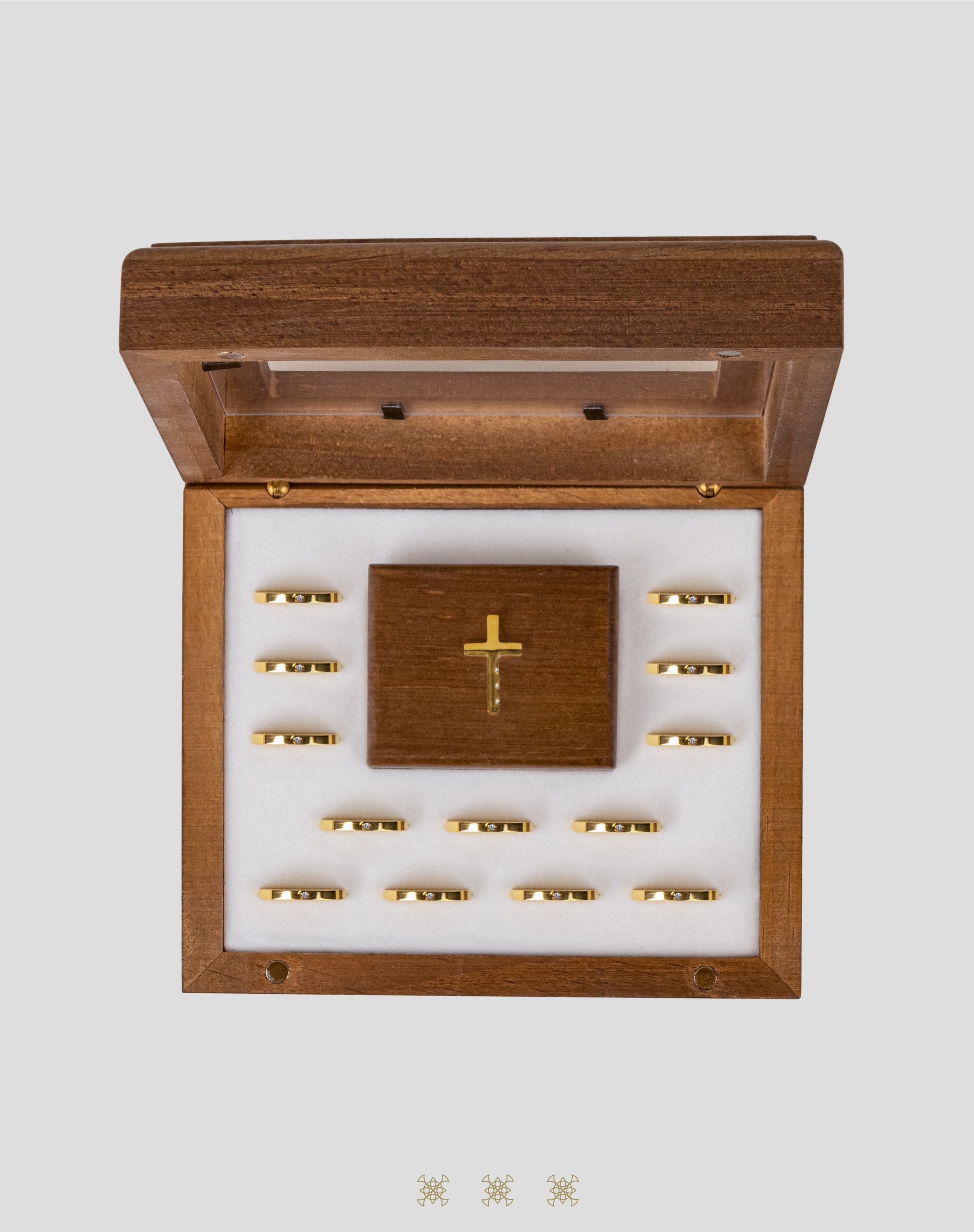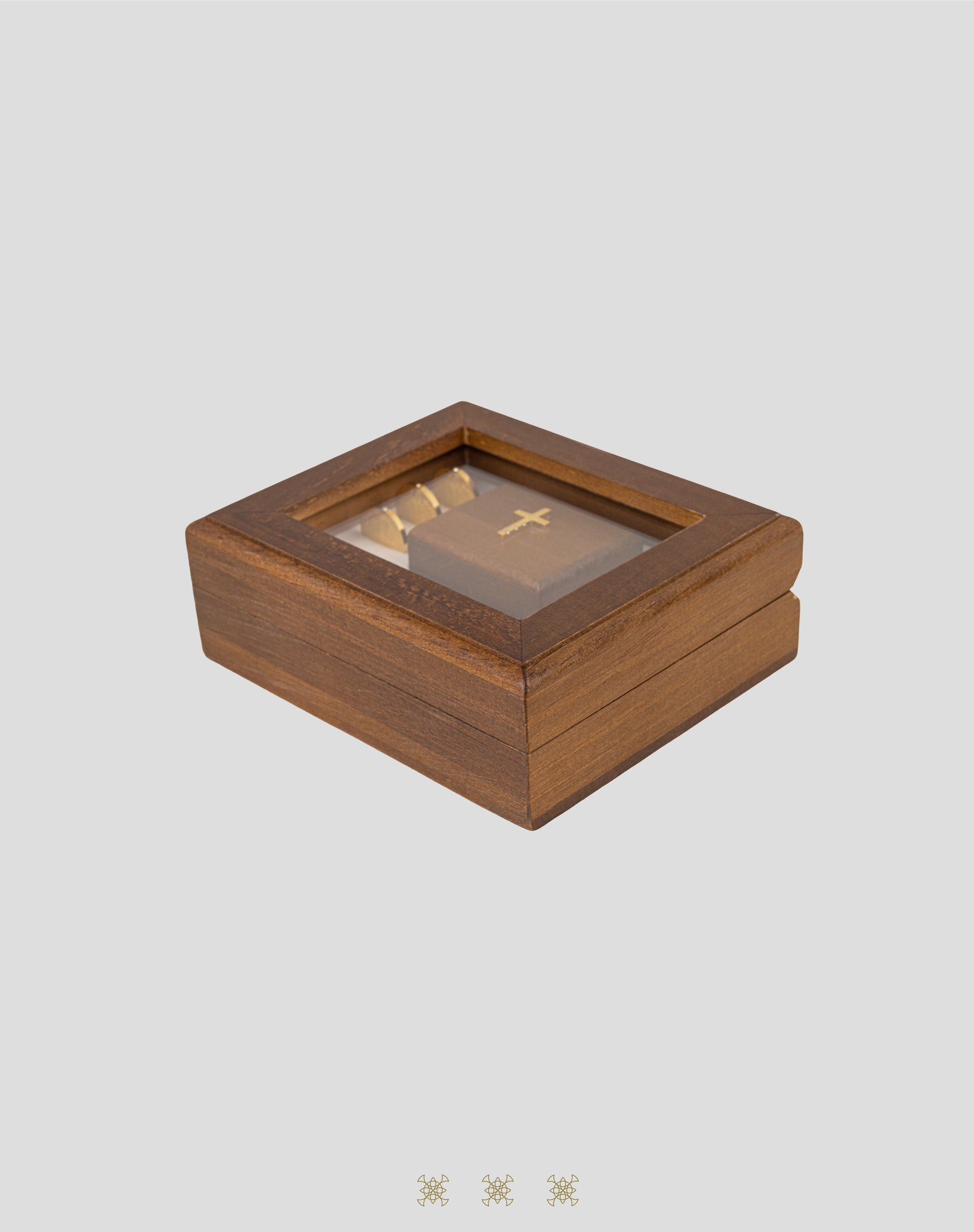 Arras de boda con baño de oro en cofre de madera. Incluye cofre para guardar las monedas de Ichtus Jesús y la Cruz.