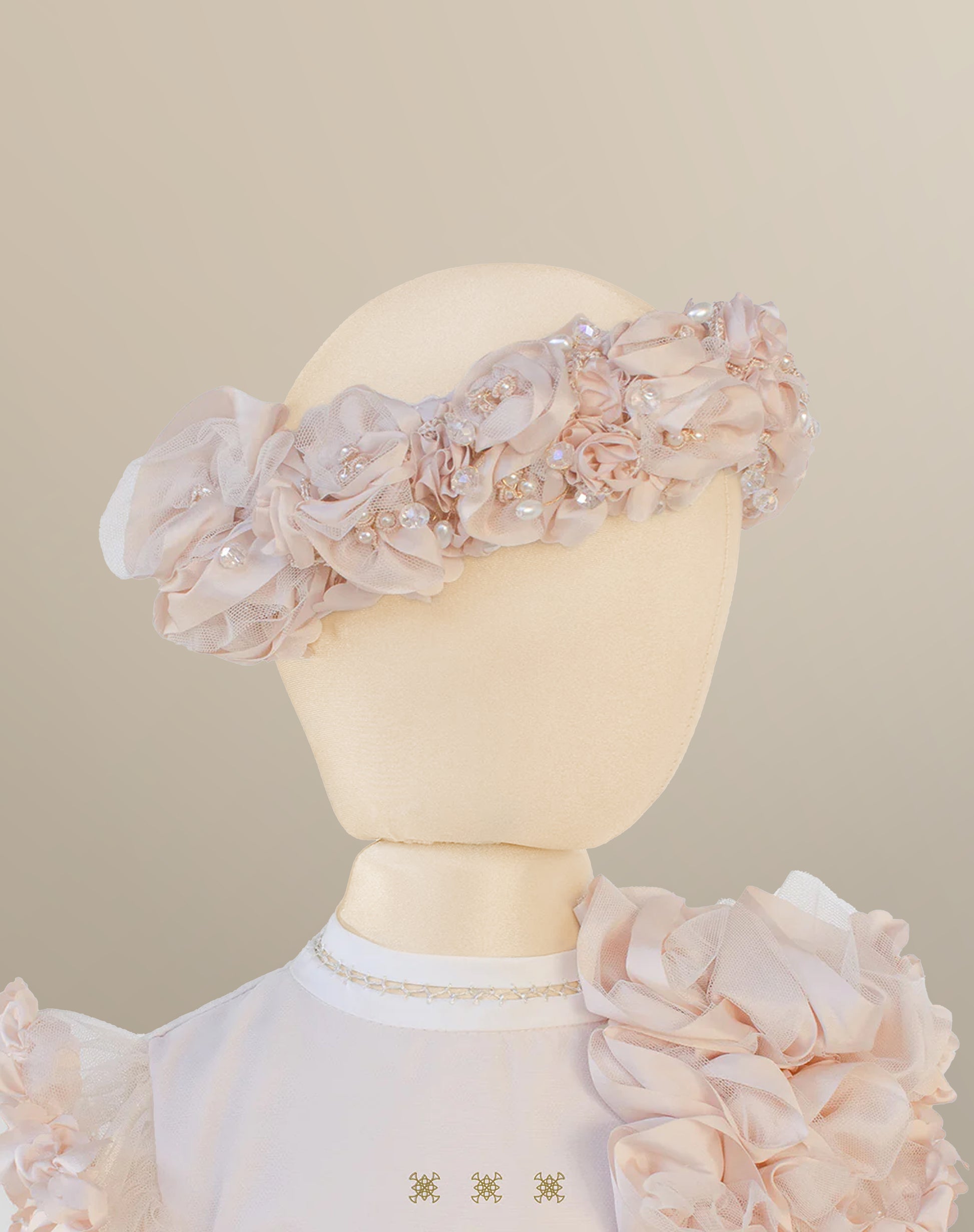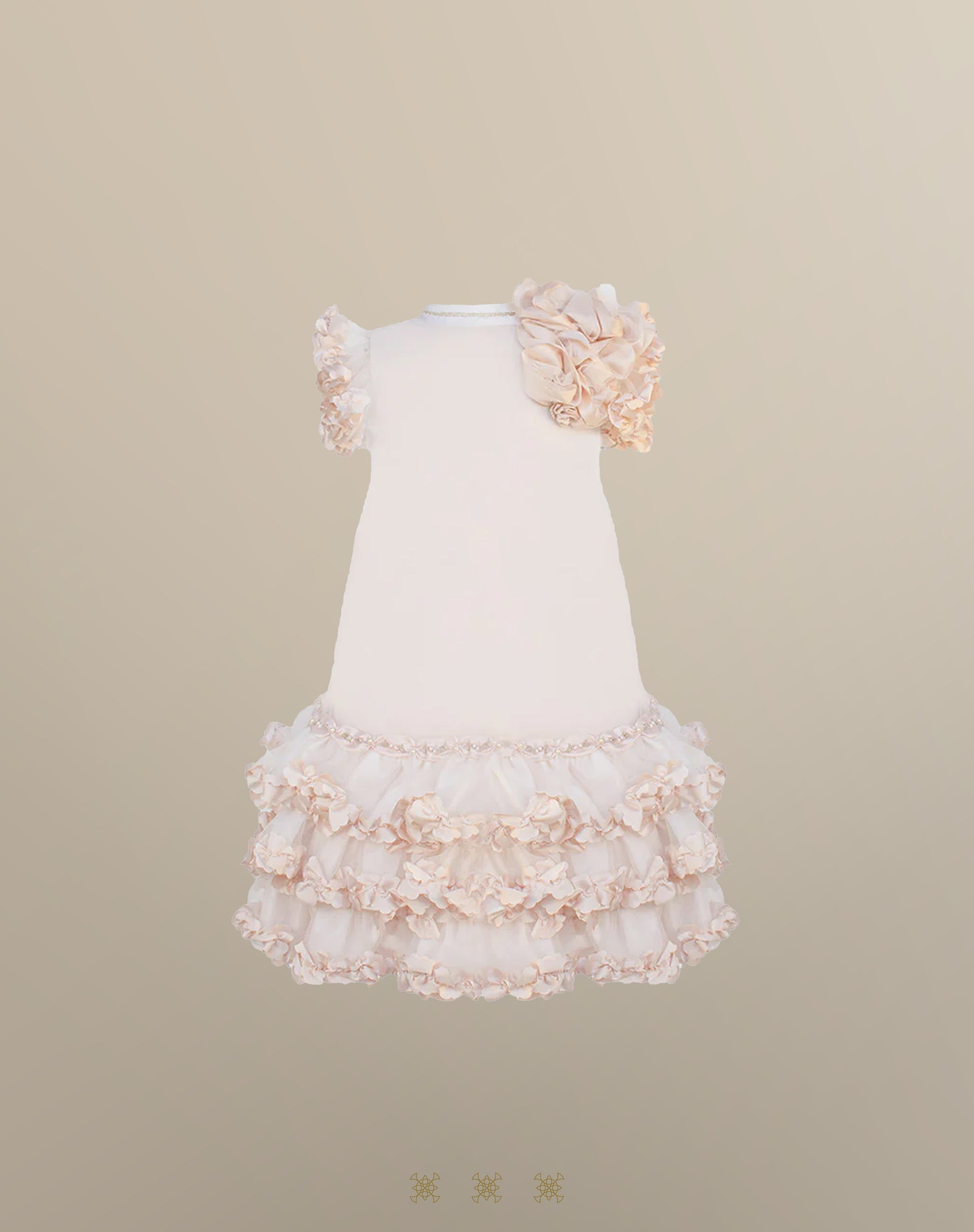 Batita corte A con mangas de olán de tul ribeteado con flores de sedalina color rosa. Capa superior de tul con detalle de ensamble gabeado en cuello. Aplicación de flores artesanales en 3D en hombro izquierdo.