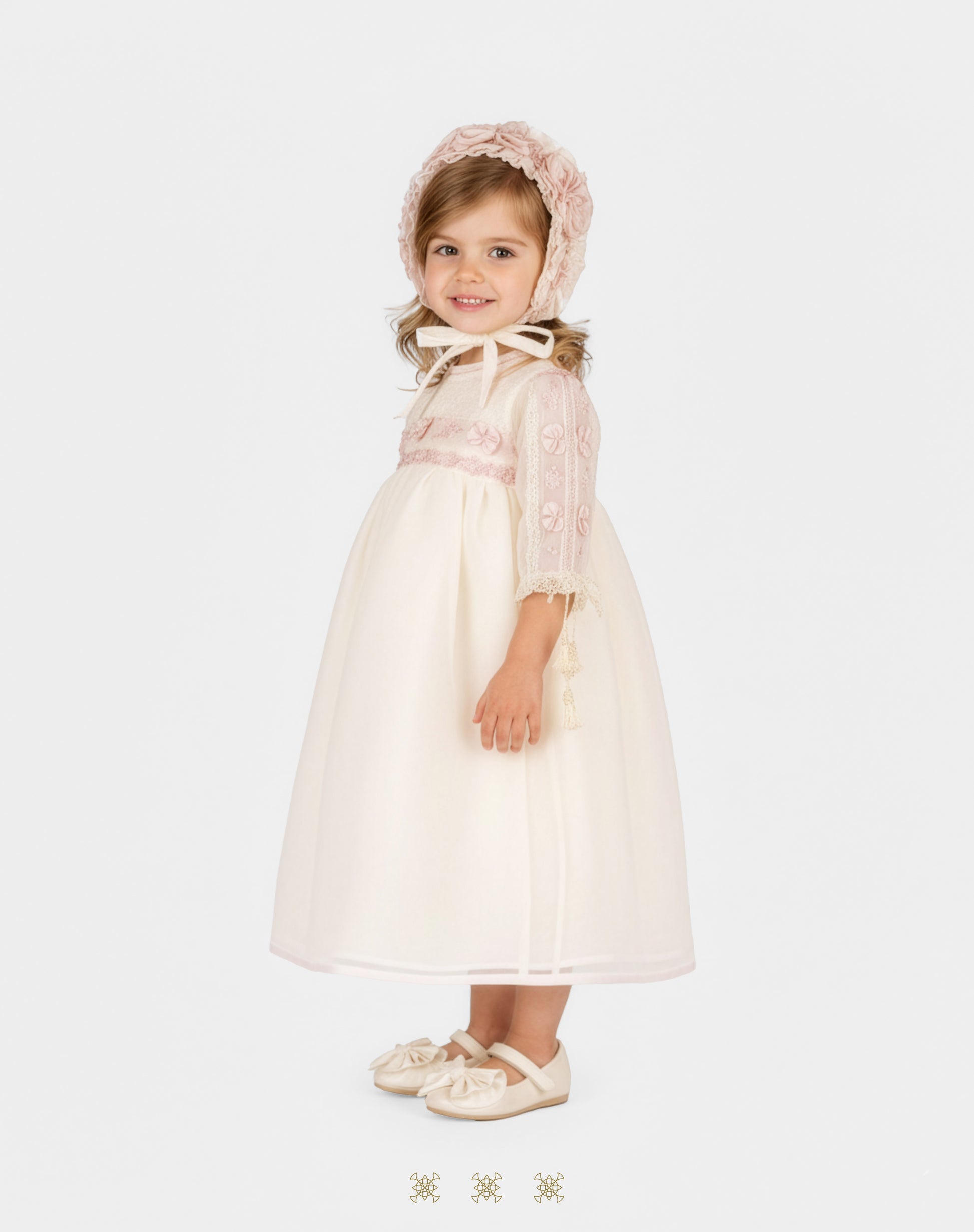 Batita de sedalina corte imperio manga larga con flores y moños. Peto con escarola de tul bordado en patrones geométricos con aplicación de cinta de sedalina bordada a mano. Aplicación de flores artesanales en hombro izquierdo y parte del pecho. Detalle de gabeado hecho a mano en cuello. Incluye gorro.