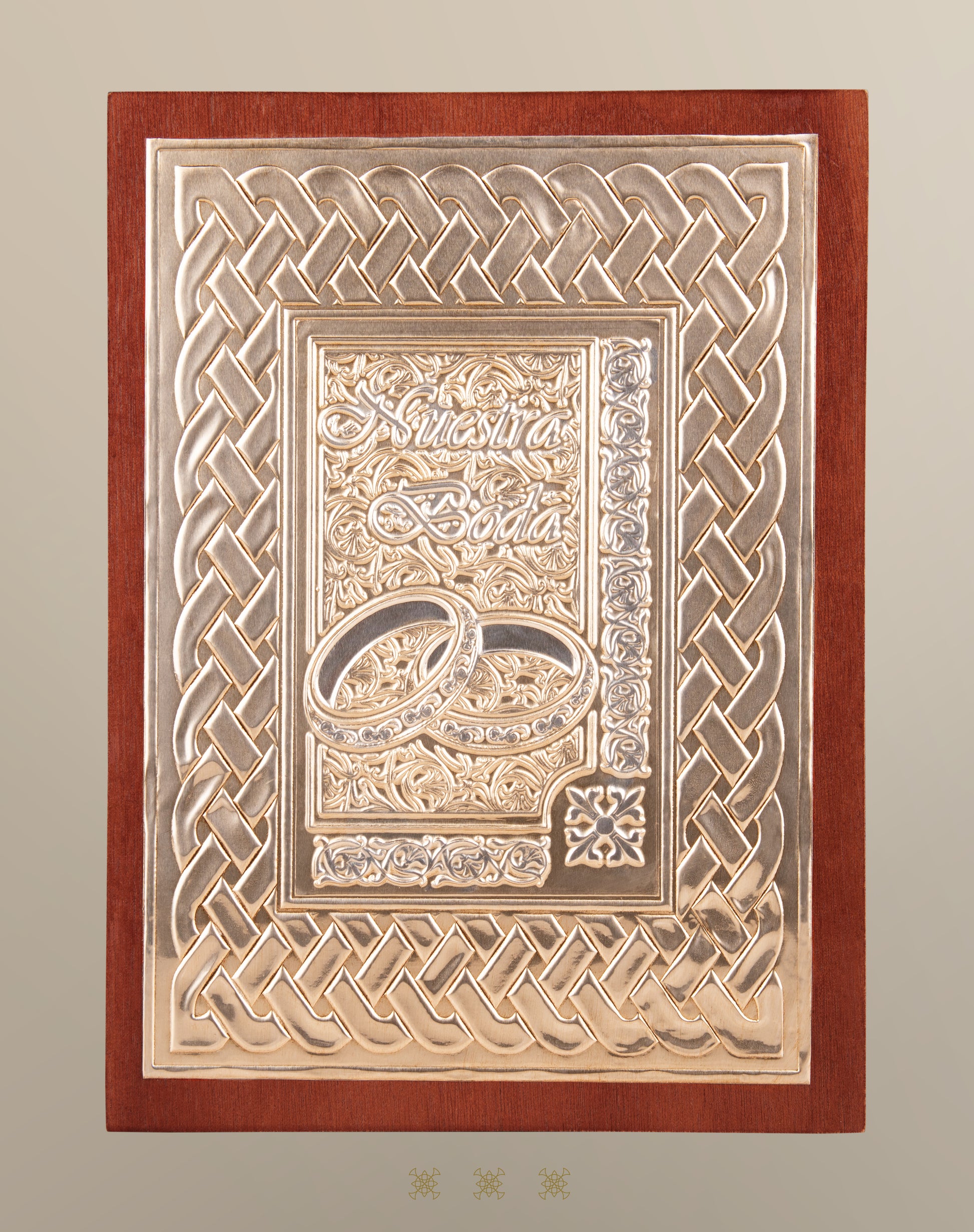 Biblia de boda con aplicación de repujado artesanal con diseño de argollas color dorado con detalles en color plata, con cofre de madera a juego con cierre de metal.
