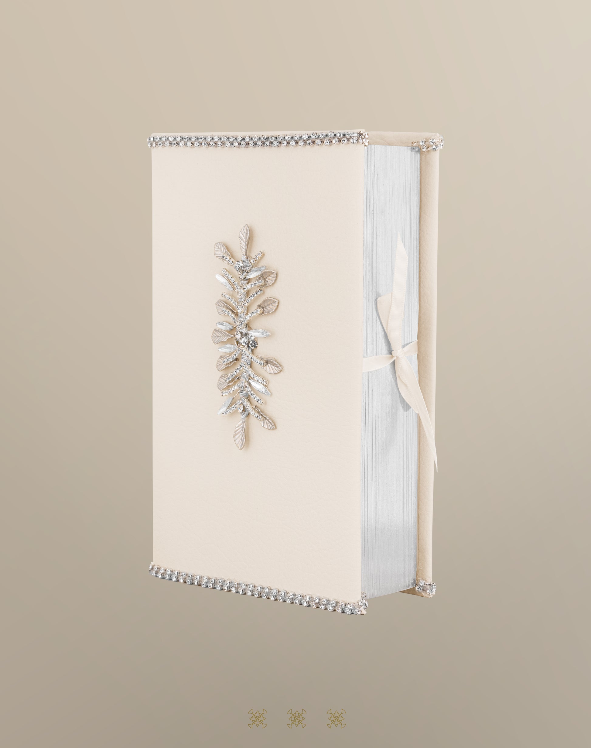 Biblia de boda color hueso forrada de vinipiel con adorno de flores en 3D con borde de hojas pintado color plata y detalles brillantes. Cierre por medio de listón.