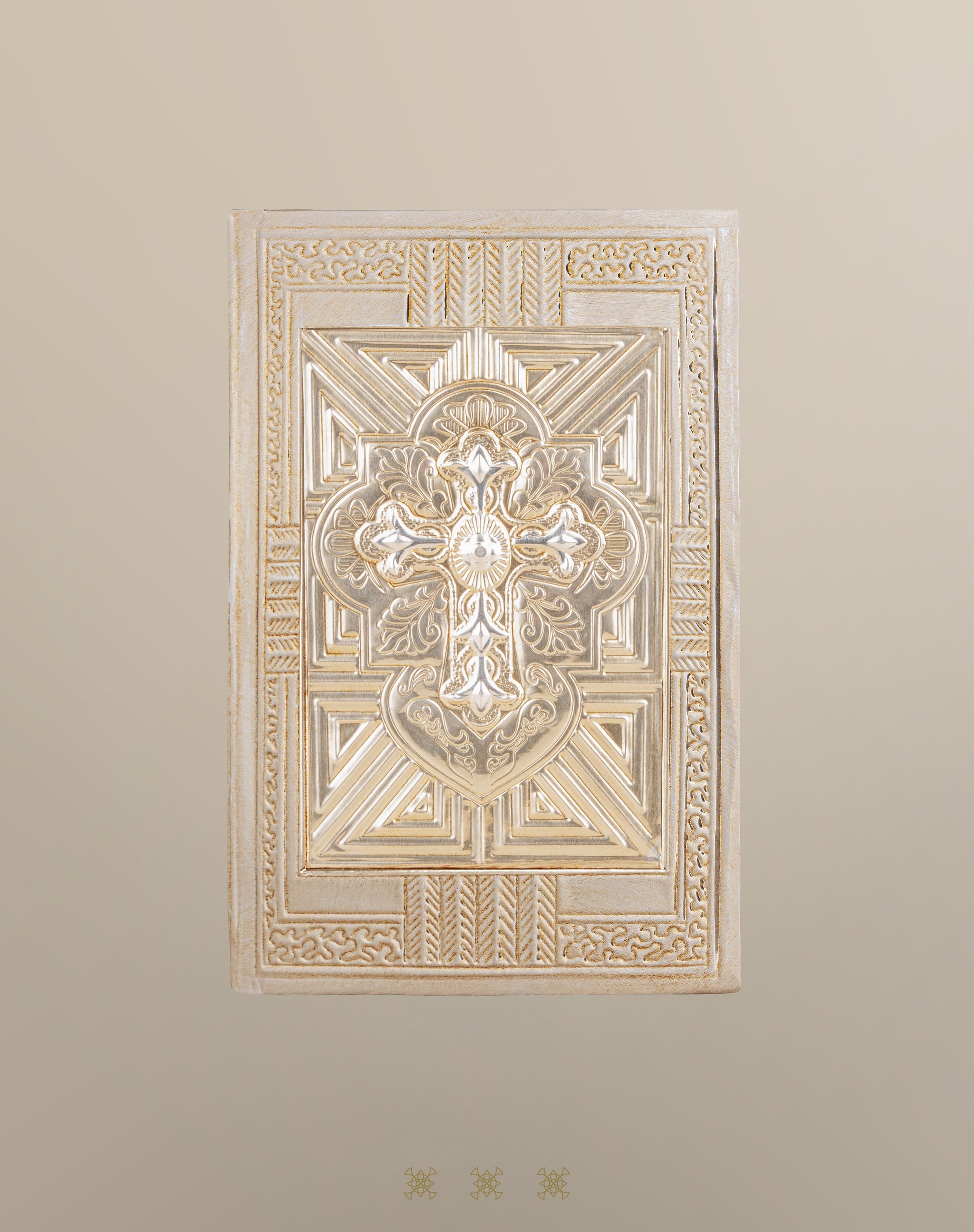 Biblia Latinoamericana color dorado forrada con repujado artesanal con imagen de cruz.