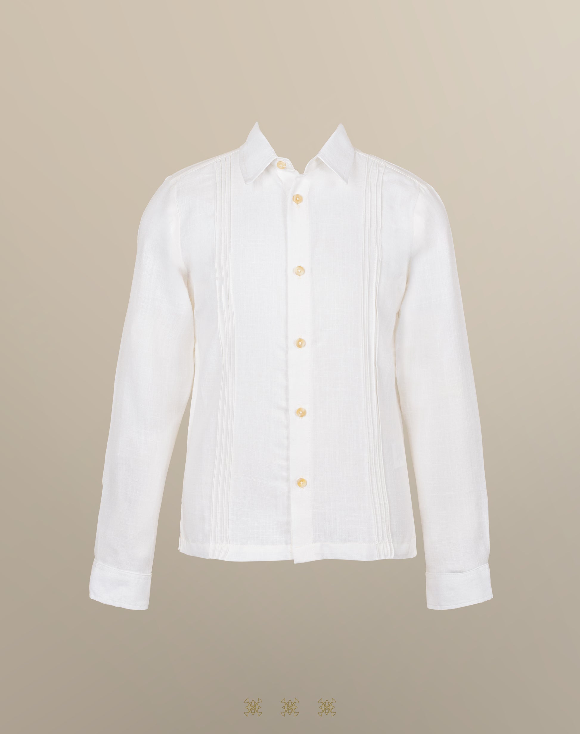 Camisa guayabera color blanca de manga larga, con cierre de botones.