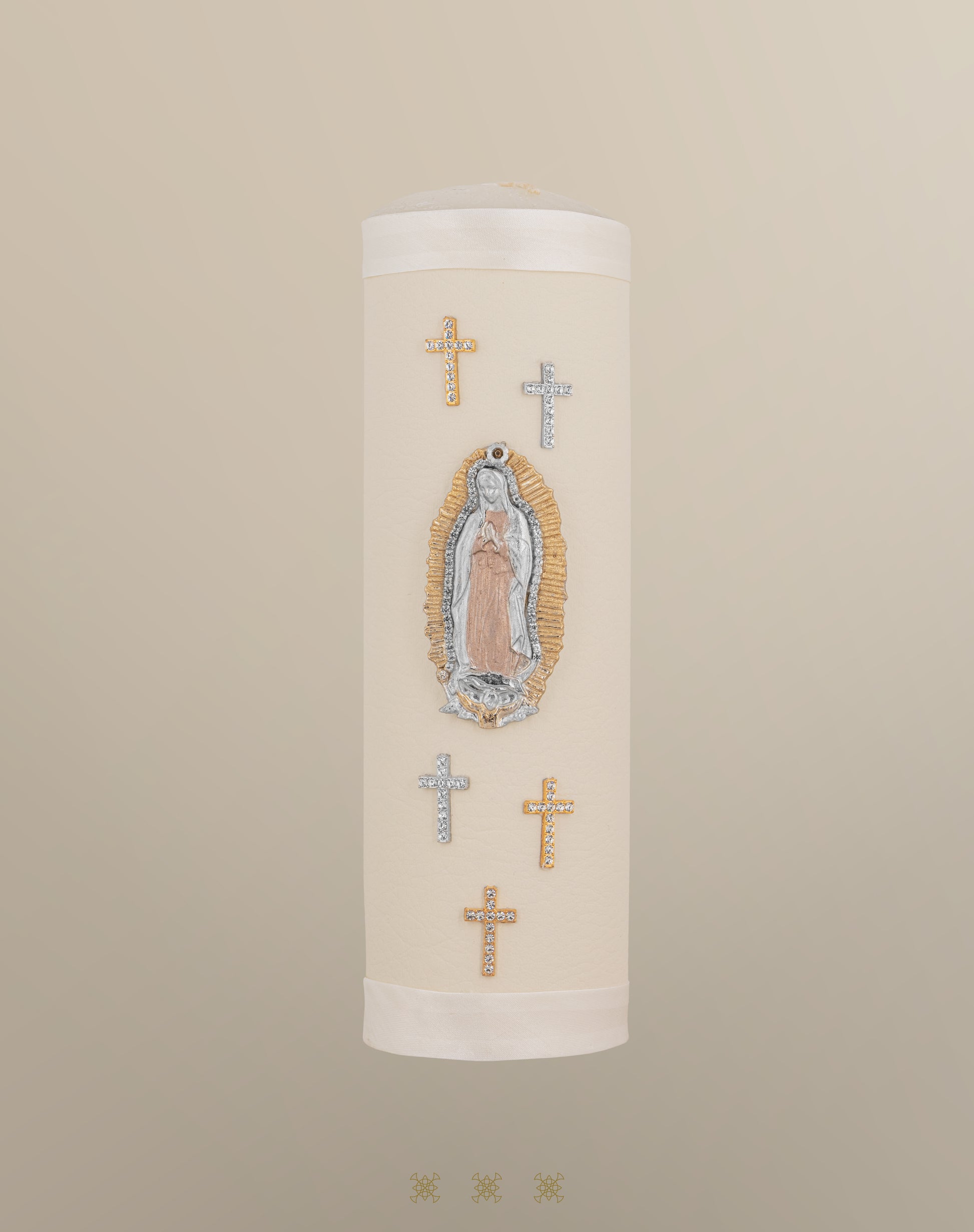 Cirio de boda color hielo forrada de vinipiel con adorno de la Virgen de Guadalupe y 5 cruces metálicas con detalles brillantes, aplicación de listón.