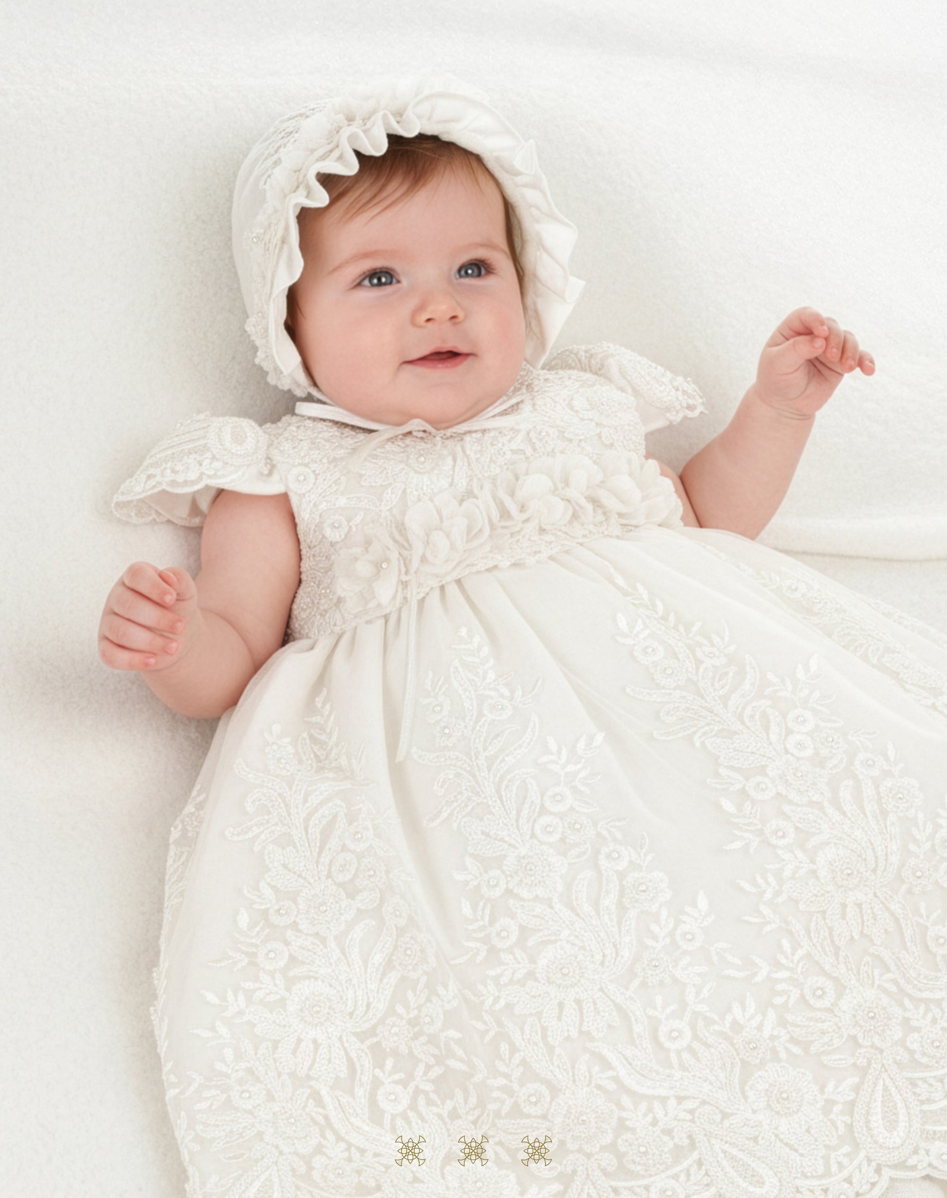 Ropón de bautizo desmontable con gorro color hueso. Con lujoso bordado de pedrería y aplicaciones florales con perlas en peto y falda. Con fajo floral desmontable y gorro con aplicaciones y bordado a juego.