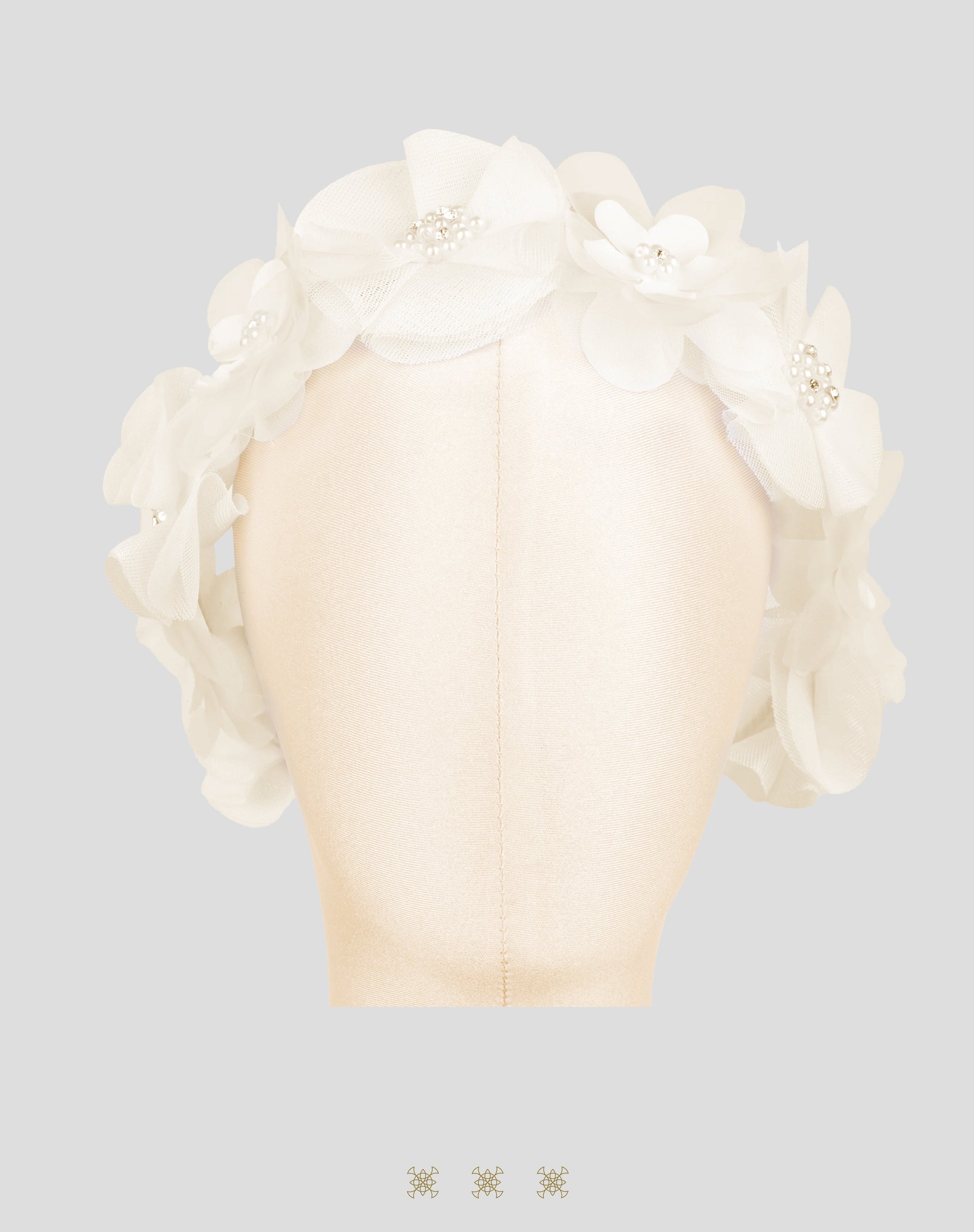 Corona flexible de flores artesanales, con aplicaciones de güipiur, Moño de listón de organza en la parte trasera con flor al centro, color blanco.