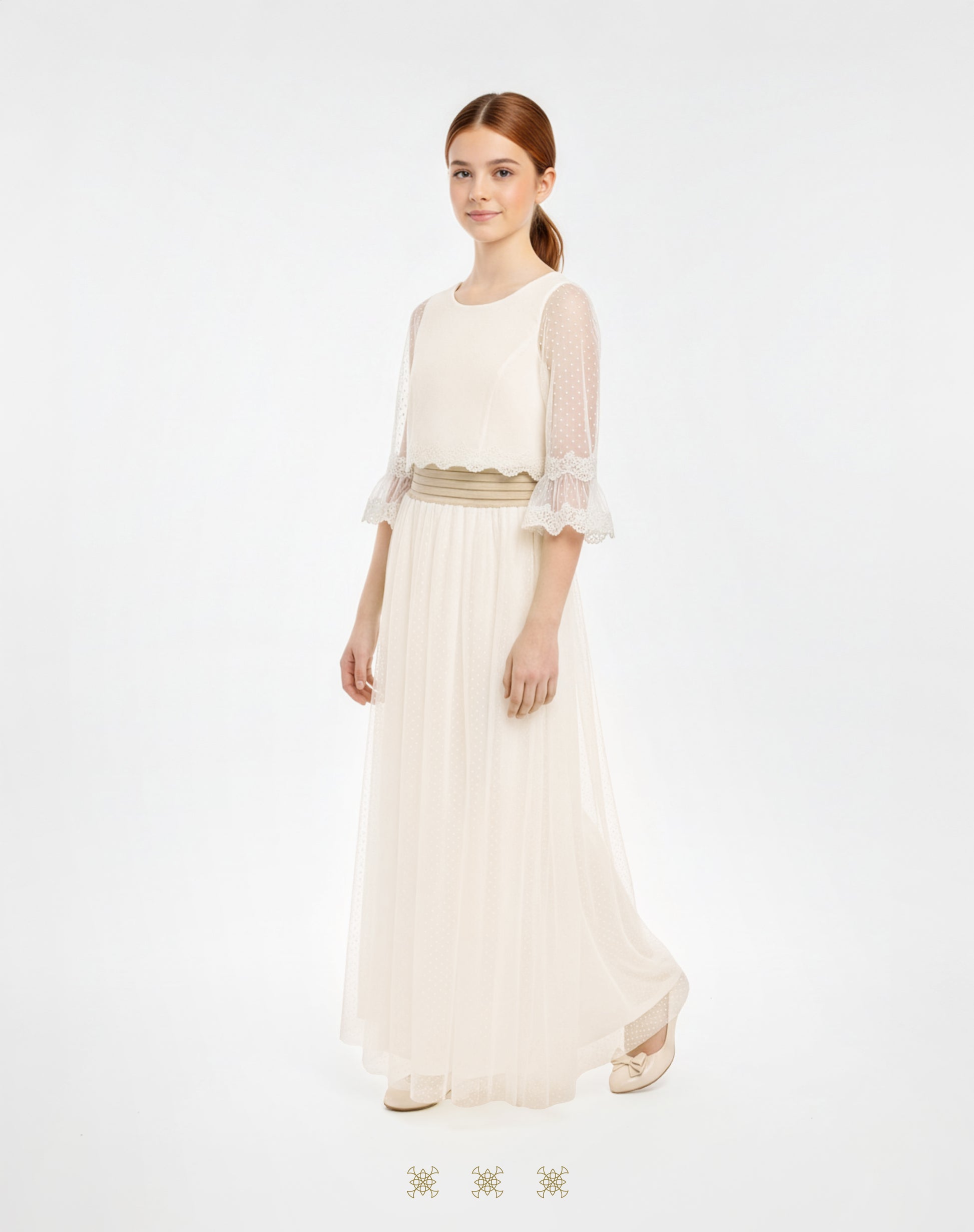 Crop top con falda color hueso en tela polishangtu. Capa superior de mesh con sutil patrón de puntos. Mangas tipo boho 3/4 de tul con acabado en encaje. Diseño tipo crop top que permite libertad de movimiento con apariencia formal y delicada.