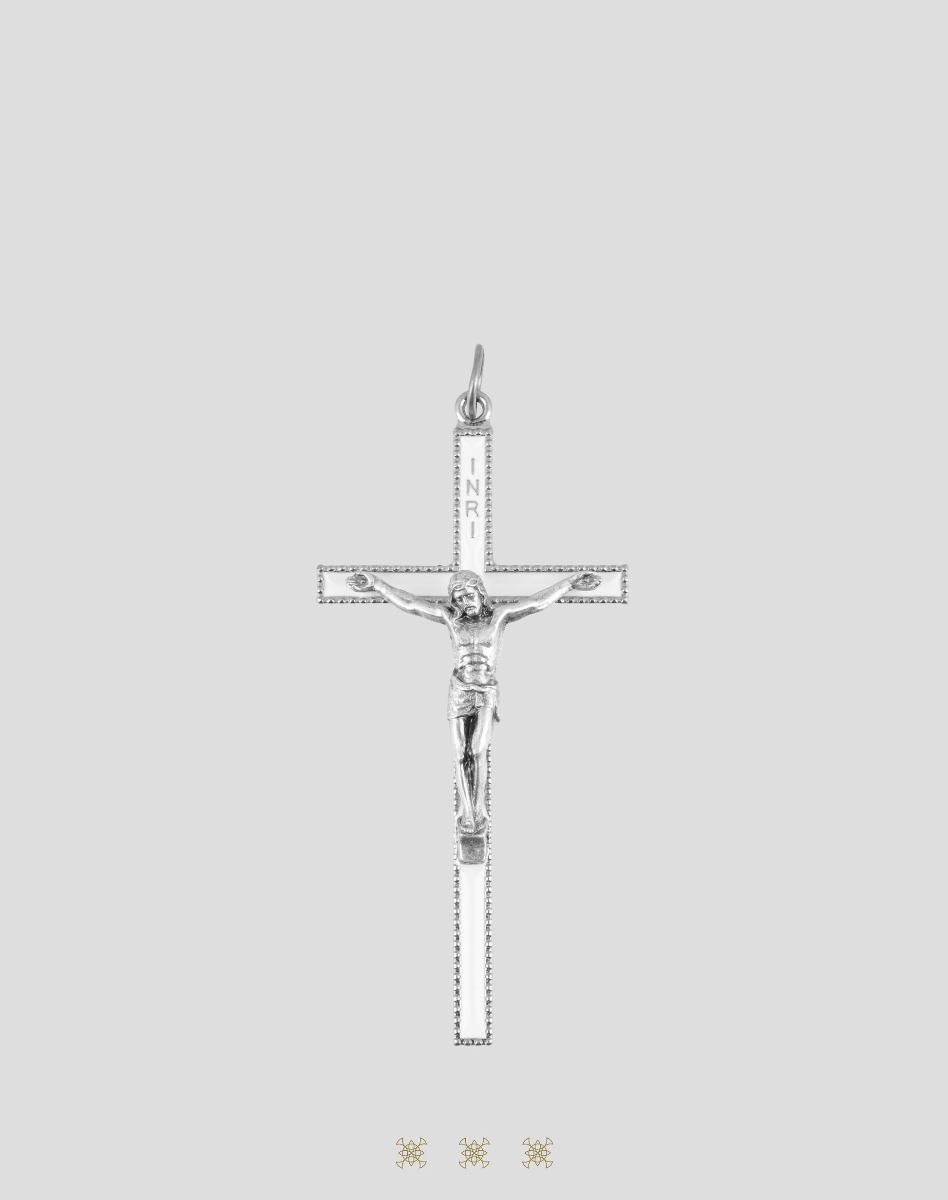 Colgante de Cruz con imagen de Jesucristo color plata, para Primera Comunión. Incluye listón blanco para colgar como collar.