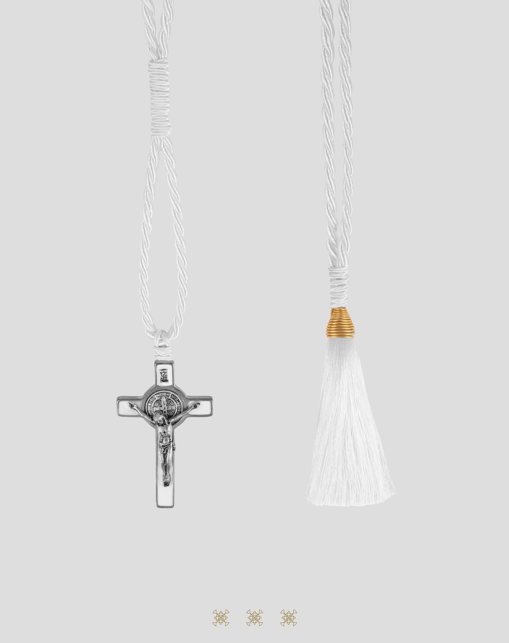 Dogal entrelazado color blanco con cruz color plata, con medalla de San Benito.
