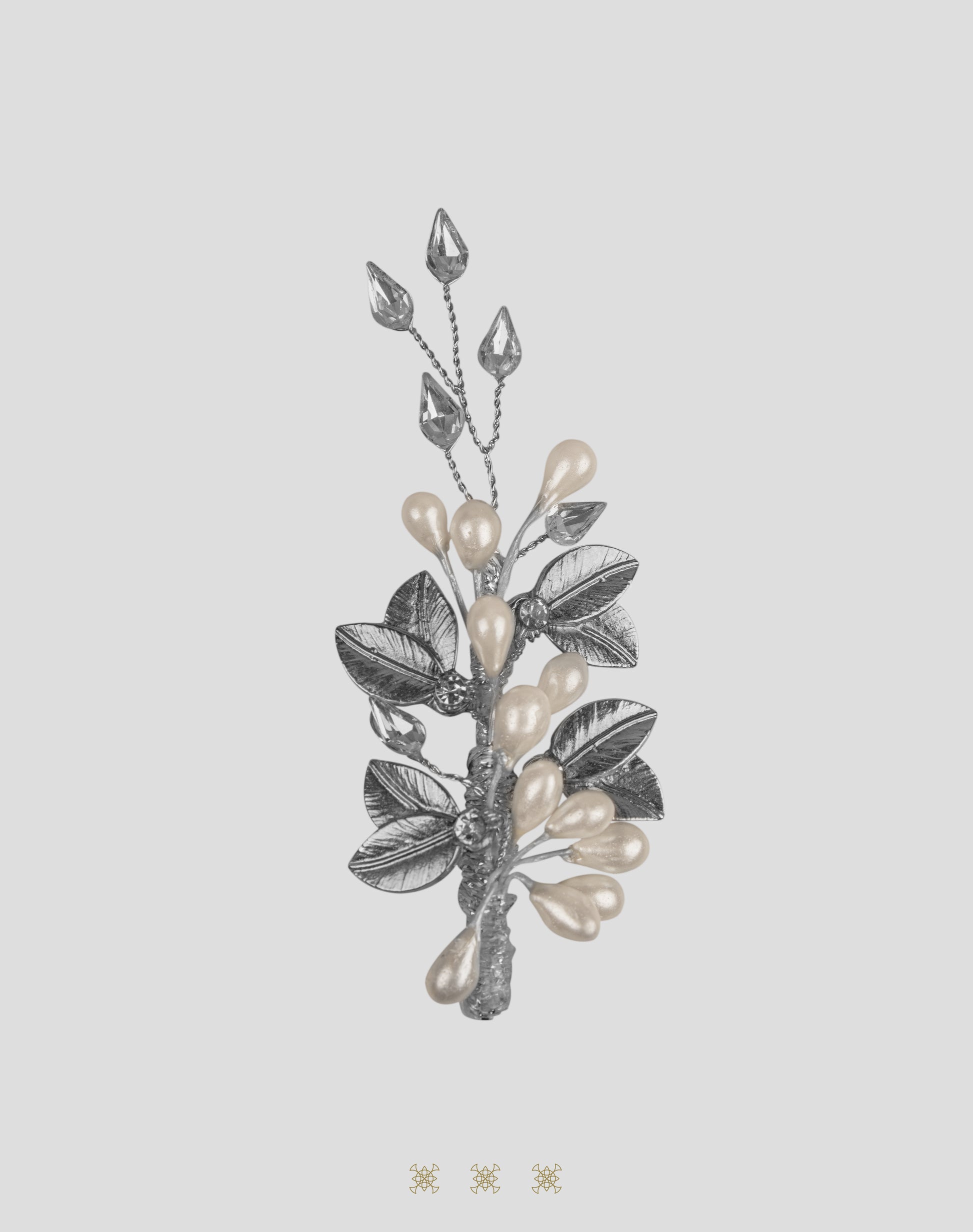 Fistol con aplicaciones de azahares encapsulados y ornamento de hojas color plata con sujeción de pasador.