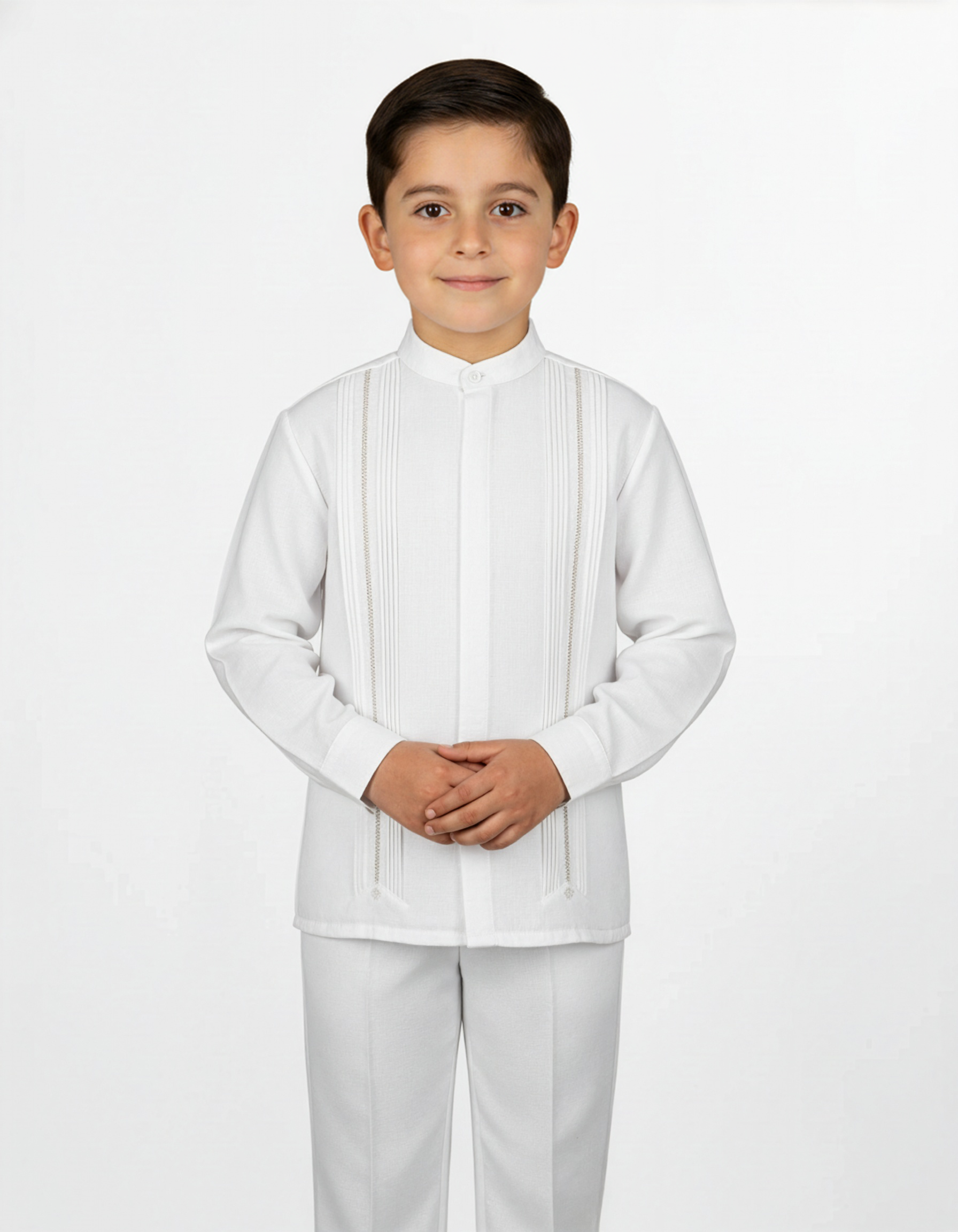 Conjunto de guayabera y pantalón para niño, camisa manga larga color blanco con tira bordada y pantalón liso color blanco con cierre de botón.