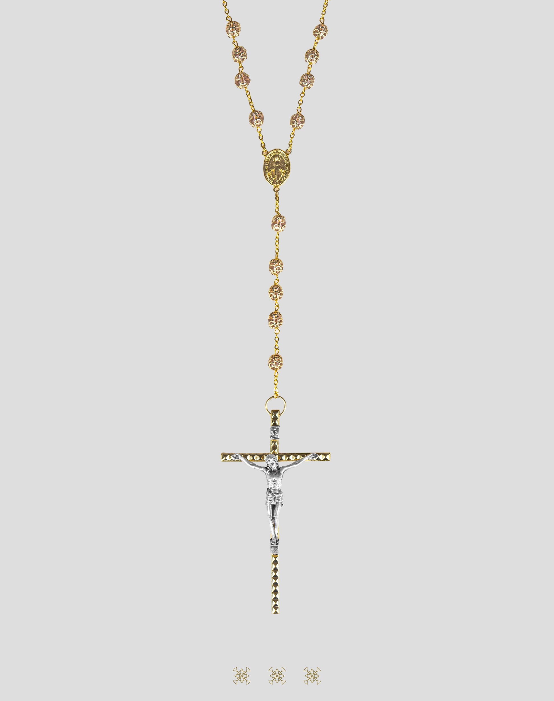 Consta de cuentas doradas con aplicaciones de cristales rosas y crucifijo color dorado.
