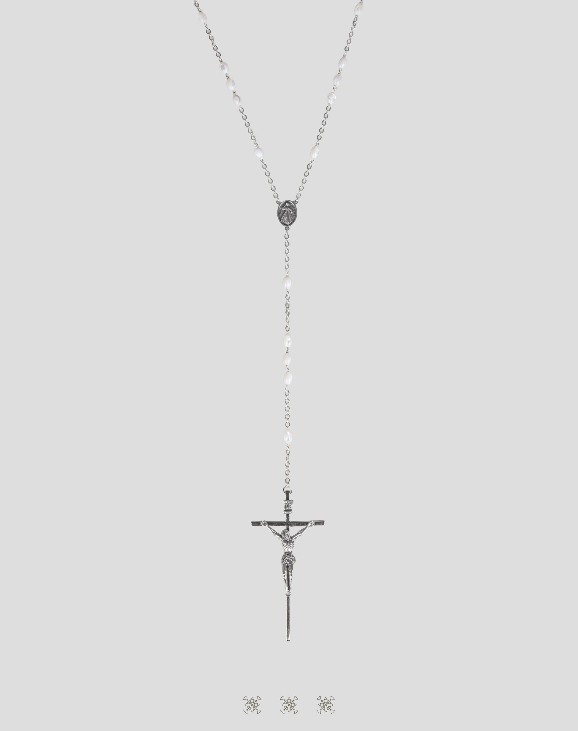 Adornado con cuentas ovaladas blancas y cristo en color plata.