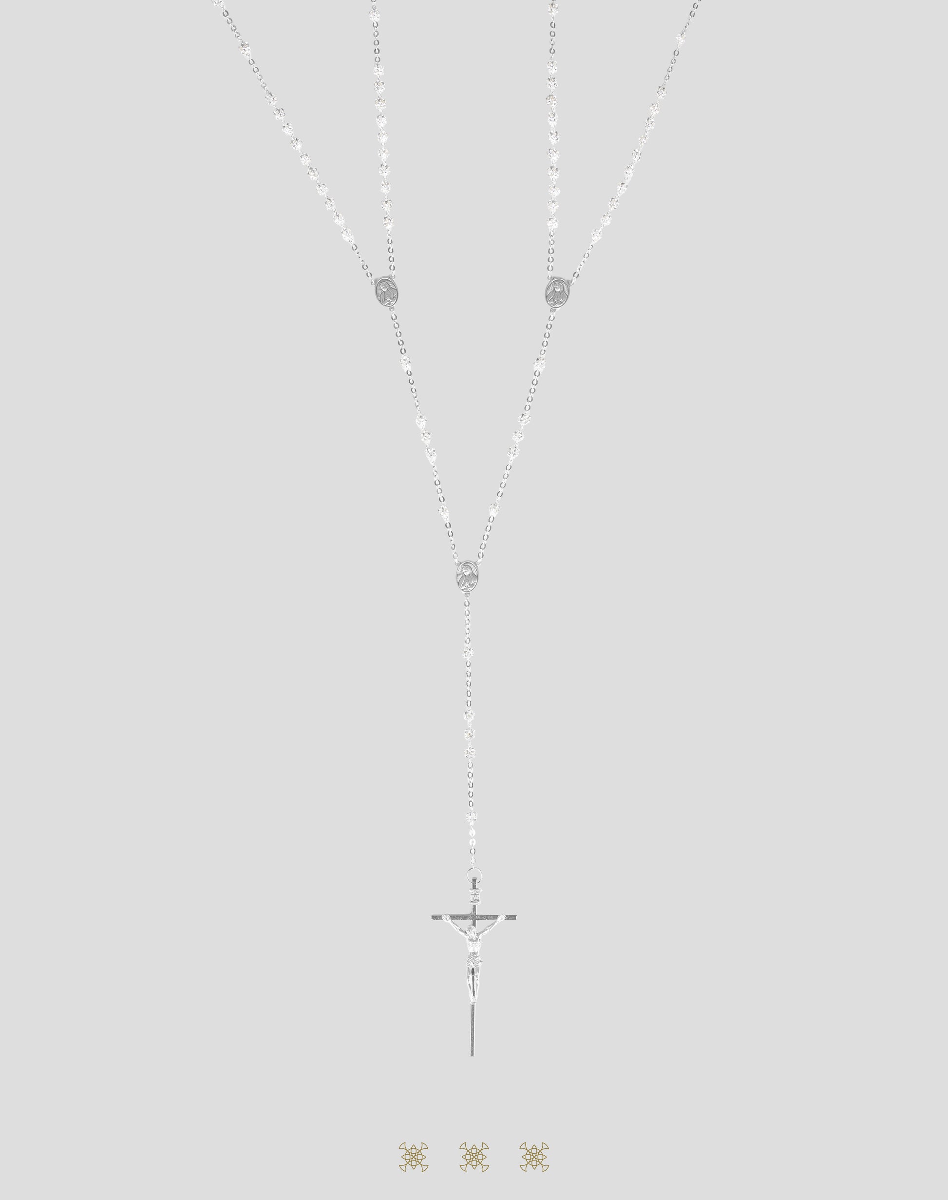 Adornado con cuentas redondas con acabado marmoleado y cristo en color plata.