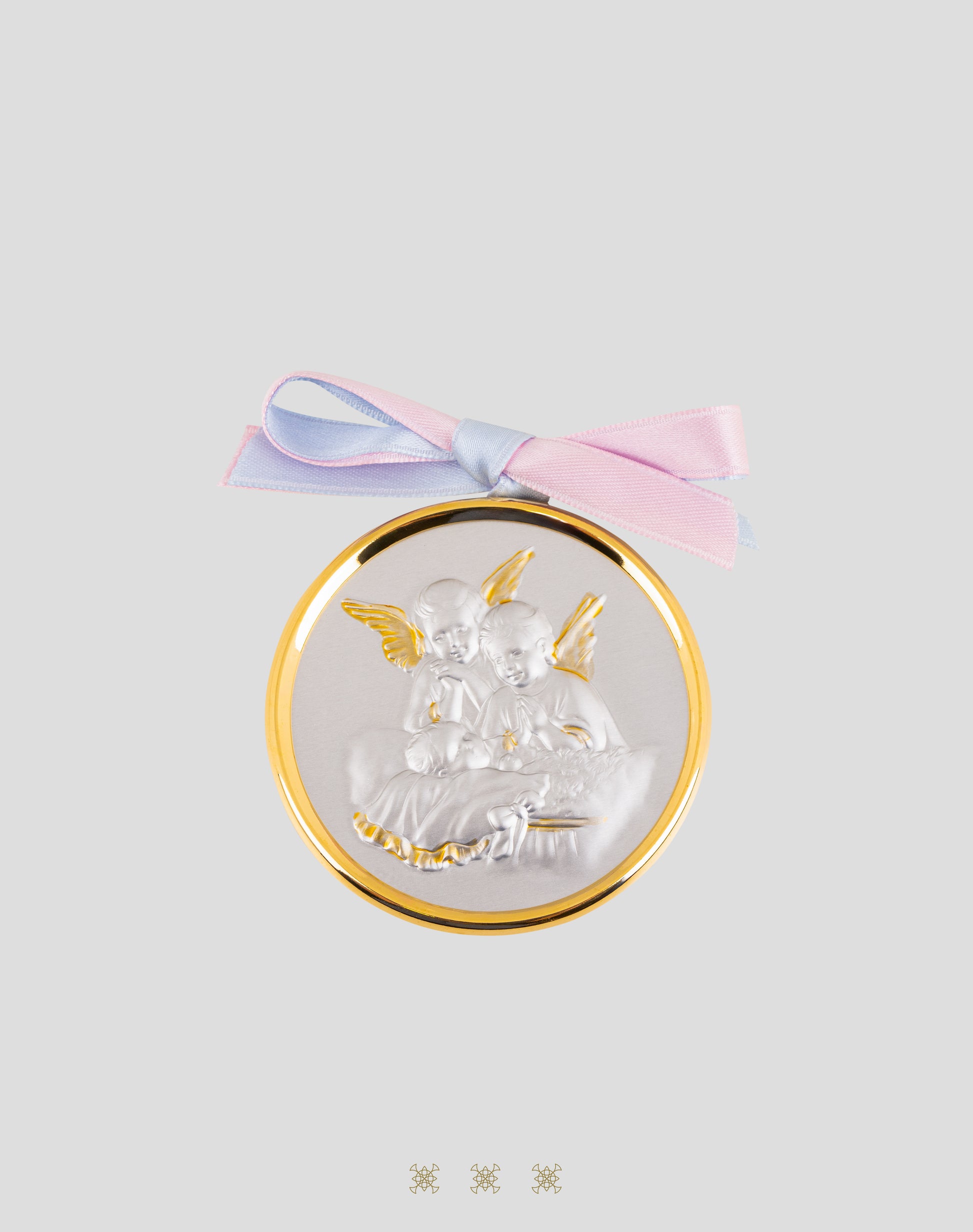 Medalla de cuna de plata con dorde dorado con imagen de ángeles cuidando a un bebé.