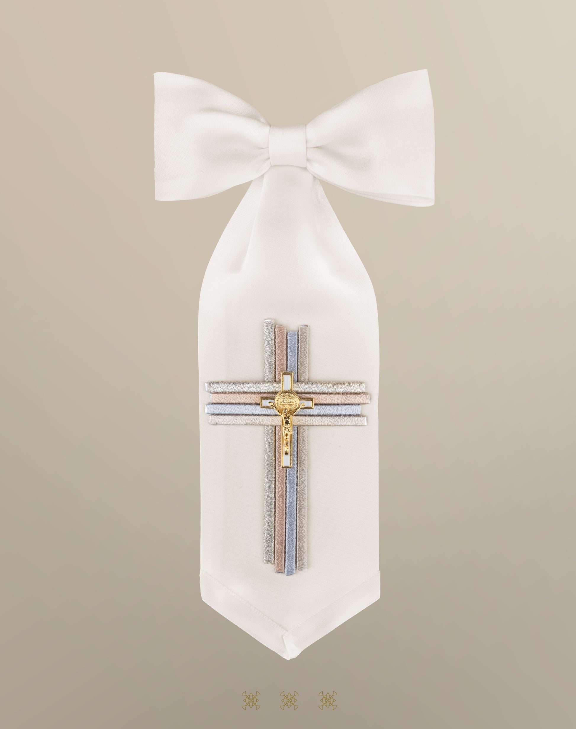 Moño distintivo hueso con detalles bordados y crucifijo color plata.