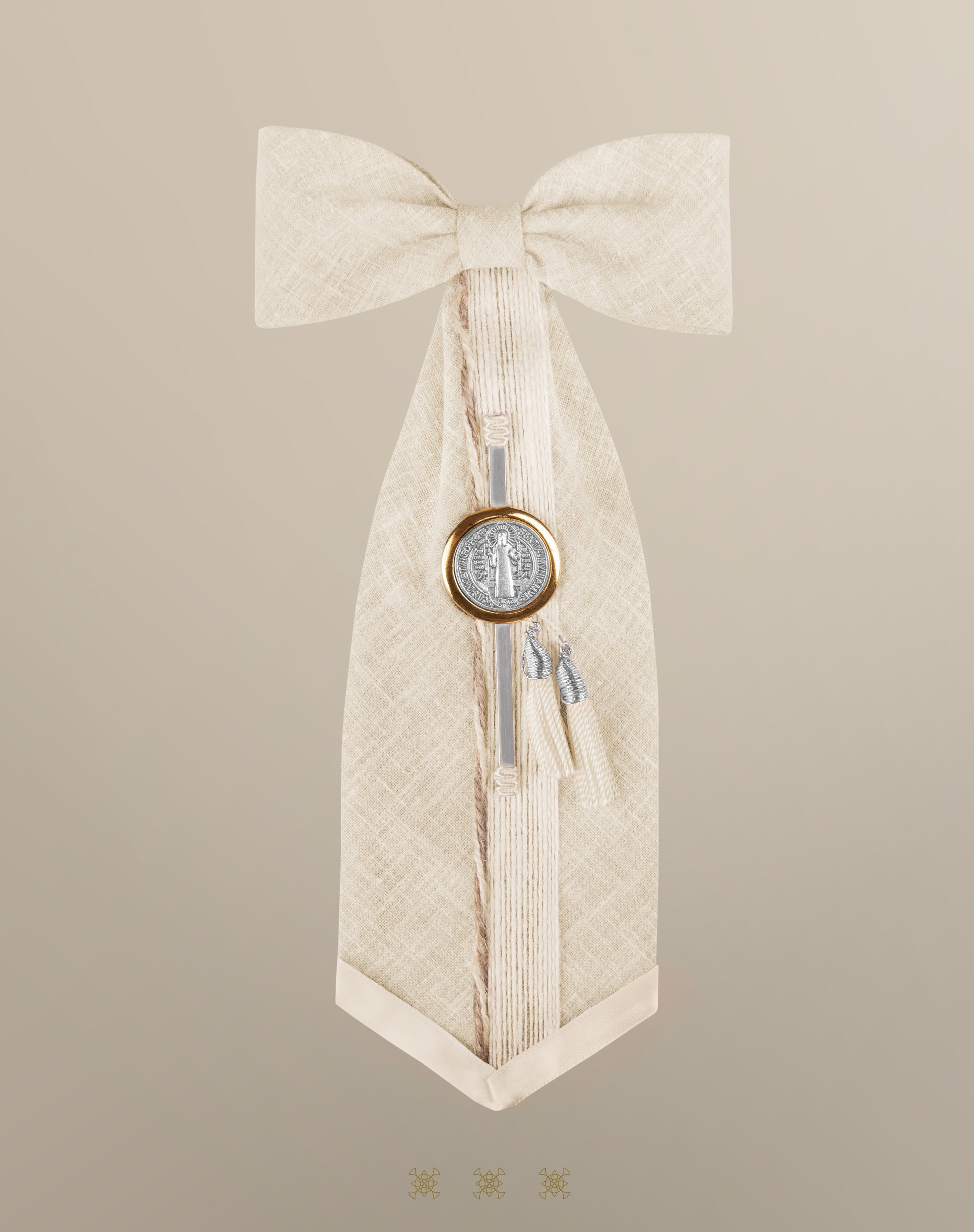 Moño distintivo beige con broche con bordados y medalla de San Benito dorada con plateado.