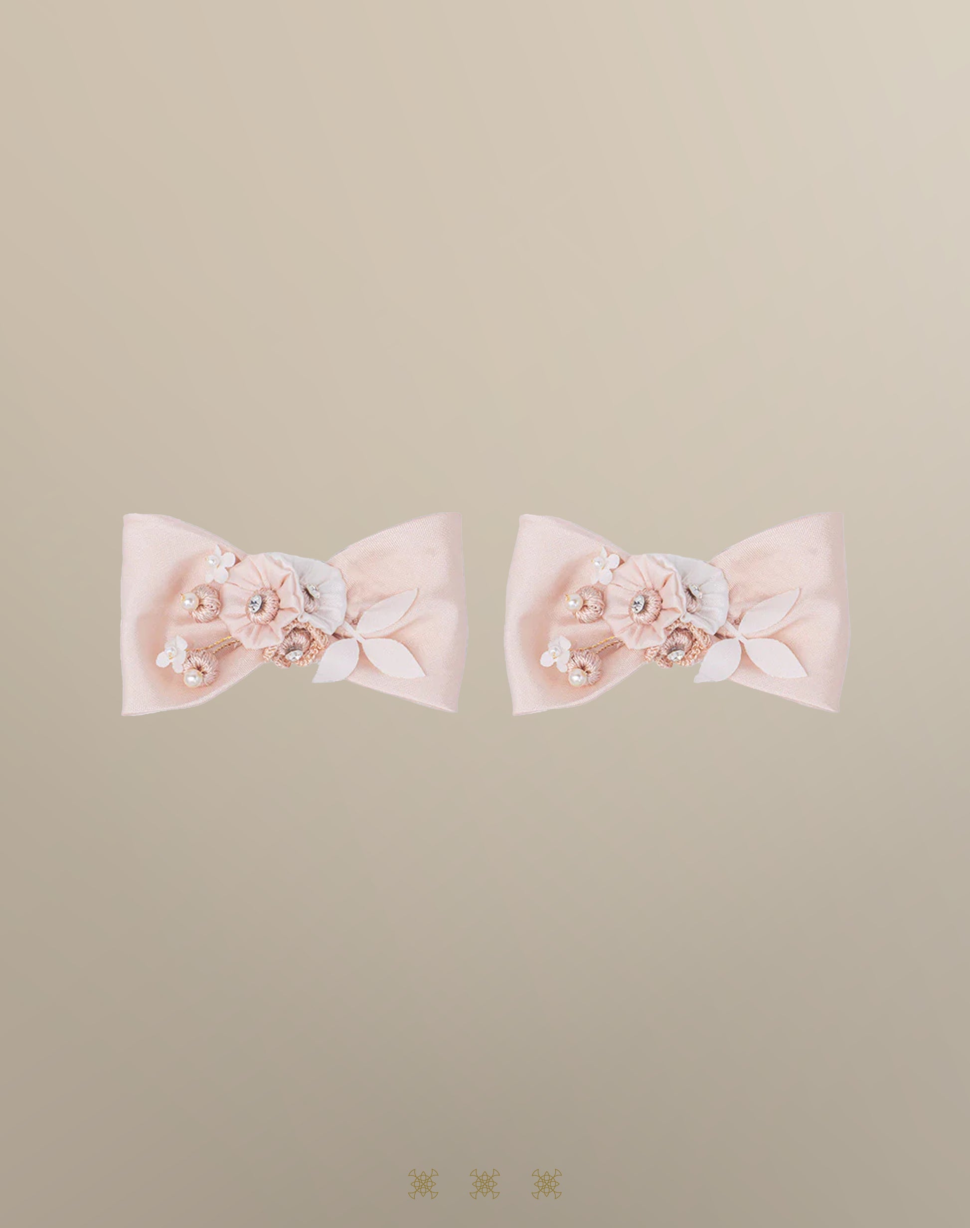 Par de moños para niña con flores artesanales con pequeñas perlas y cristales, color rosa.