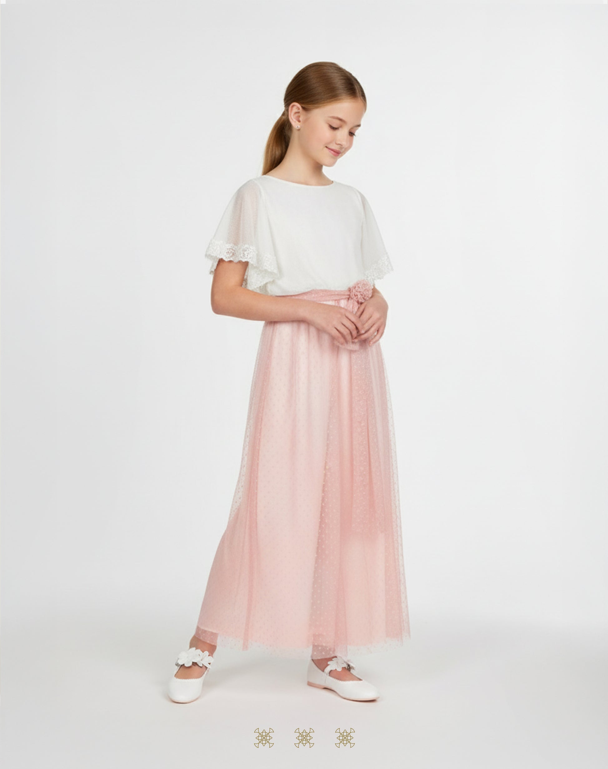Palazzo color hueso con pantalón palo de rosa en tela polishangtu. Capa superior de mesh con sutil patrón de puntos. Mangas cortas de tul con acabado en encaje. Incluye flor decorativa en la cintura. Diseño tipo palazzo que permite libertad de movimiento con apariencia formal y delicada.