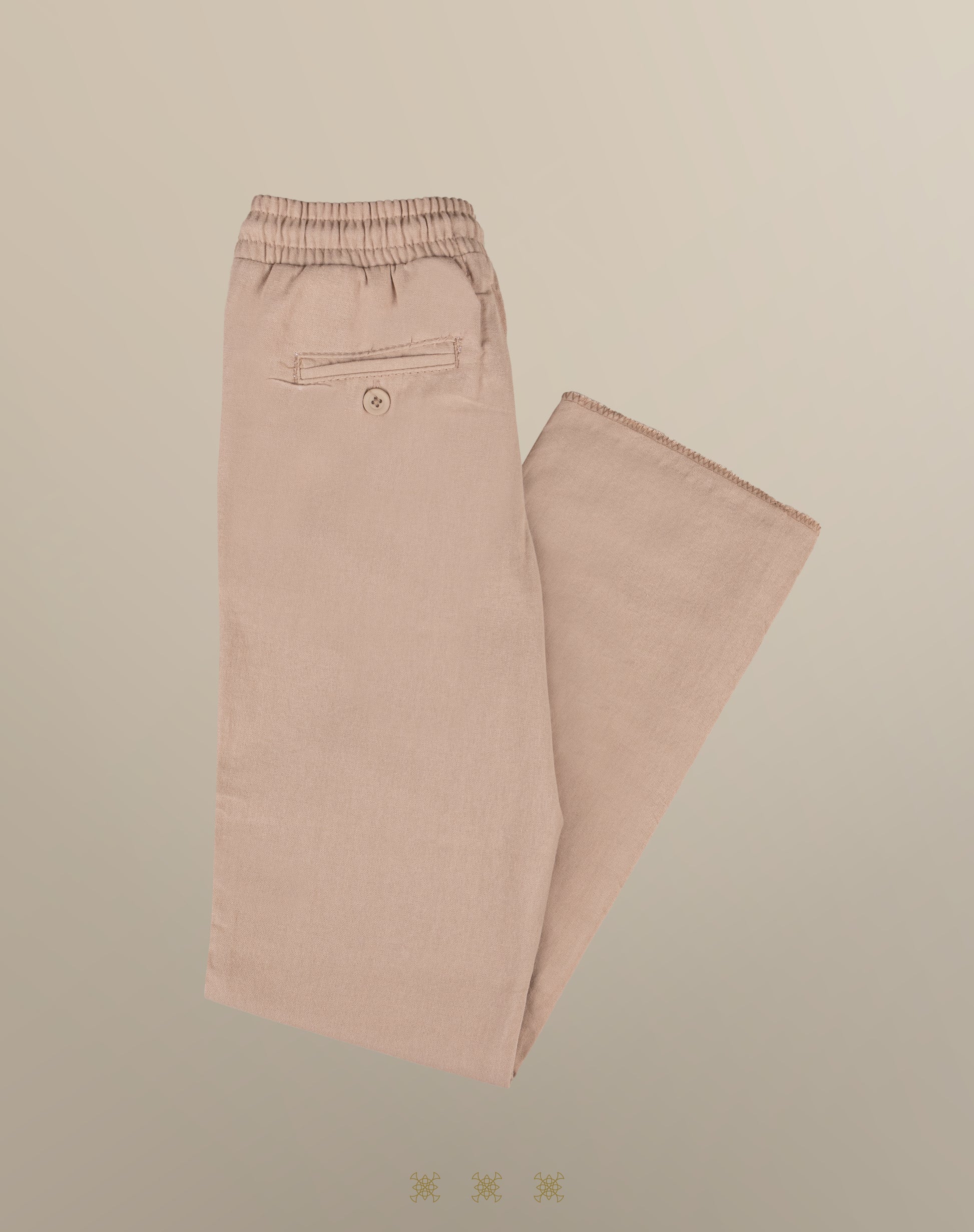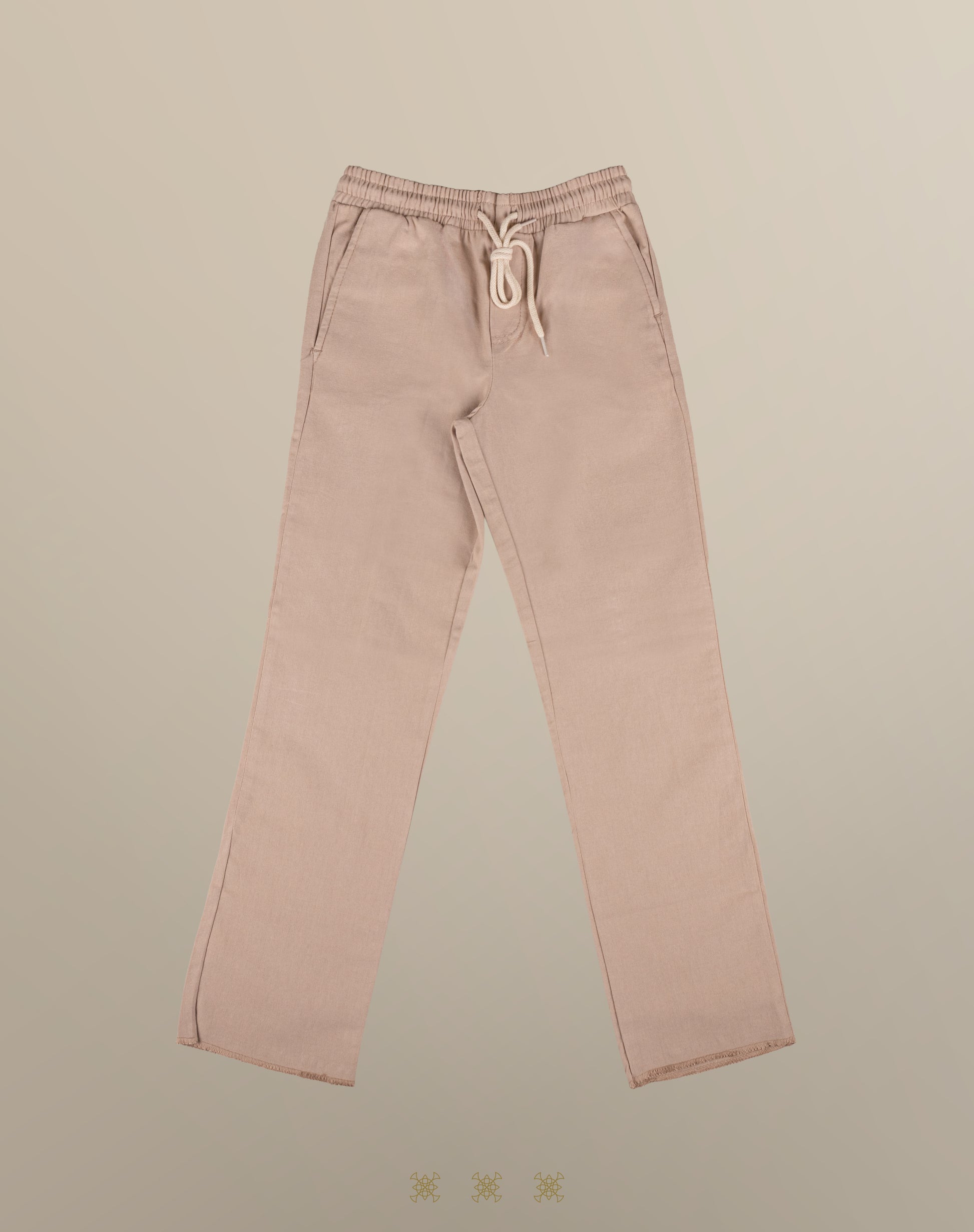Pantalón de lino color kaki con resorte, cordón para mejor ajuste y con bolsas a los costados y en la parte de atrás.