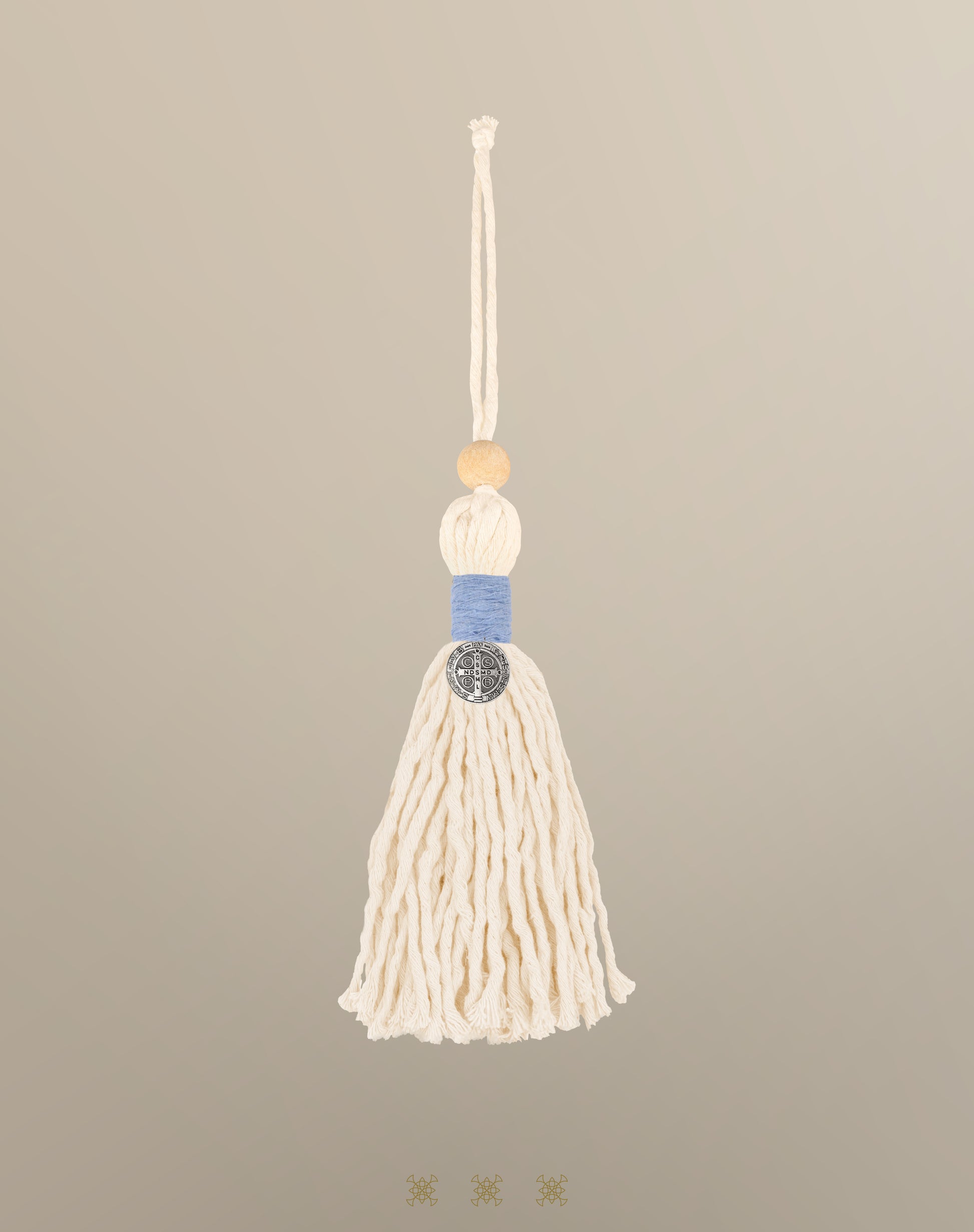 Bendición borla color hueso y azul con medalla de San Benito color plata.