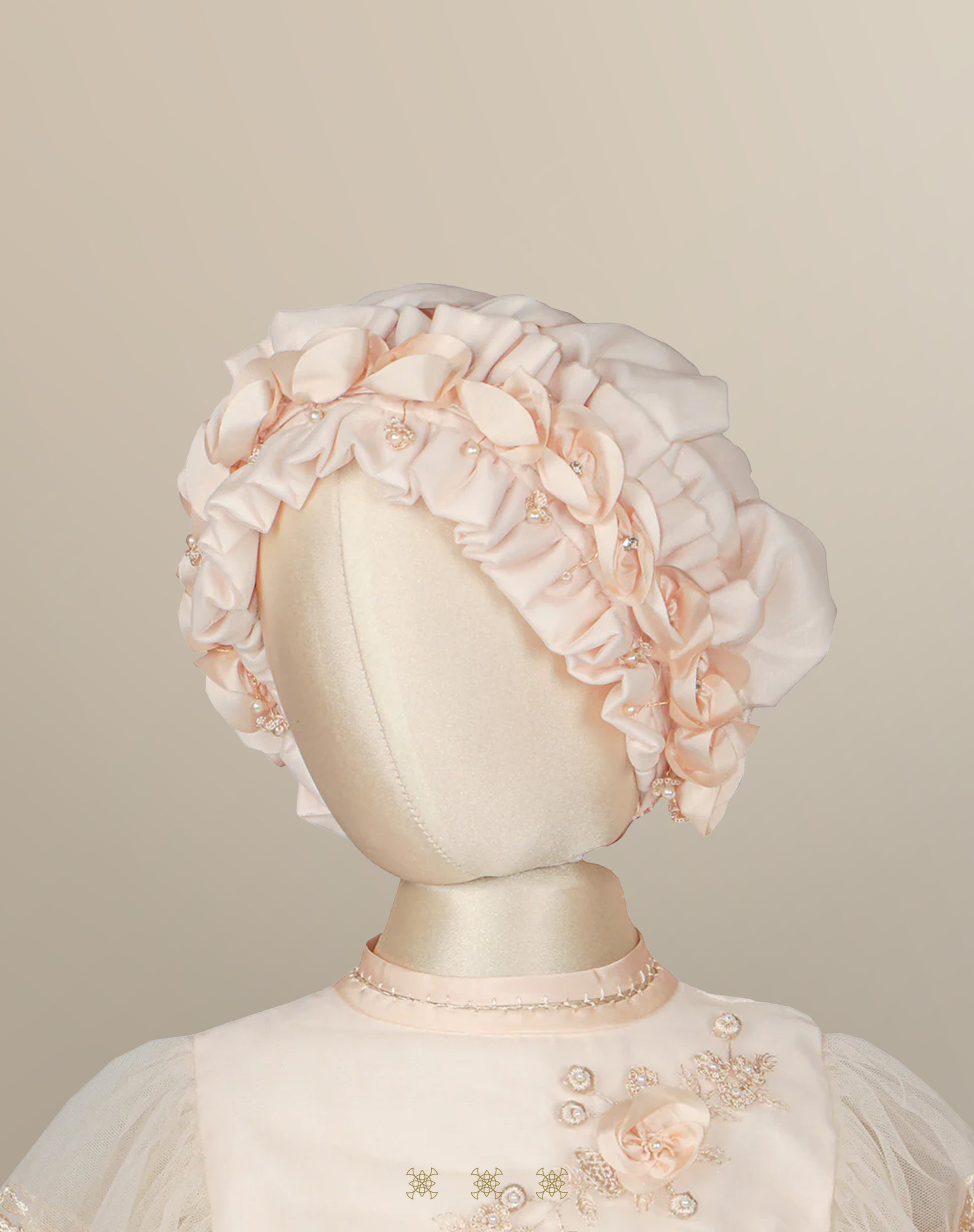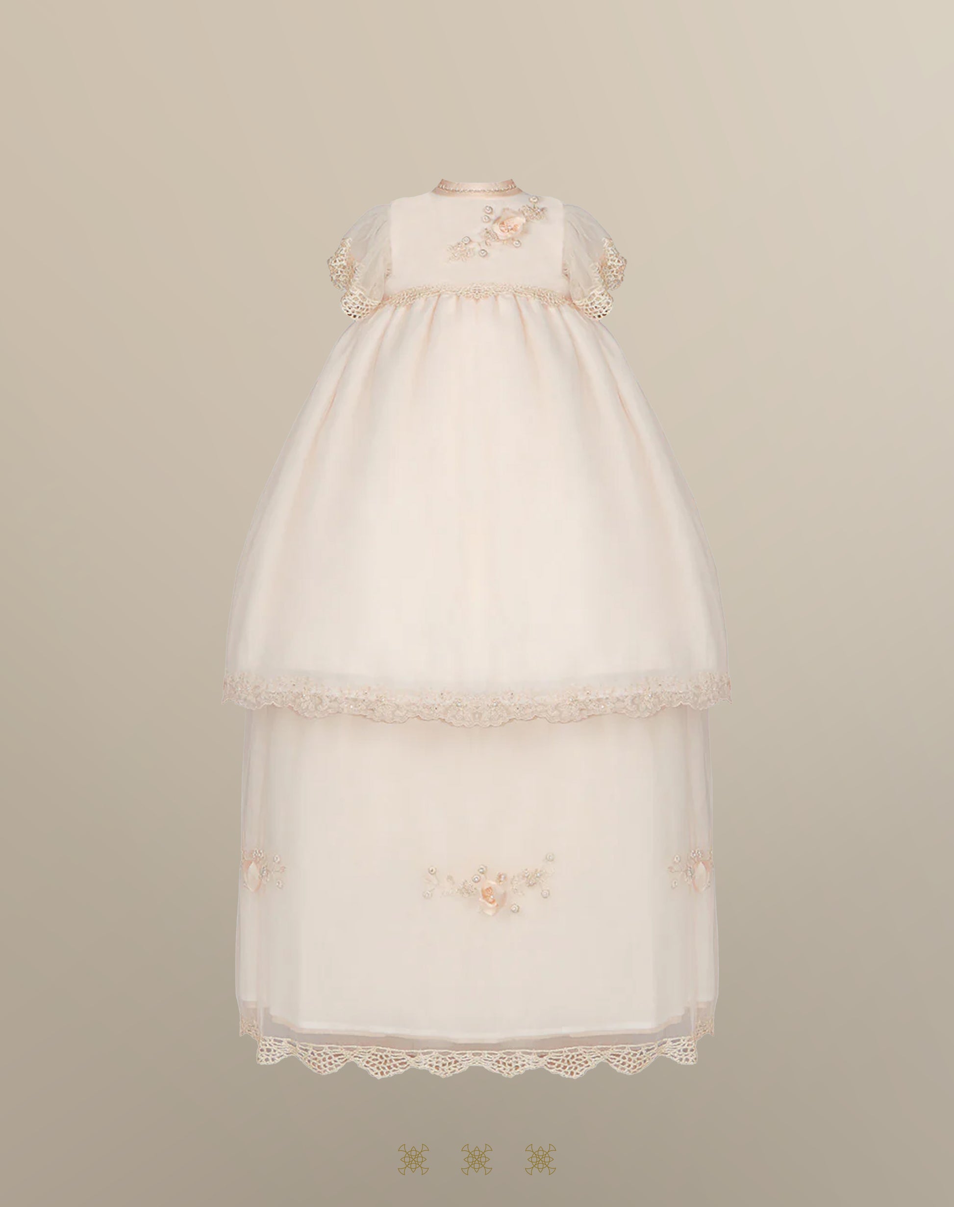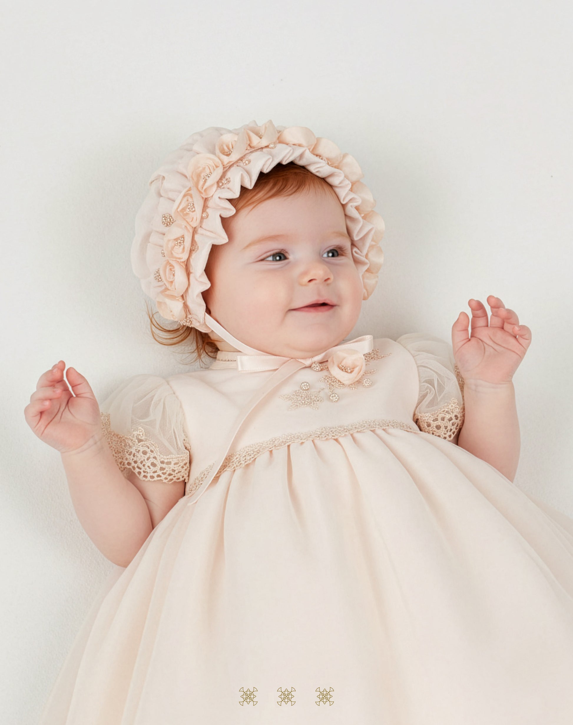 Este ropón desmontable artesanal. Capa de fino, peto con detalle floral bordado a mano con aplicación de flor artesanal y perlas, mangas de holán. Ribete inferior con encaje bordado y detalles de pedrería. Faldón largo y gorrito con bordado a juego.