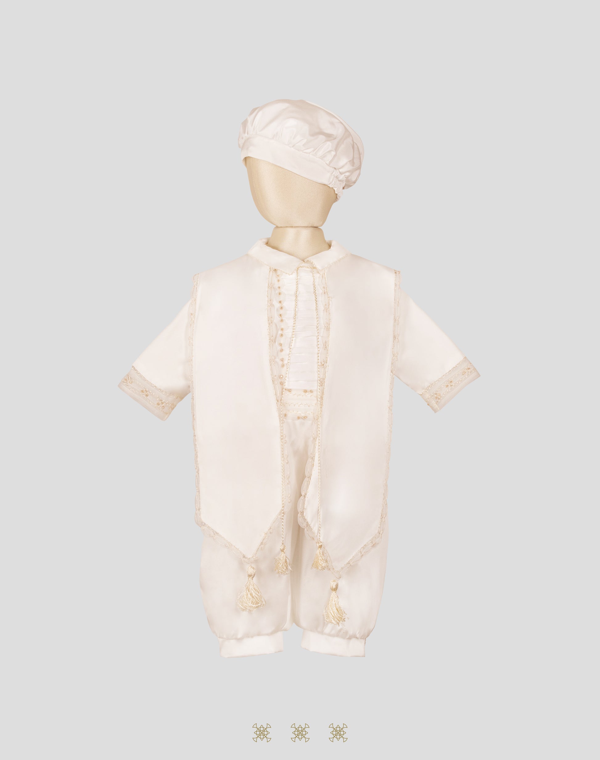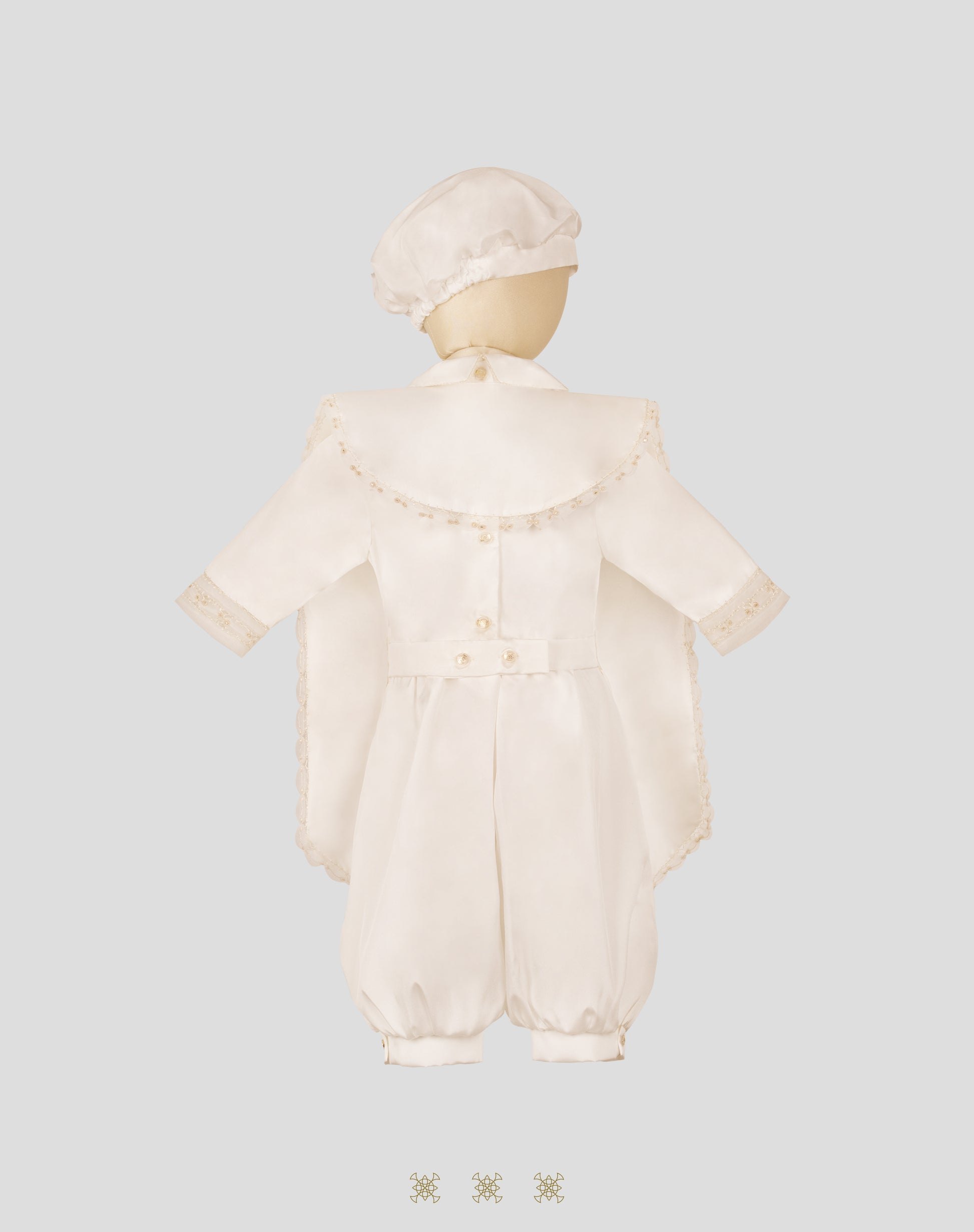 Este ropón "mameluco" con estola es de alta costura completamente artesanal, con una gran calidad y distinción, bordado, deshilado y auténtico gabeado a mano. Parte superior de manga corta con alforzas horizontales y aplicaciones de listón de organza con detalles bordados a mano en el pecho y gabeado en mangas. Pantalón estilo bombacho con detalle de organza ensamblada con gabeado y detalles brillantes bordados en la cintura. Su estola con detalles de organza y gabeado hace que resalte aún más su belleza, incluye gorro con detalles bordados a juego.