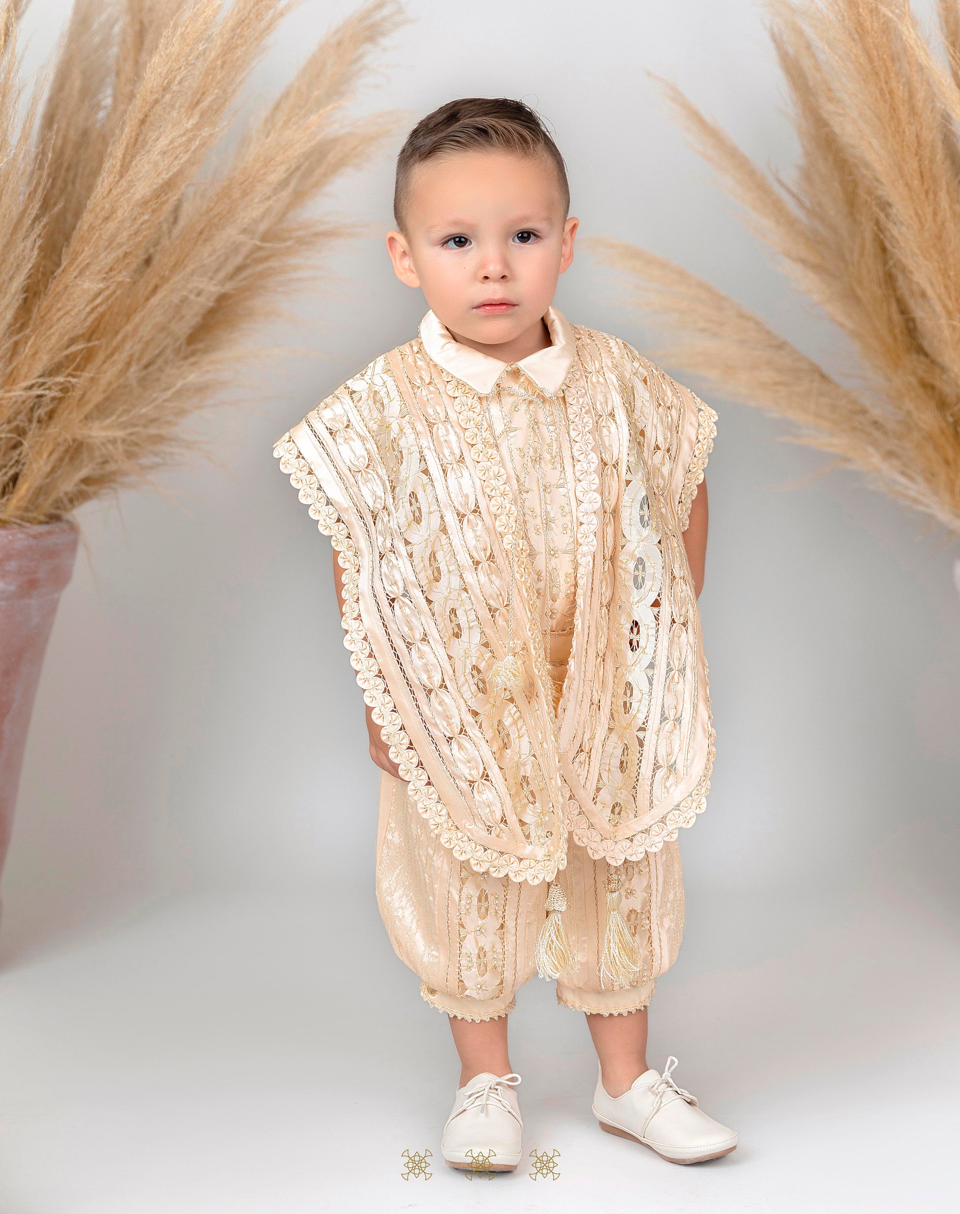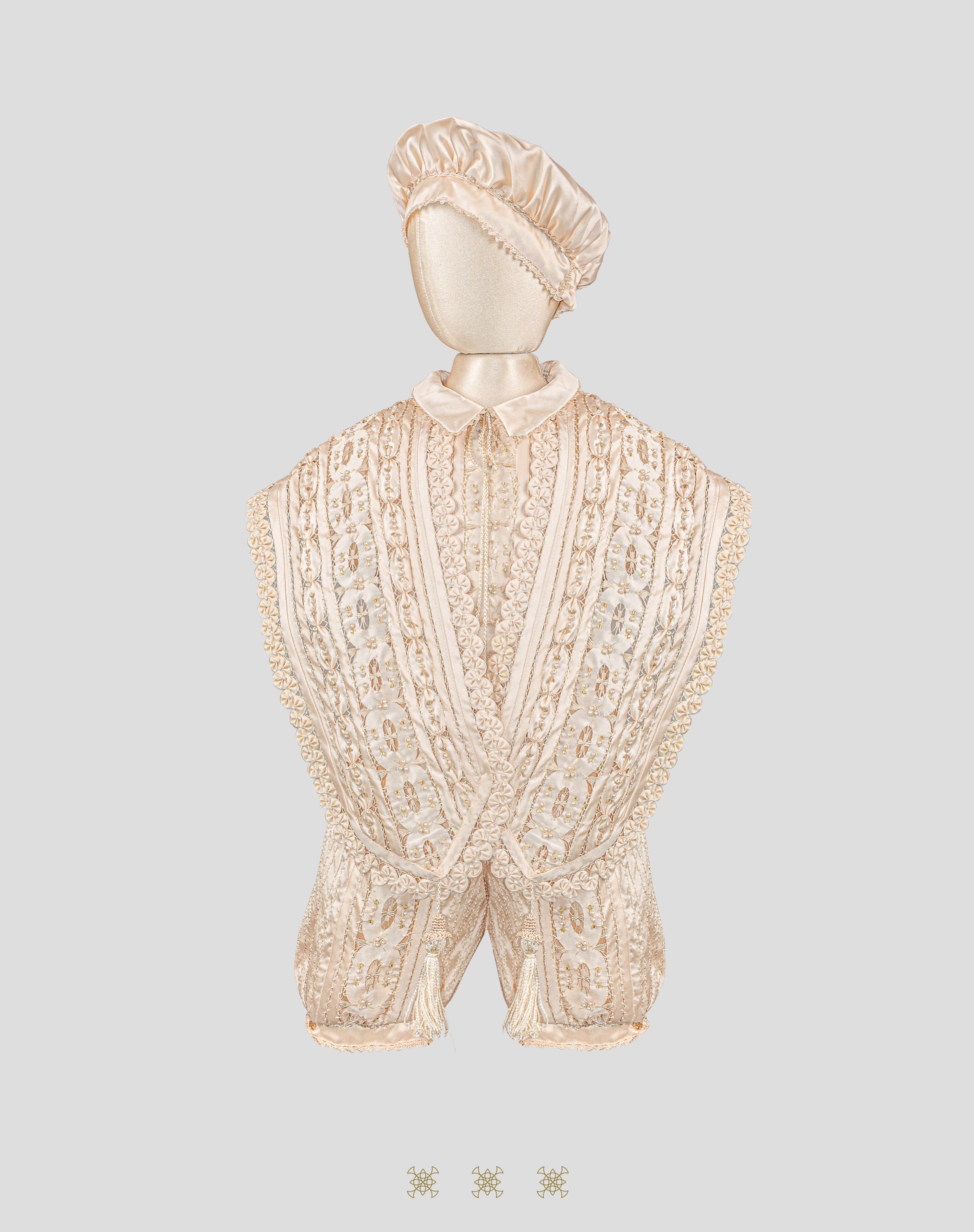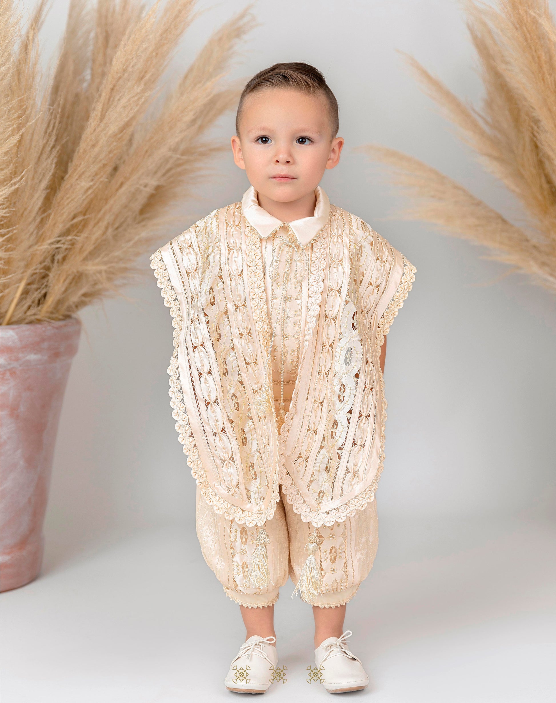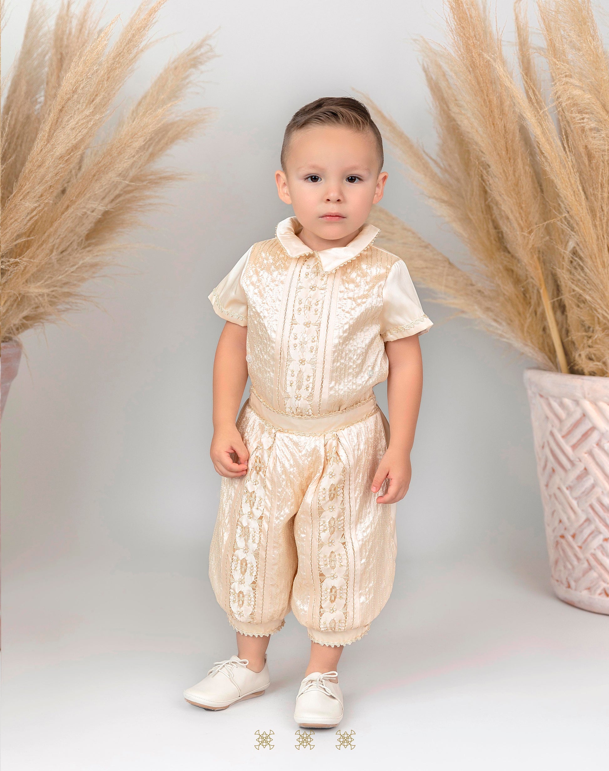 Camisa de manga corta con peto gabeado a mano con discretos bordados con perlas, hecho también a mano. Pantalón bombacho con detalles gabeados y bordados al frente. Estola completamente artesanal hecha a mano ensamblada en gabeado con mini perlas bordadas y borlas de seda en extremos.