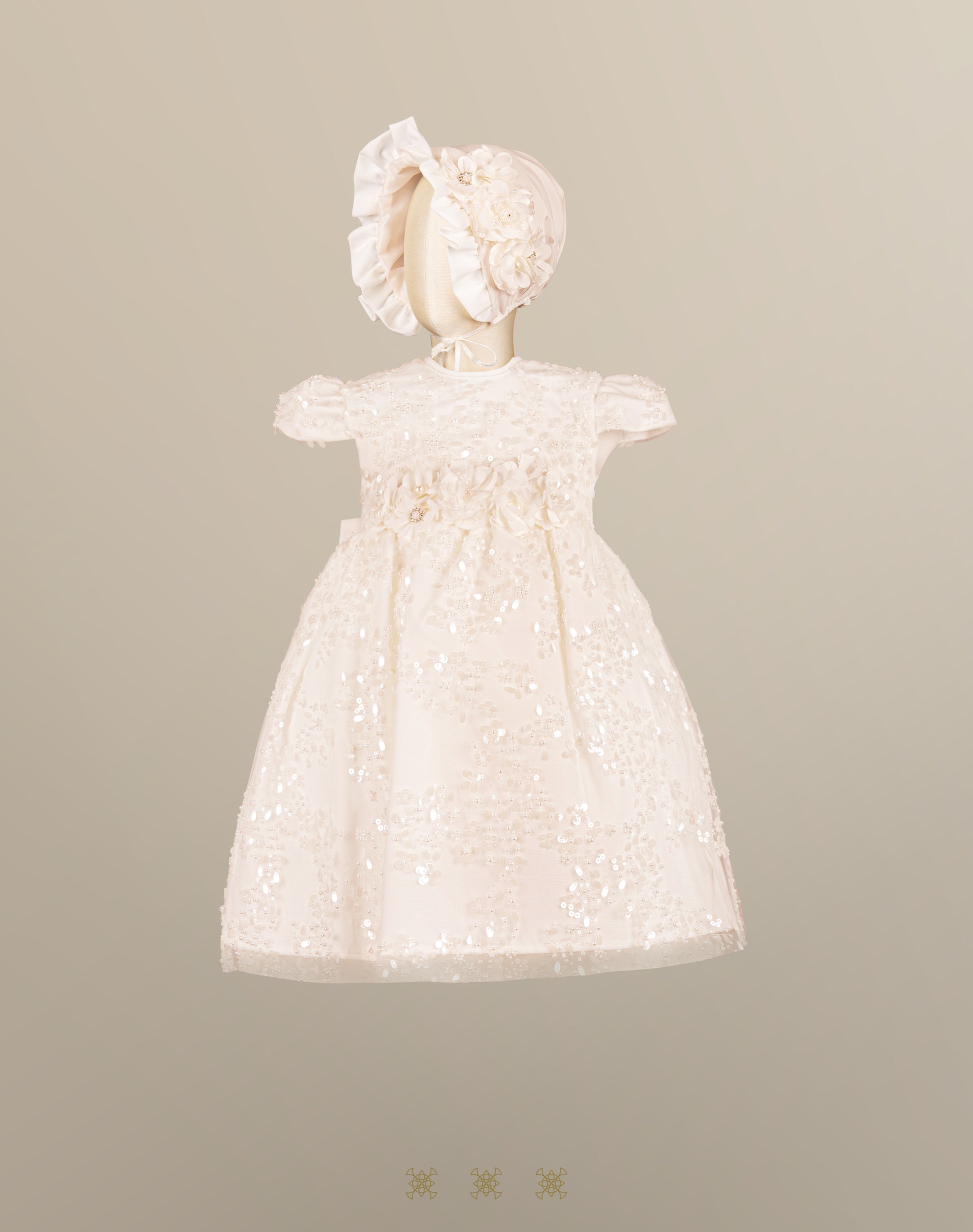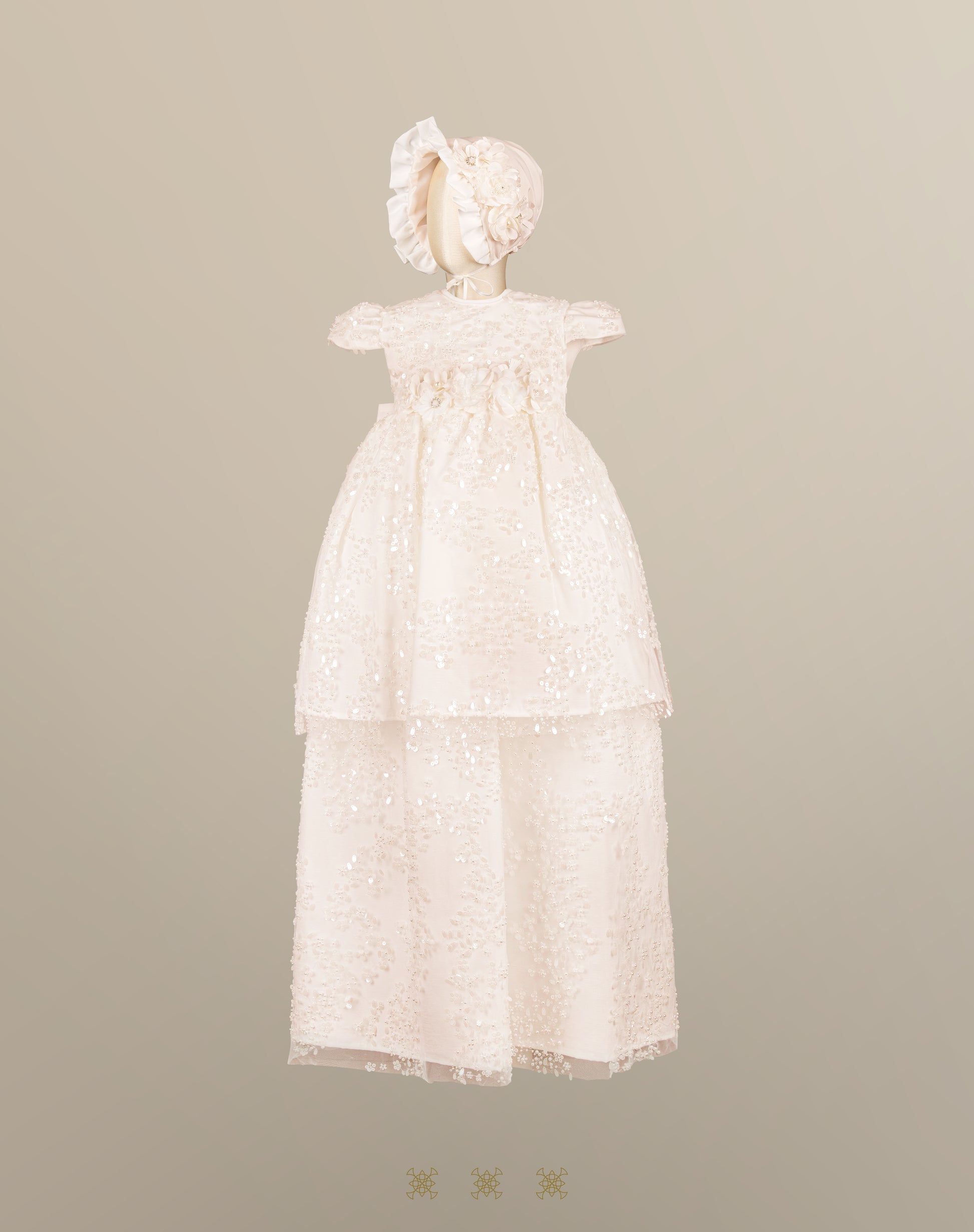 Ropón de bautizo color hueso o durazno, desmontable con delicado bordado floral y detalle de perlas en peto. Fajo desmontable con flores y perlas, fajo en parte posterior para mejor ajuste, Incluye gorro.