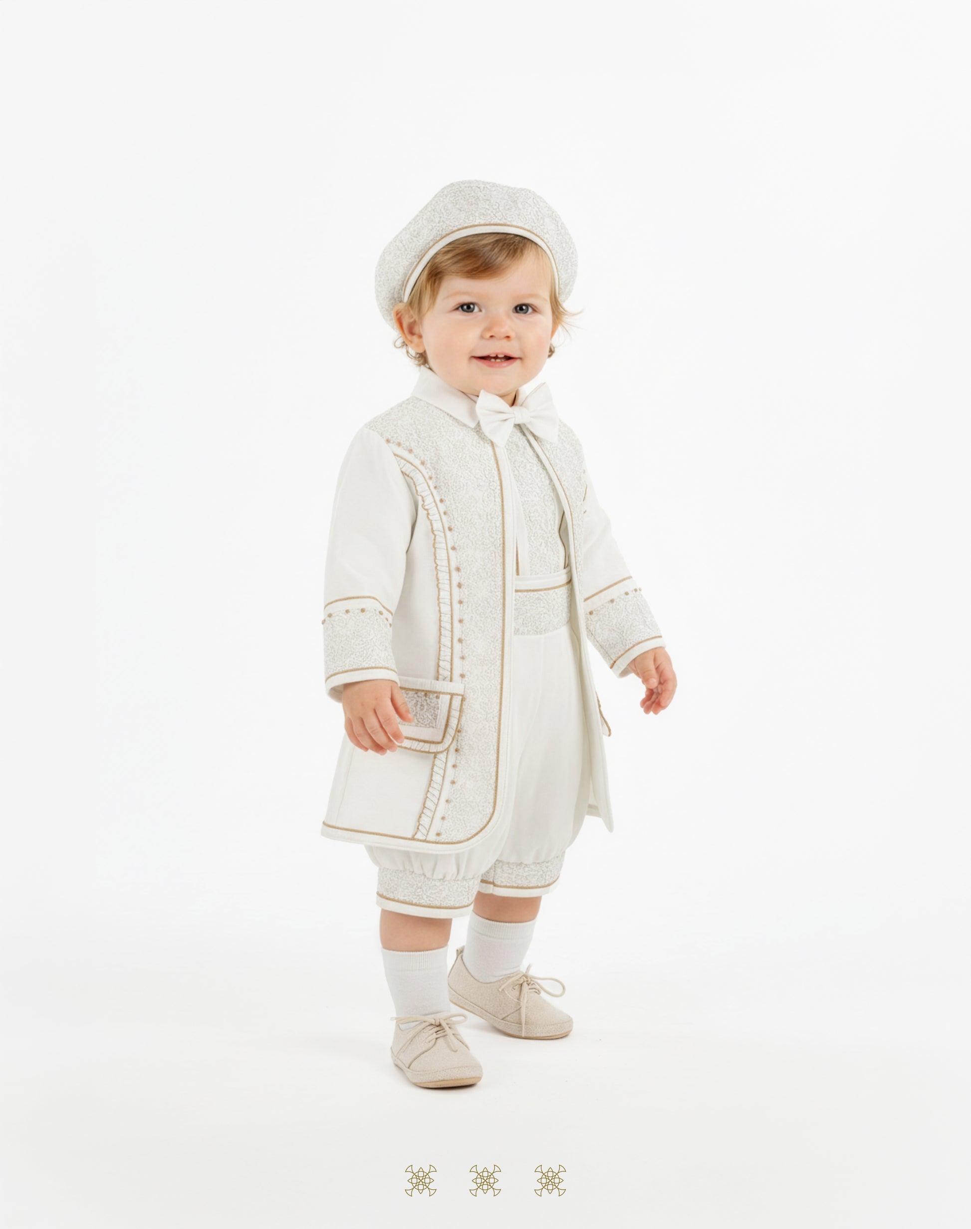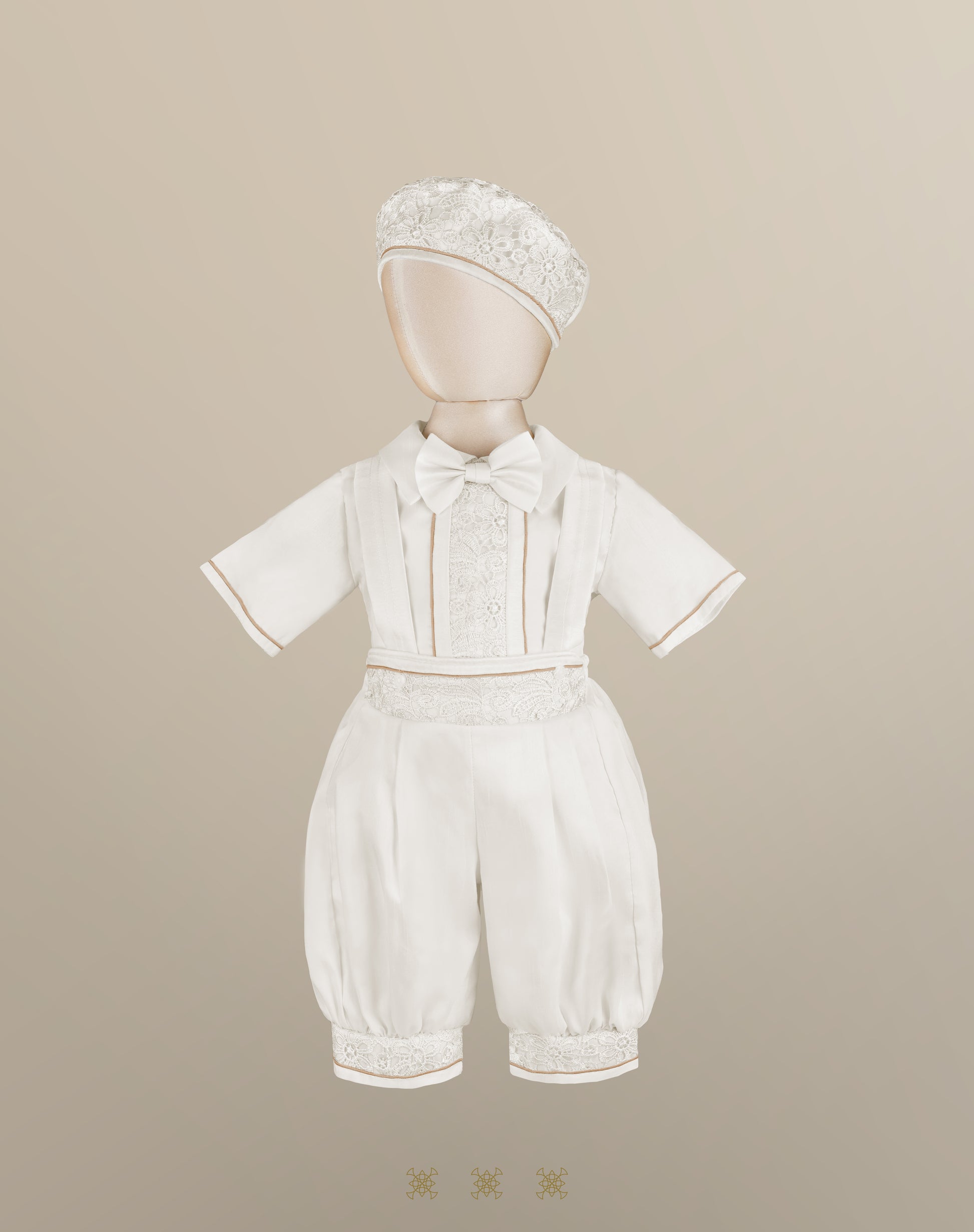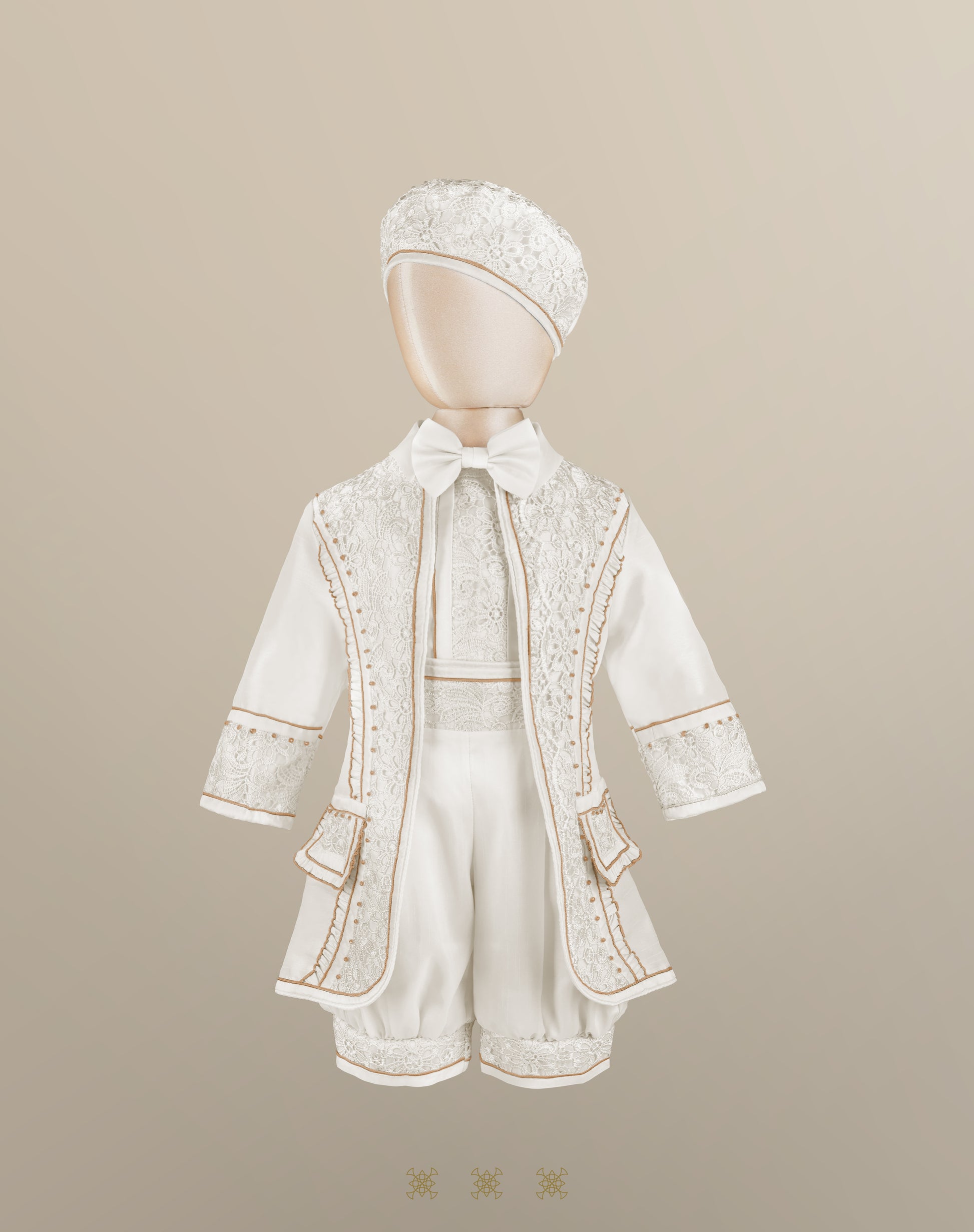 Traje bombacho estilo "Príncipe" color hueso para niño, incluye camisa de manga corta, moño desmontable, pantalón bombacho liso y saco con aplicaciones de encaje y cristales; incluye gorro.