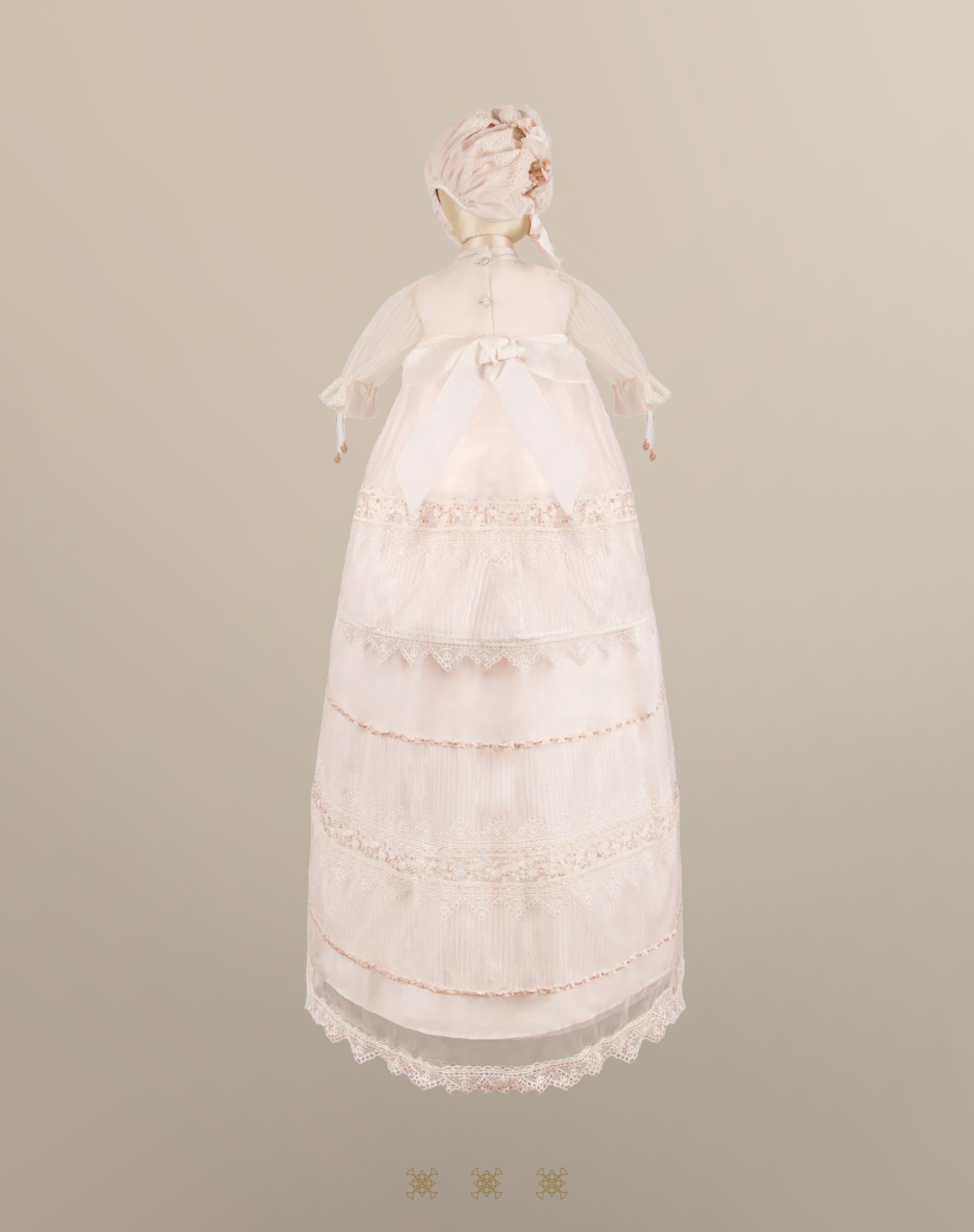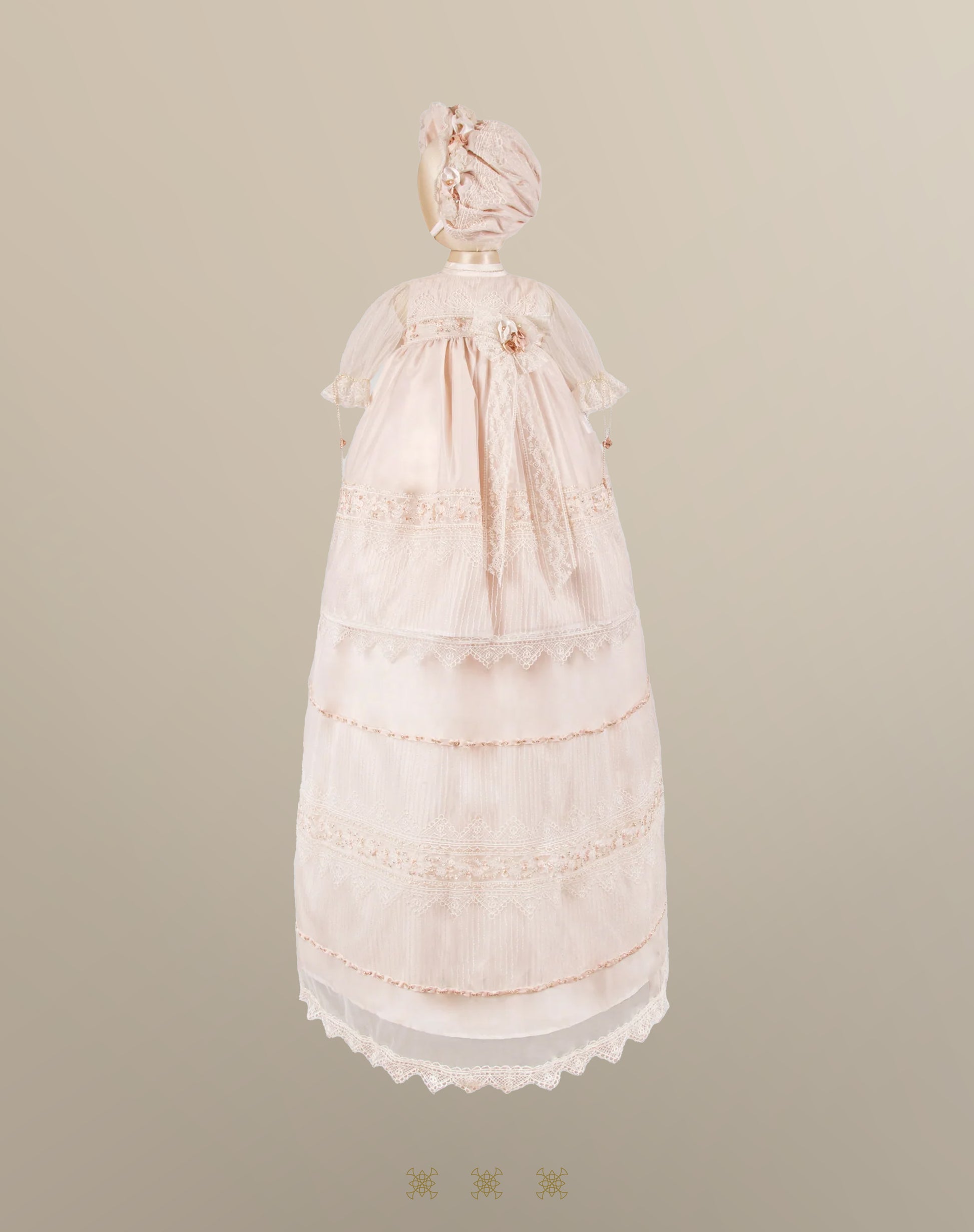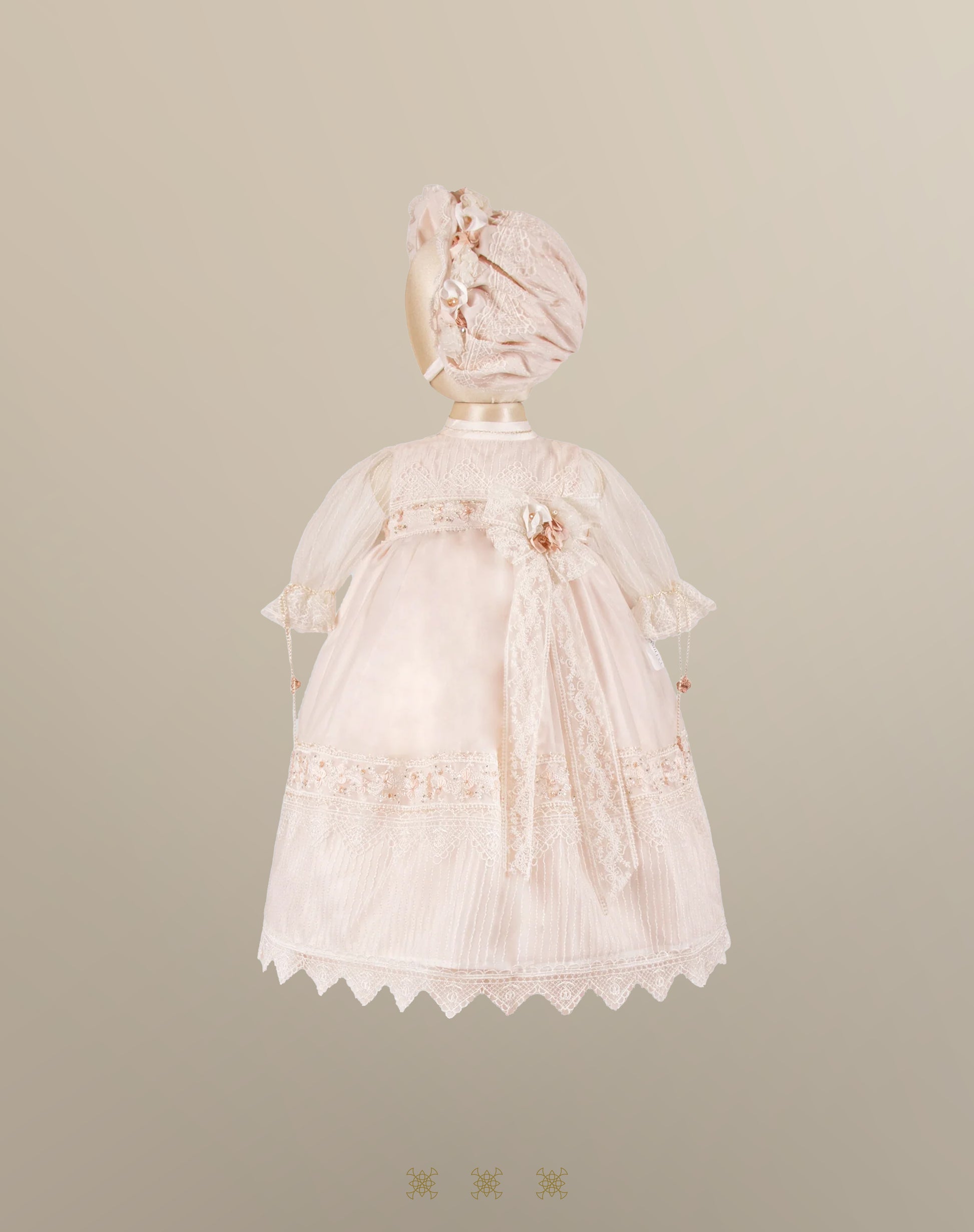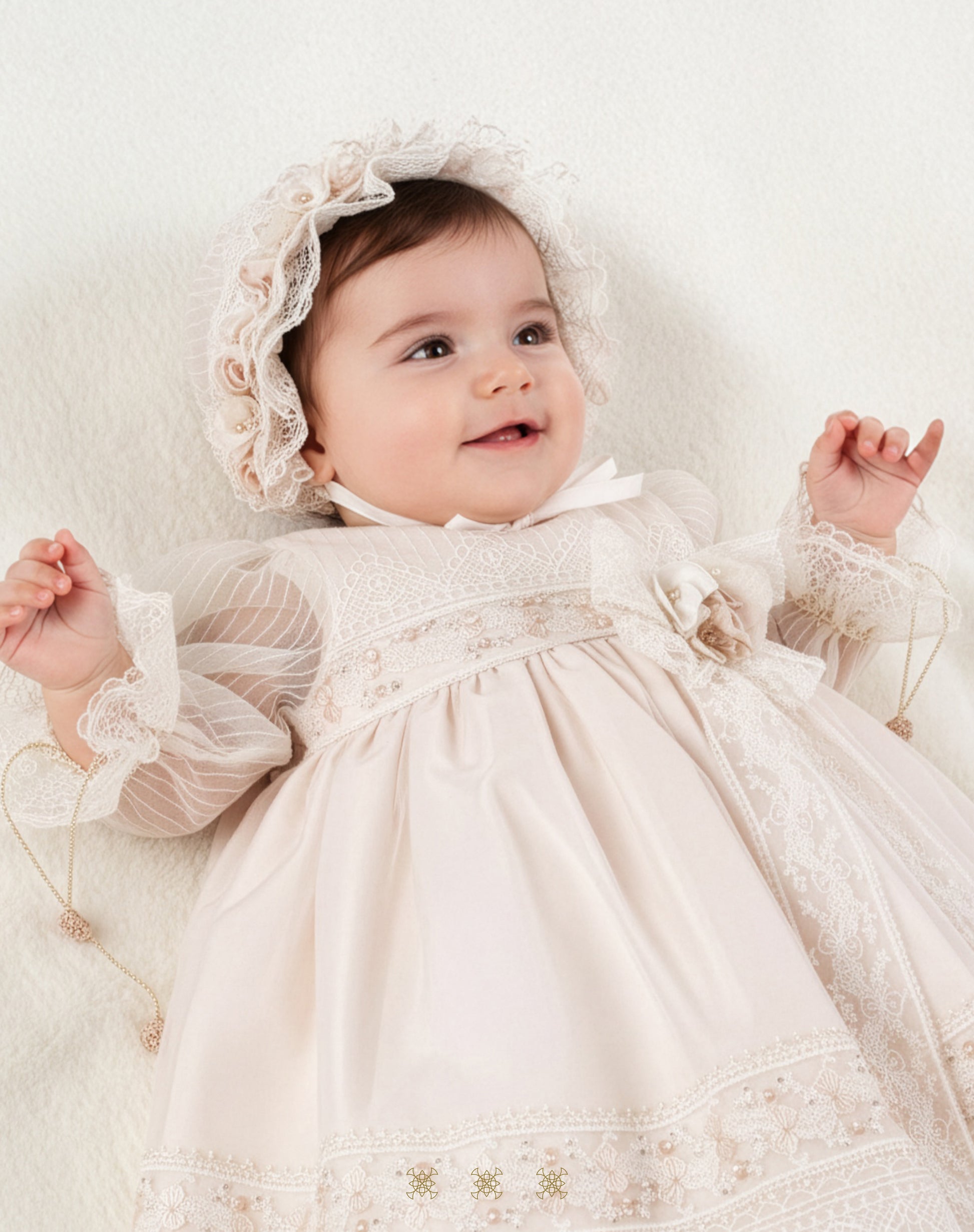 Ropón desmontable artesanal con bordado gabeado.Mangas 3/4 de tul y moño con flores y cristales en el peto. Incluye gorro a juego con flores y detalle de cristales.