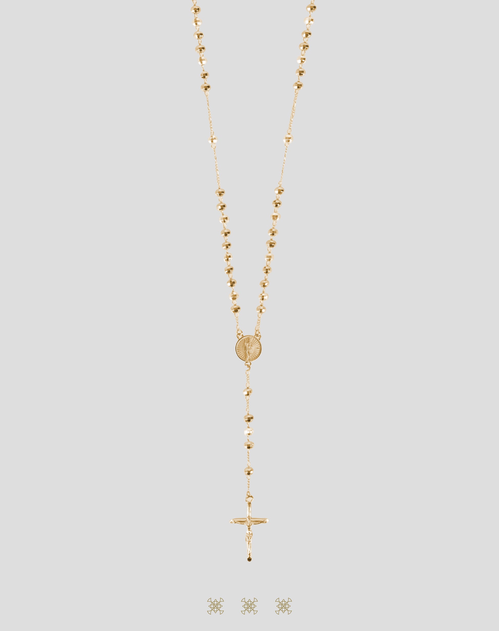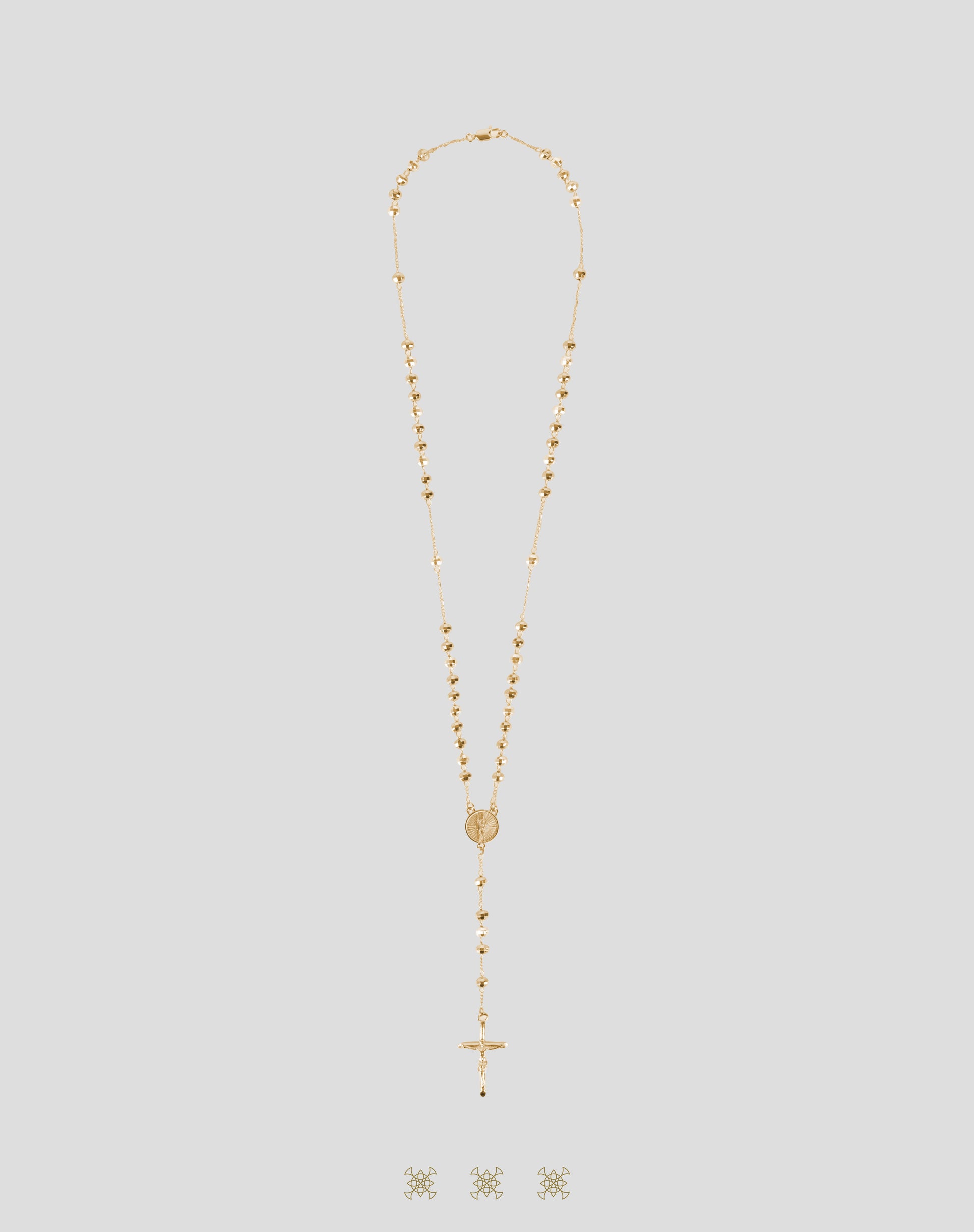 Rosario con chapa de oro florentino con una medalla de San Judas Tadeo con pedrería brillante y un crucifijo color dorado.