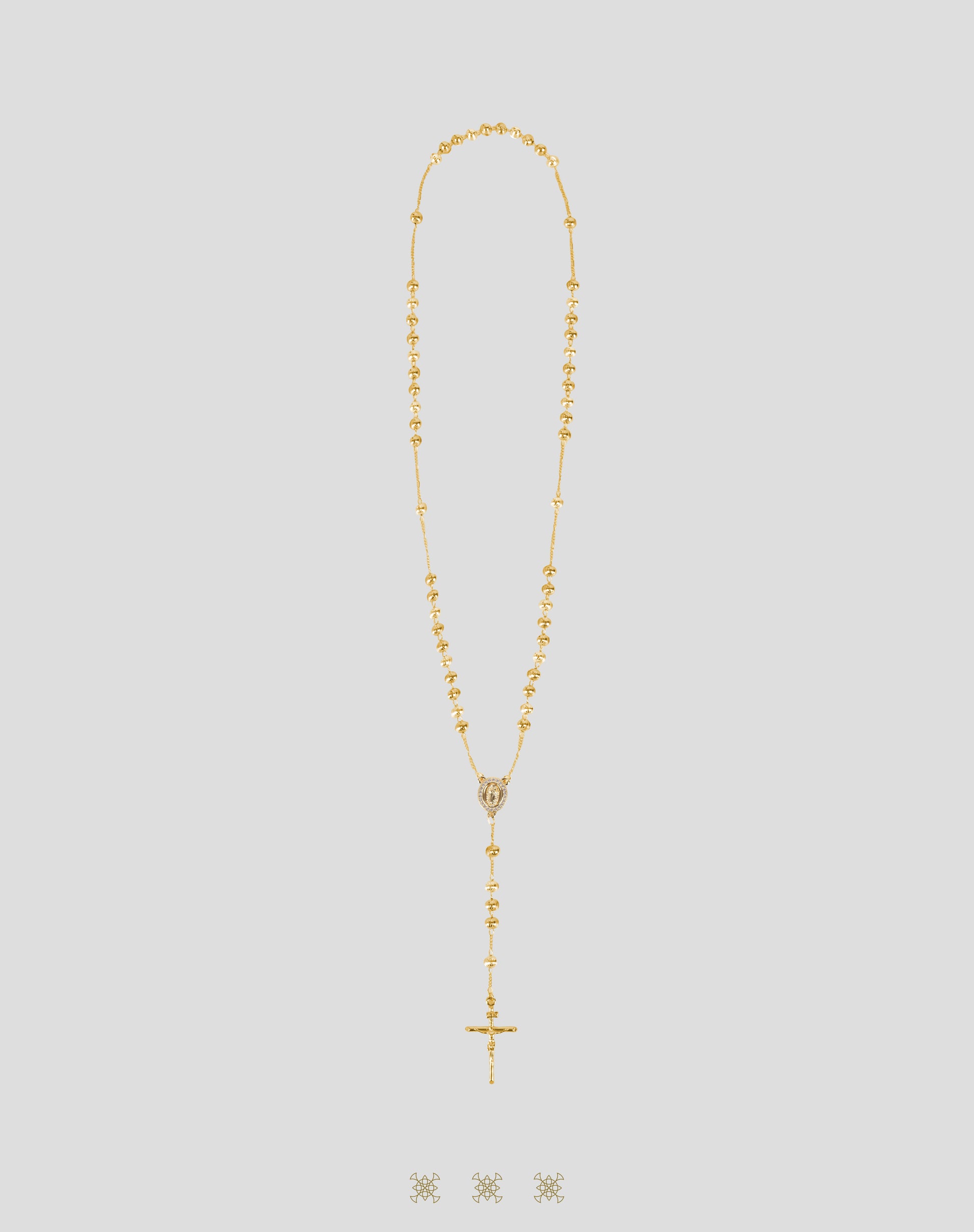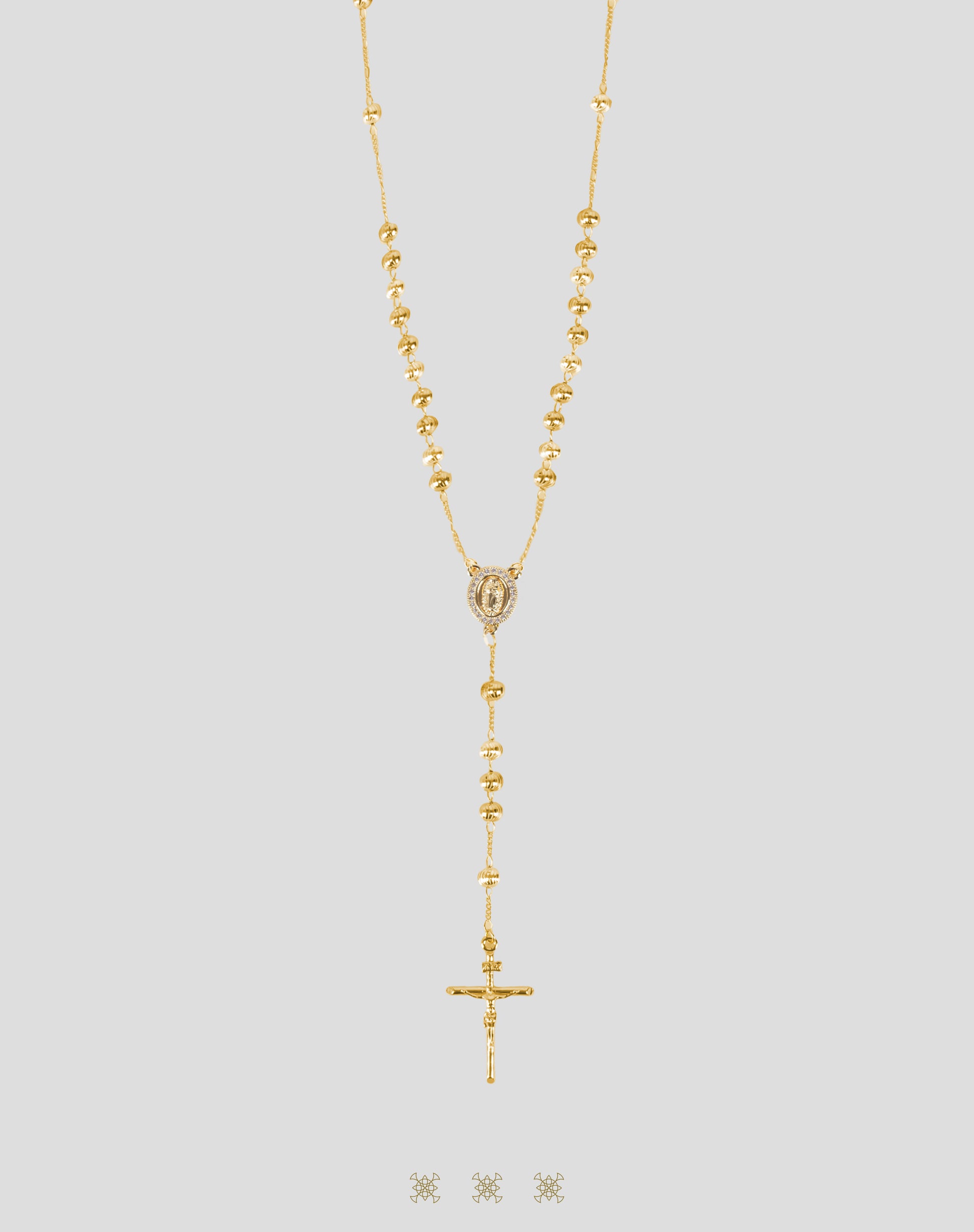 Rosario con chapa de oro con una medalla de la virgen de Guadalupe con pedrería brillante y un crucifijo color dorado.