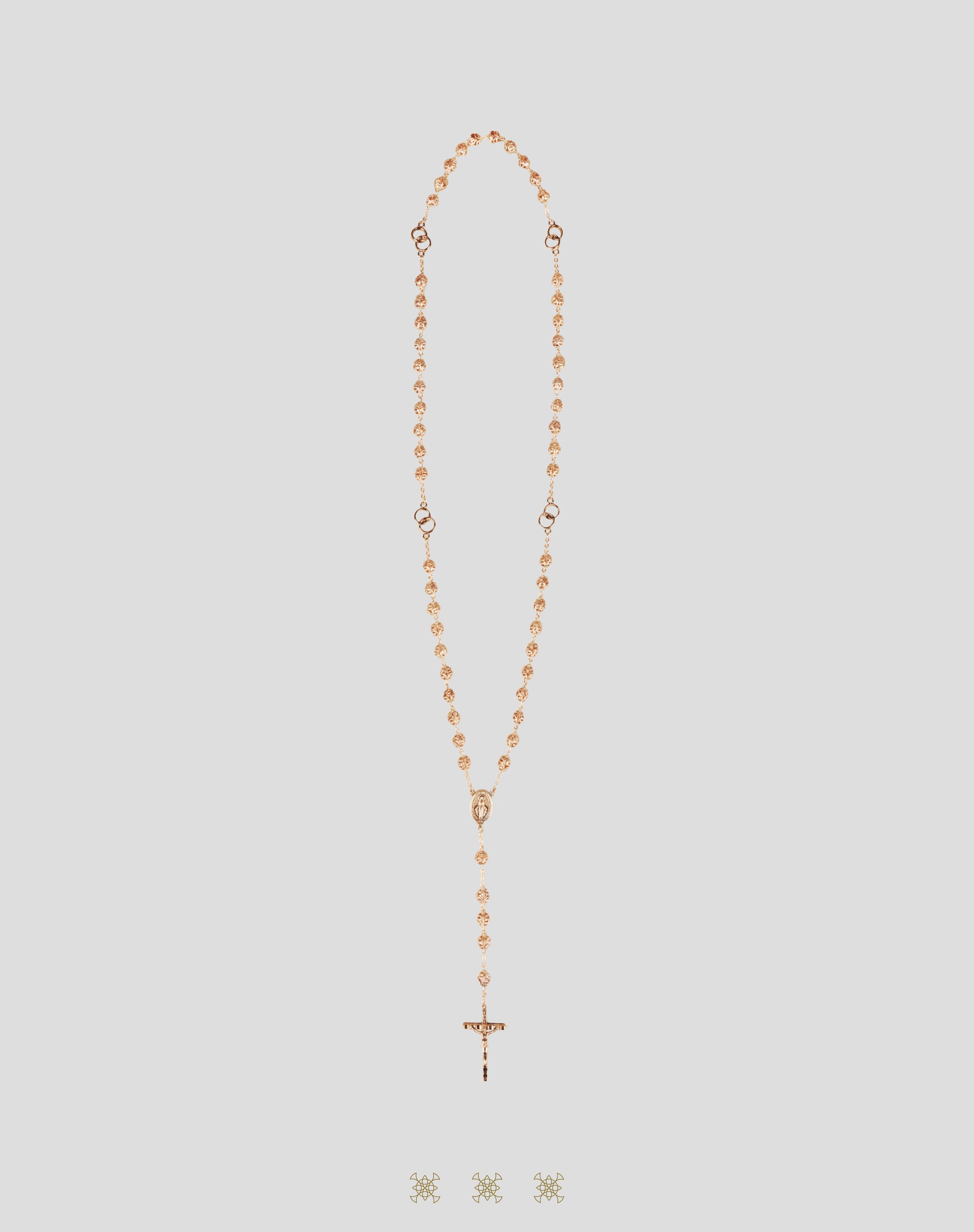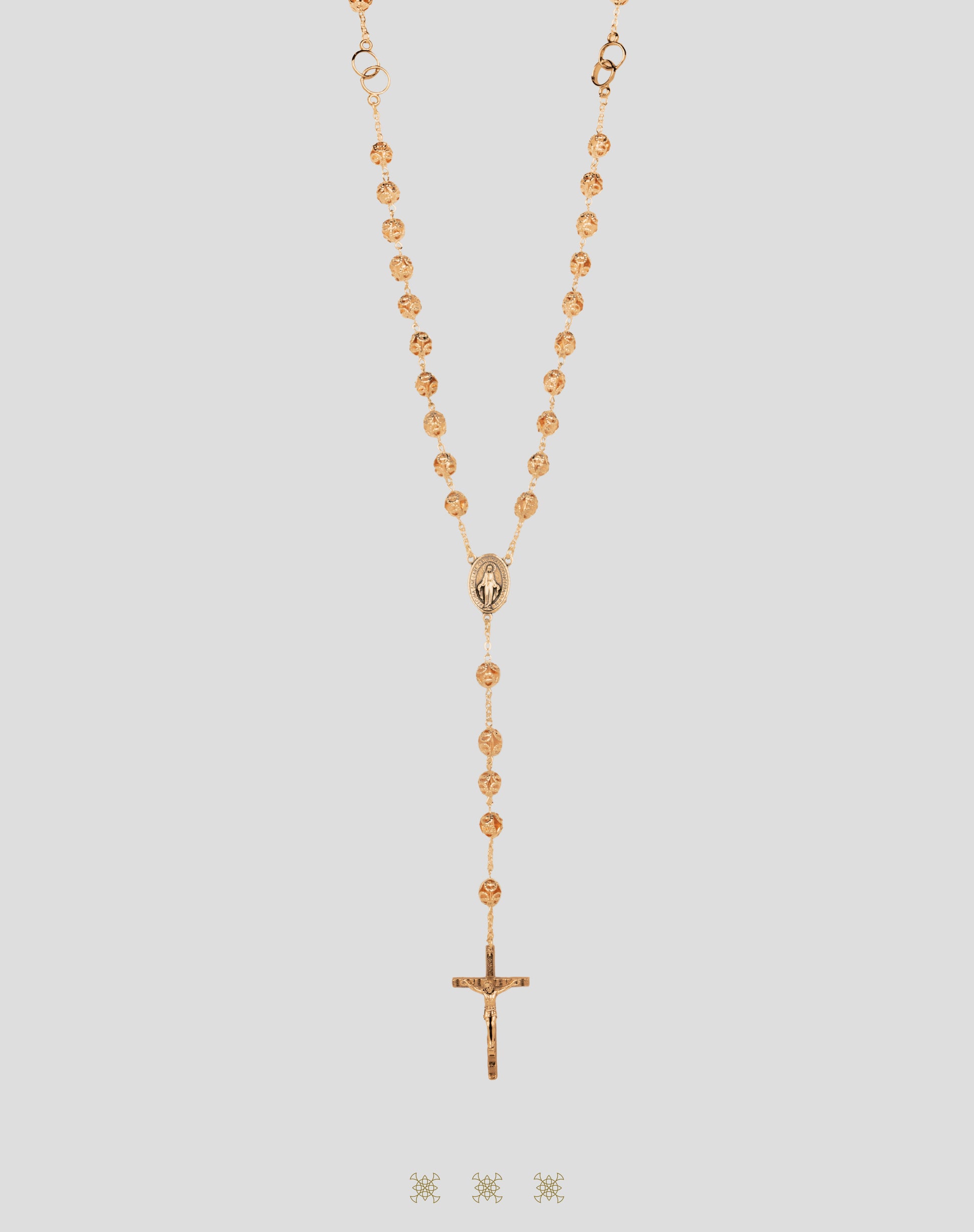 Rosario inspirado en el vidrio de Murano rosa. Este rosario cuenta con ornamentos color dorado alrededor de cada una de sus cuentas de vidrio rosado, medalla de la Virgen Milagrosa y crucifijo en color dorado.