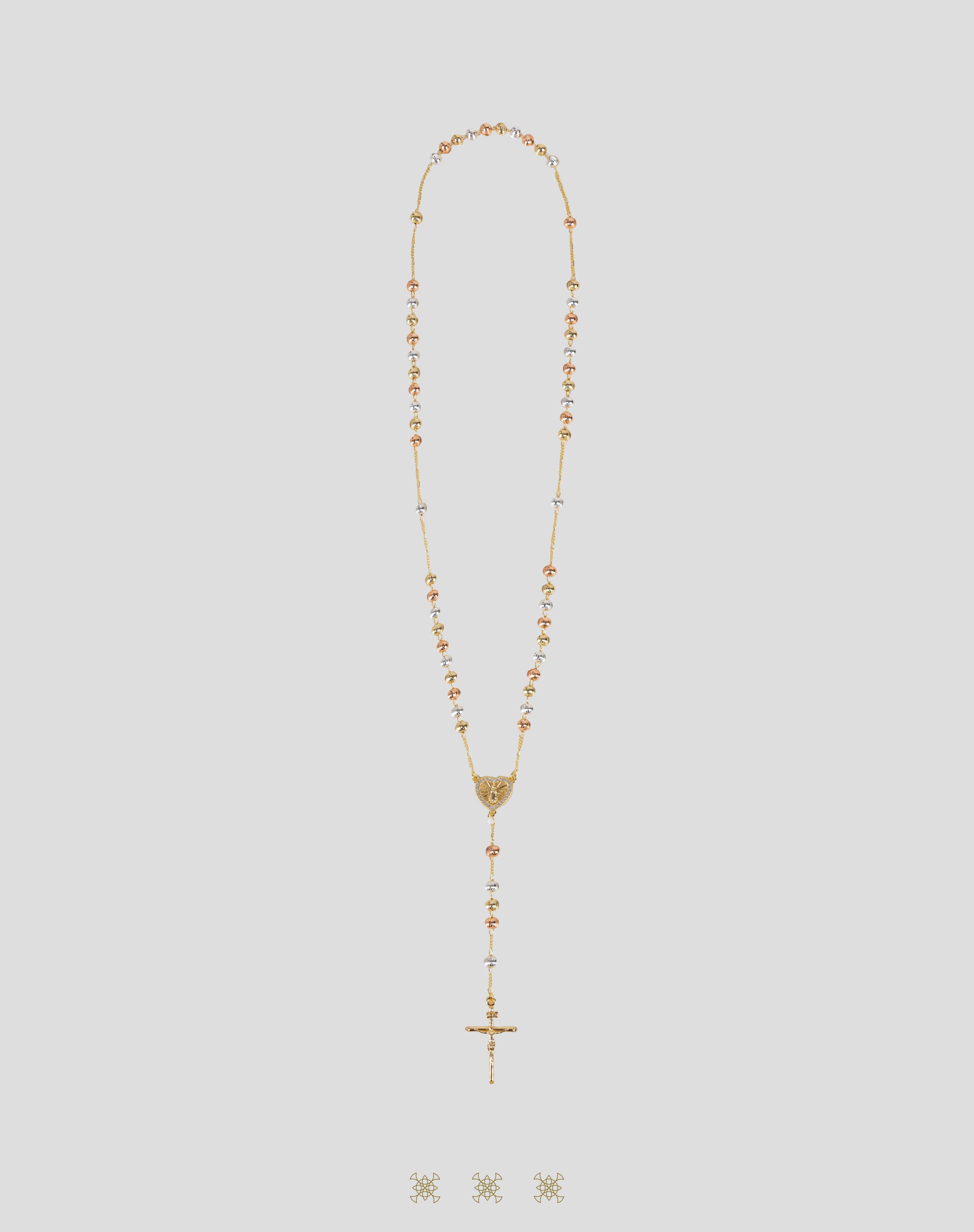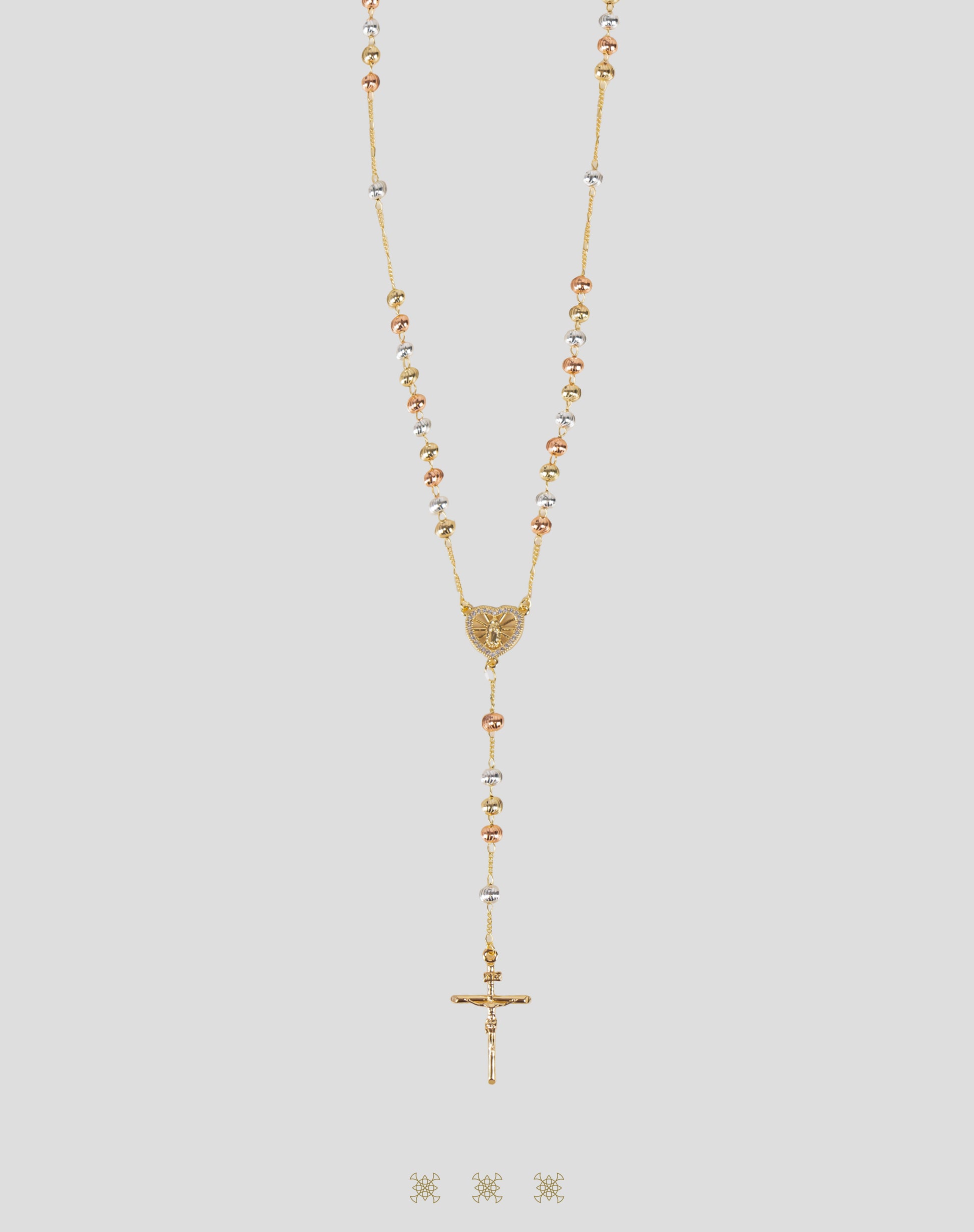 Rosario con chapa de oro florentino con una medalla de corazón de la virgen de Guadalupe con pedrería brillante y un crucifijo color dorado.