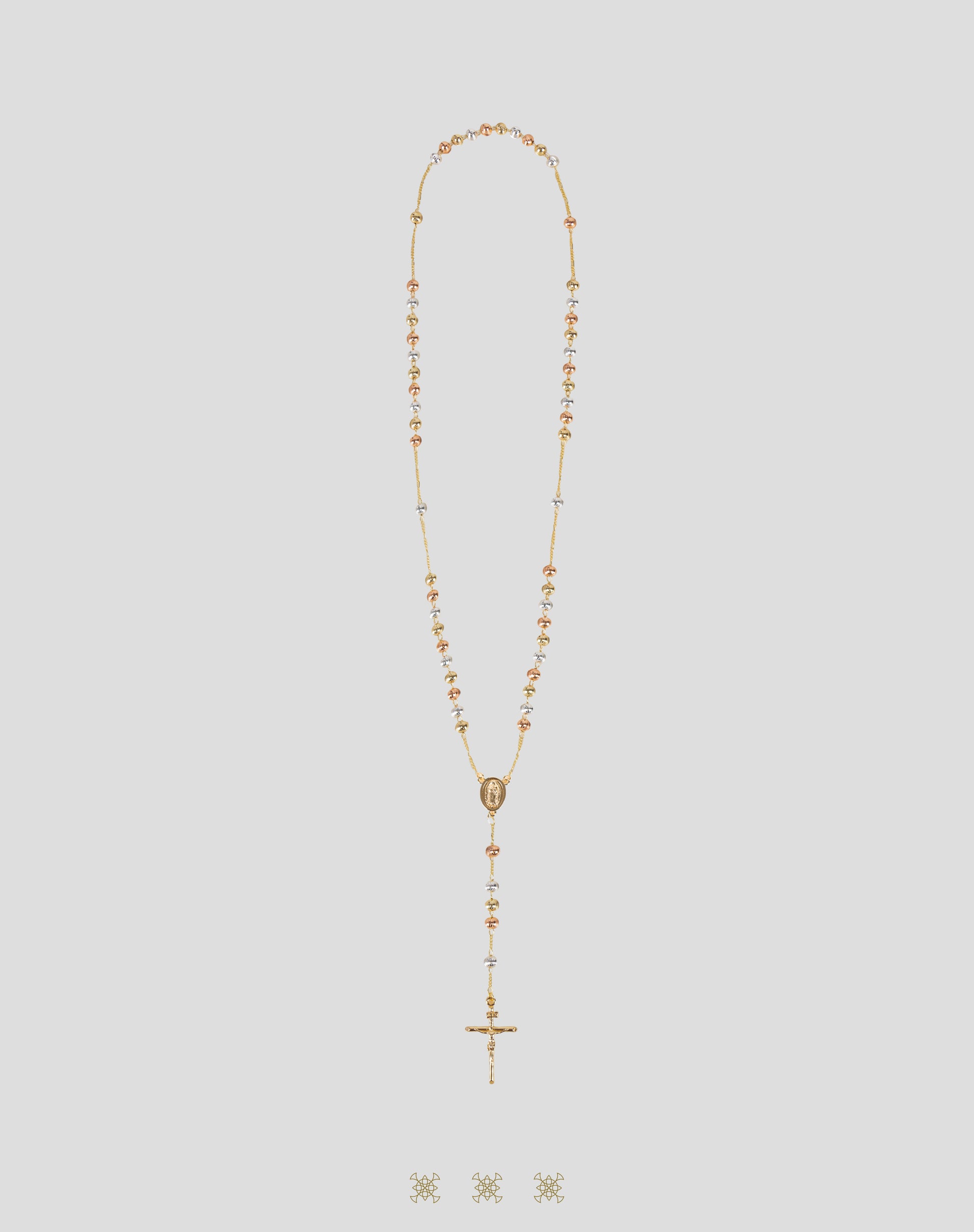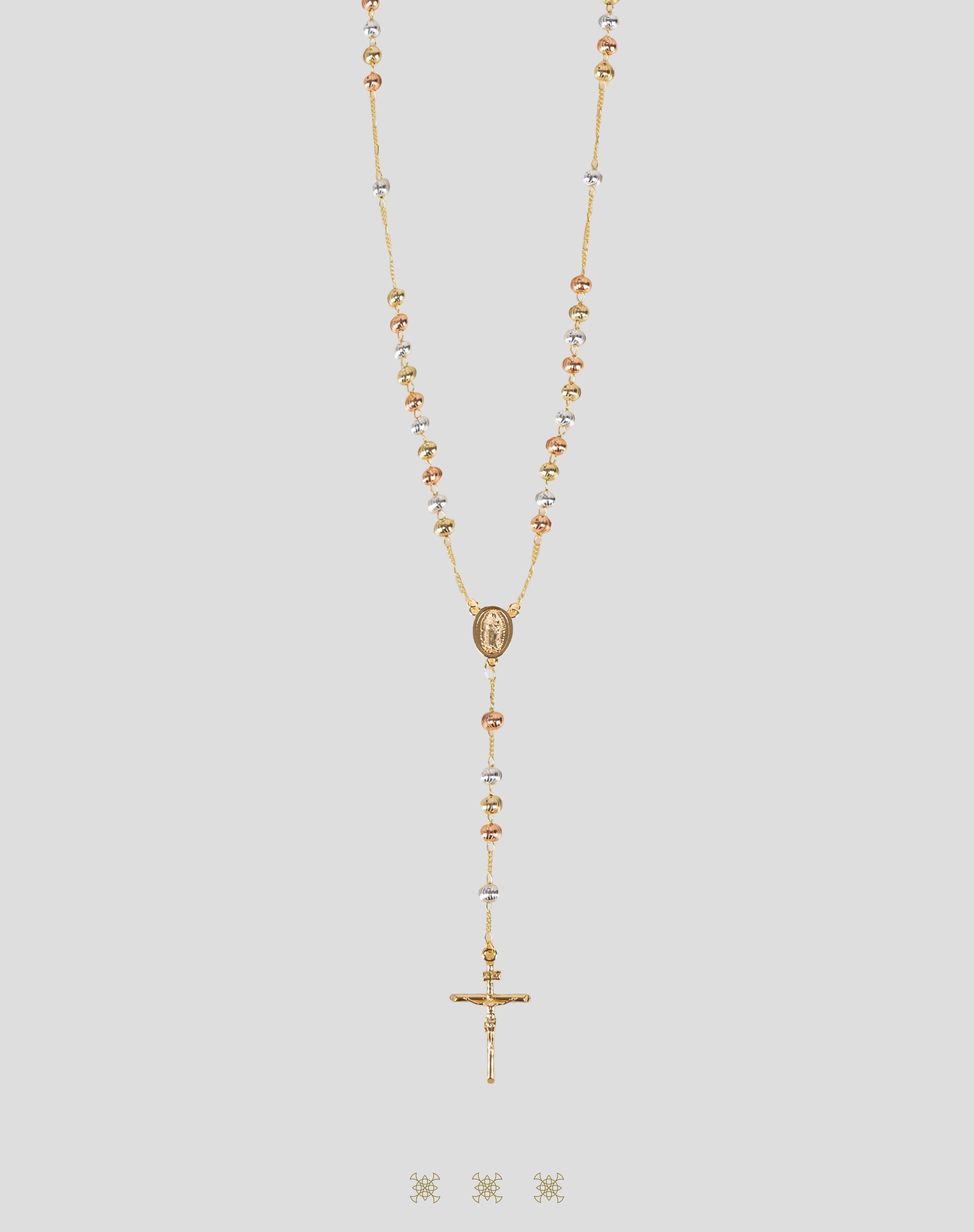 Rosario con chapa de oro florentino con una medalla de la virgen Milagrosa y un crucifijo color dorado.