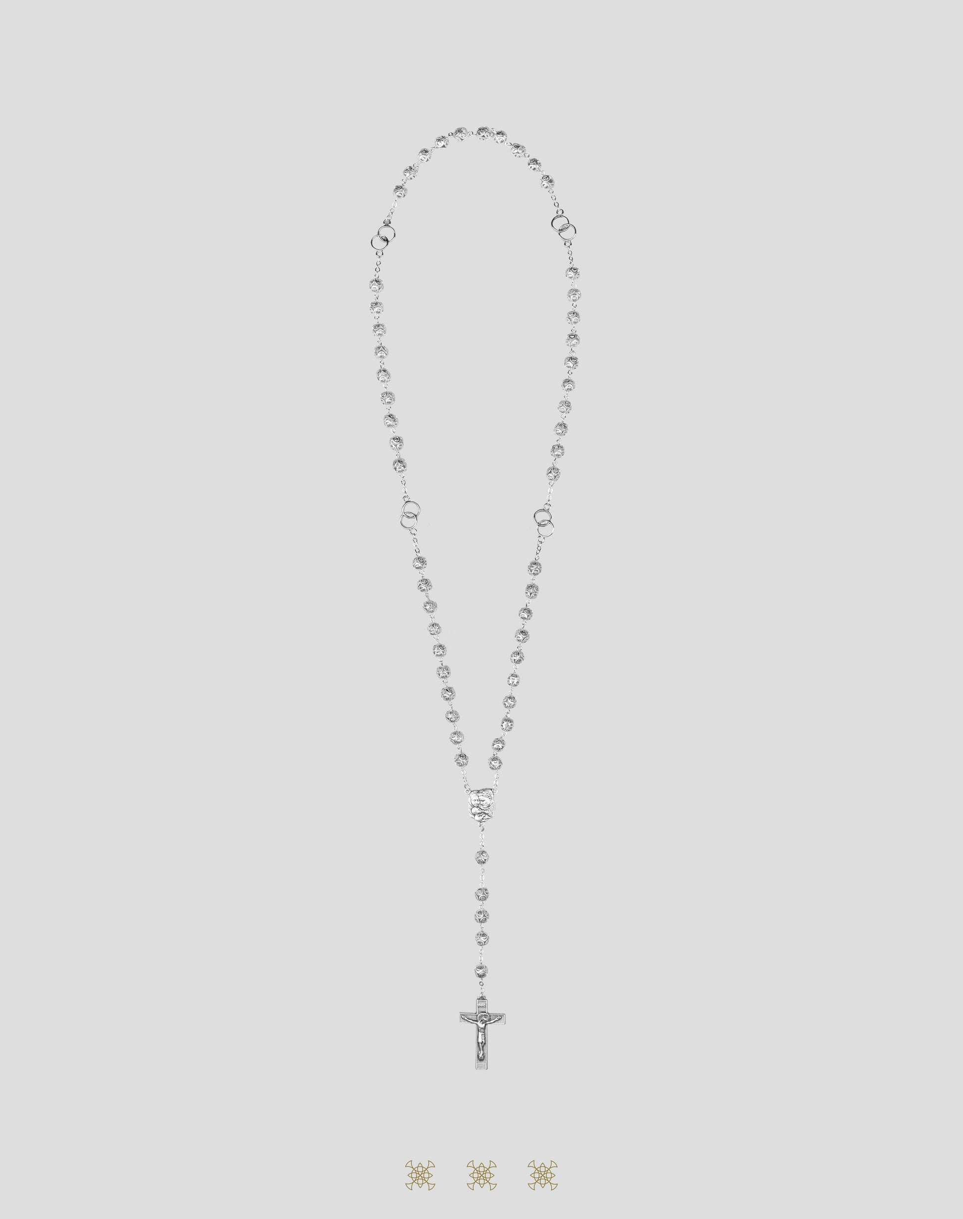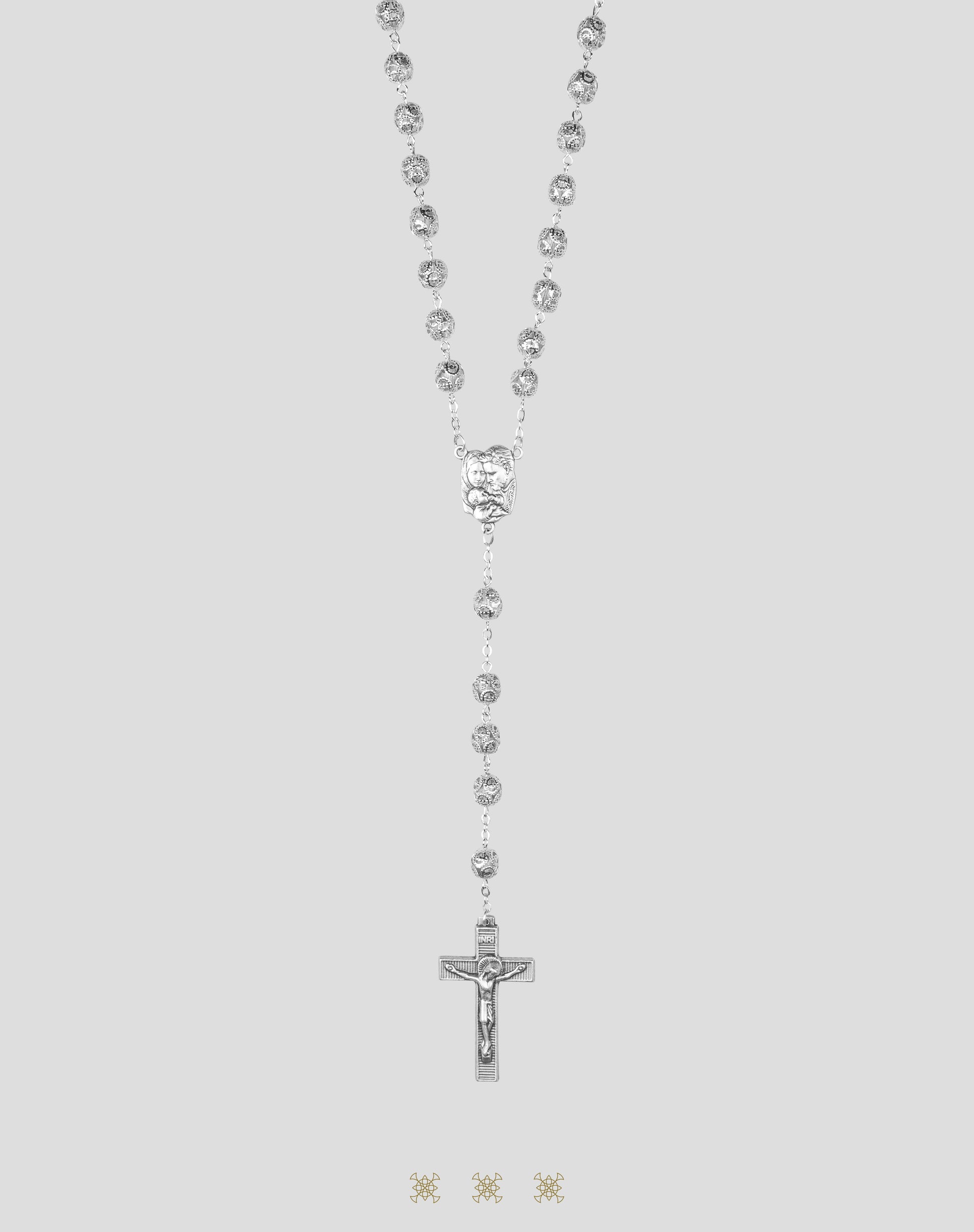 Rosario Italiano inspirado en el vidrio de Murano plata. Este rosario cuenta con ornamentos color plata al rededor de cada una de sus cuentas de vidrio, con un medallón de la Sagrada Familia y un crucifijo colgante de metal color plata.