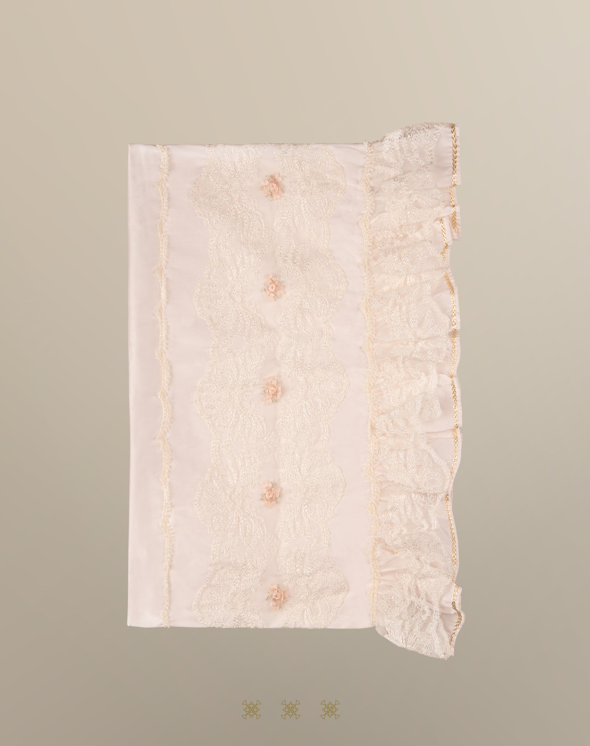 Sábana de poli-shantung con ribete de encaje y aplicación de encaje rebordado, color beige.