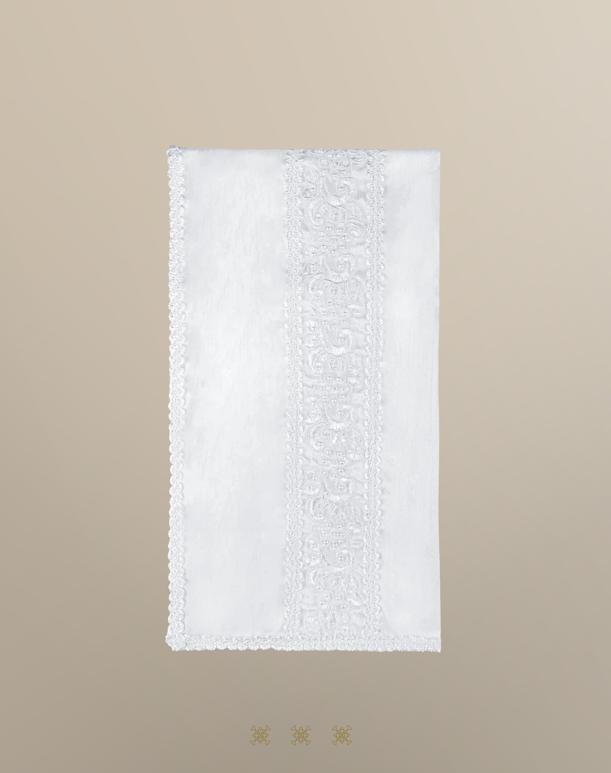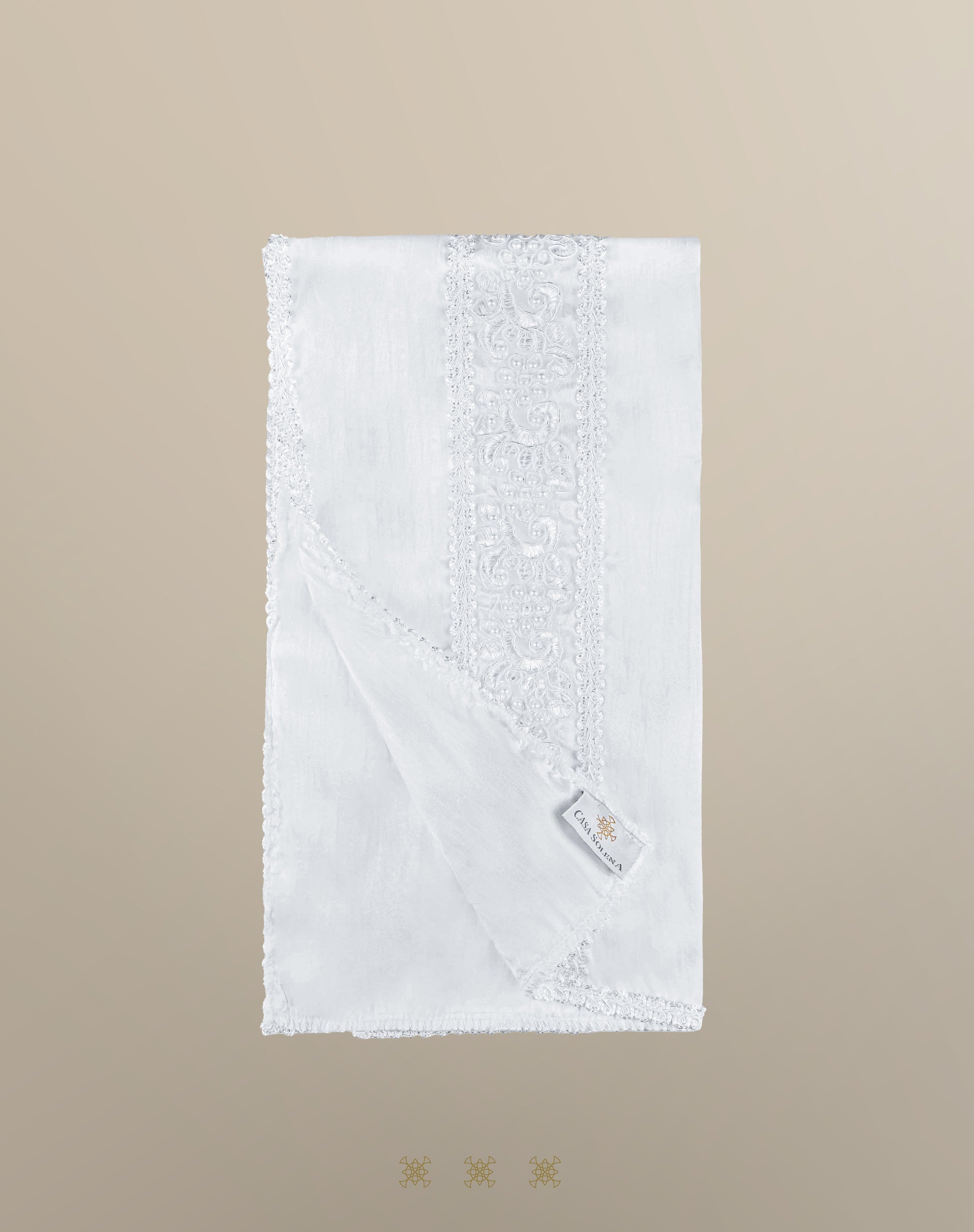 Sábana de poli-shantung con ribete de galón, y aplicación de encaje rebordado de modelo príncipe, color blanco.