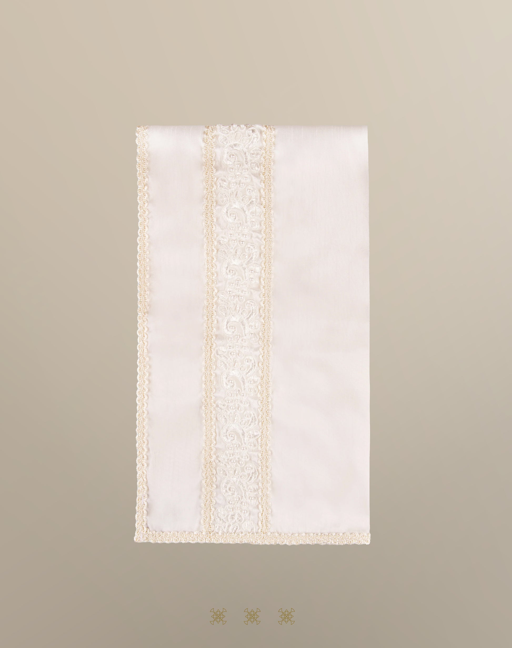 Sábana de poli-shantung con ribete de galón, y aplicación de encaje rebordado de modelo príncipe, color hueso.