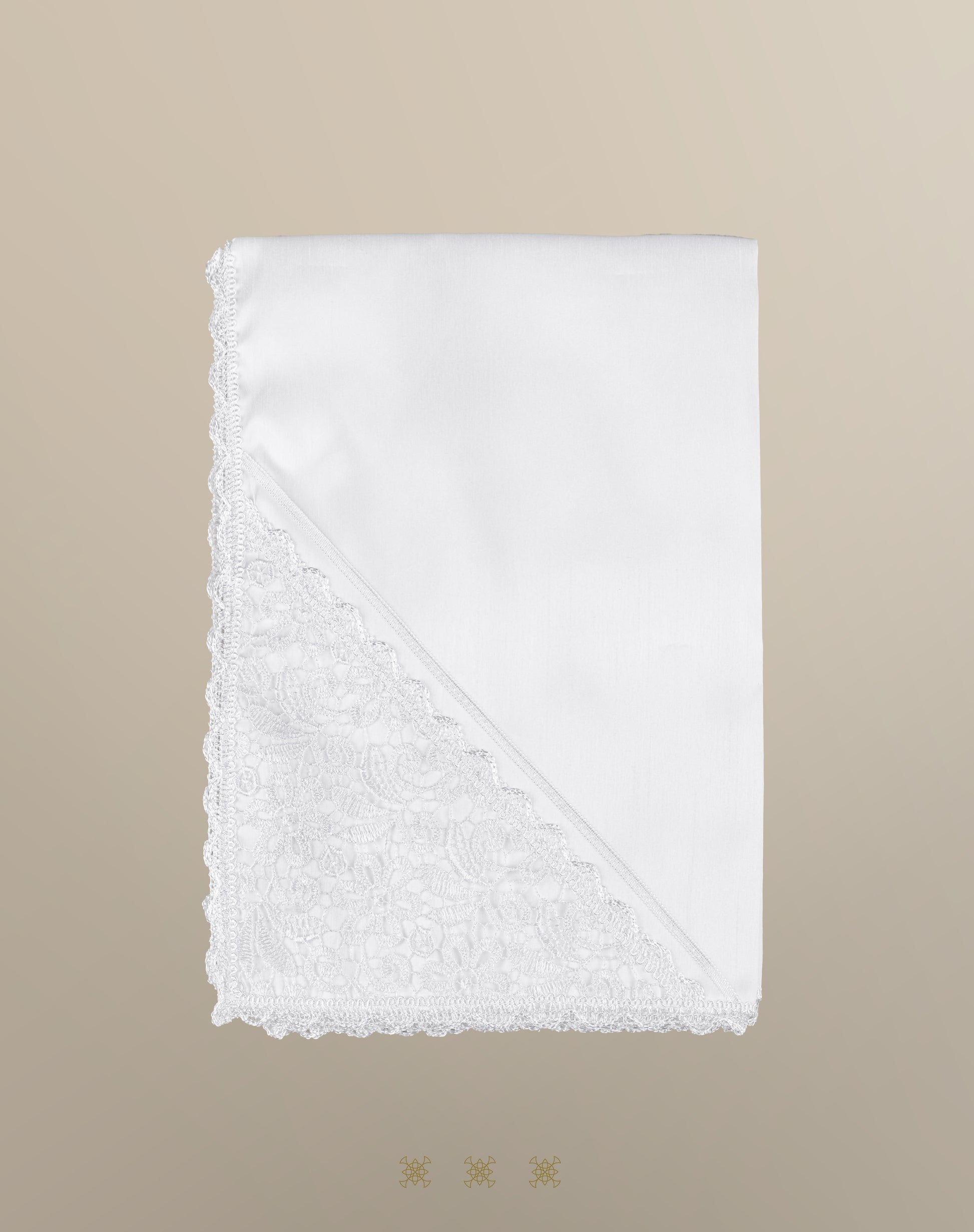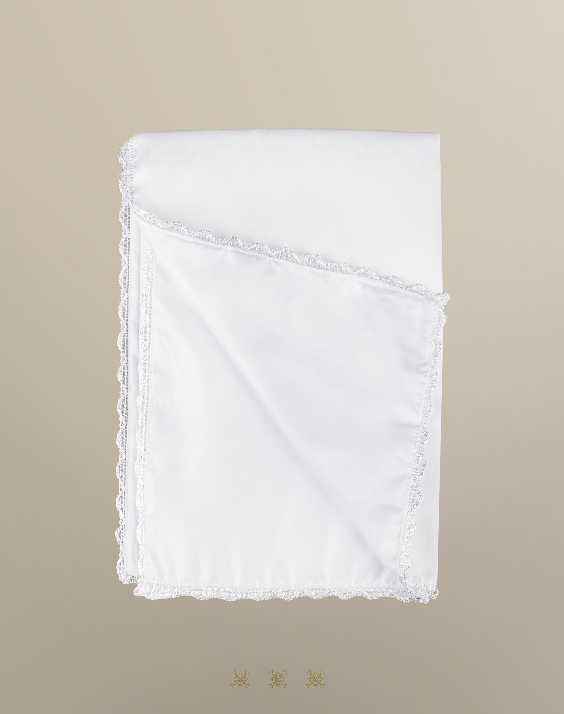 Sábana color blanco con holán en la orilla, aplicaciones de bordado y encaje y ribete de galón.
