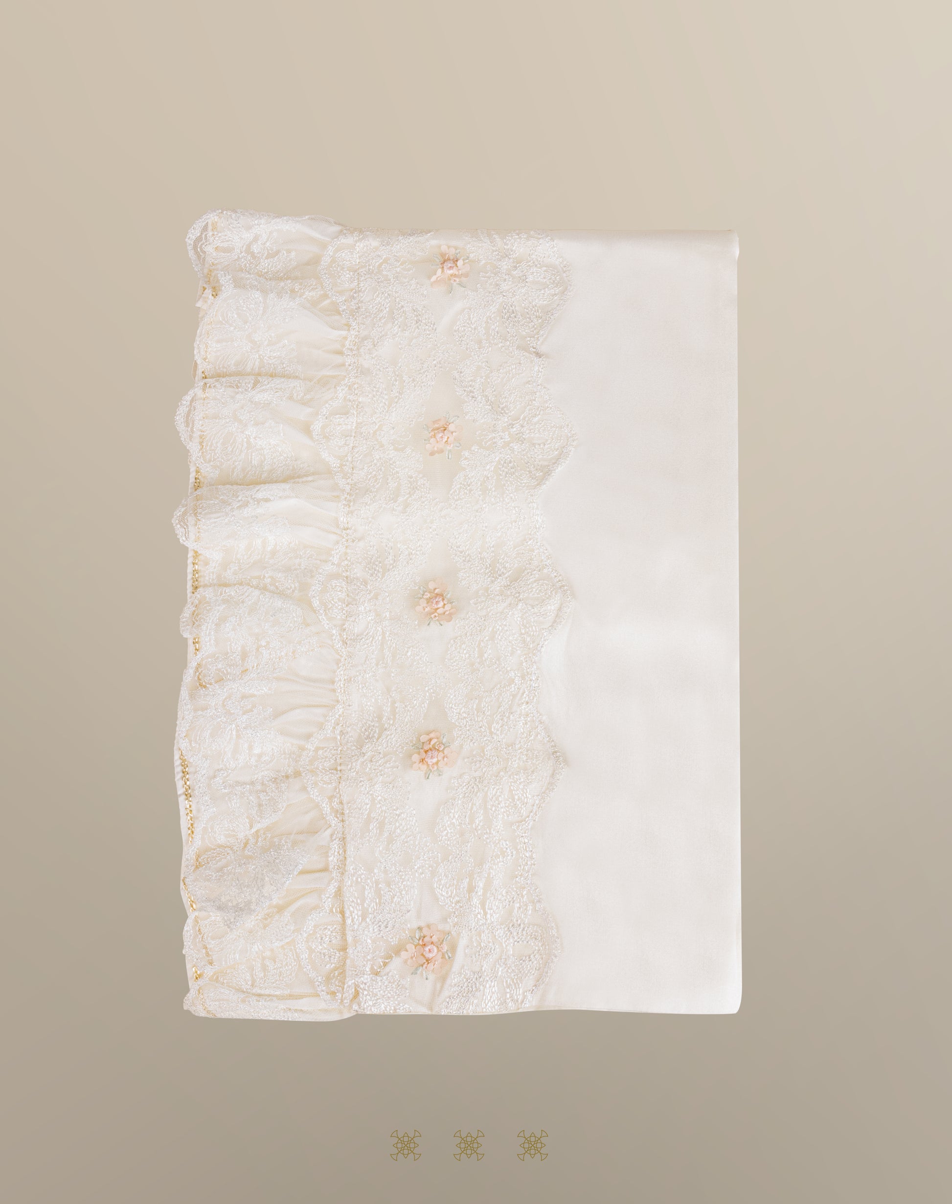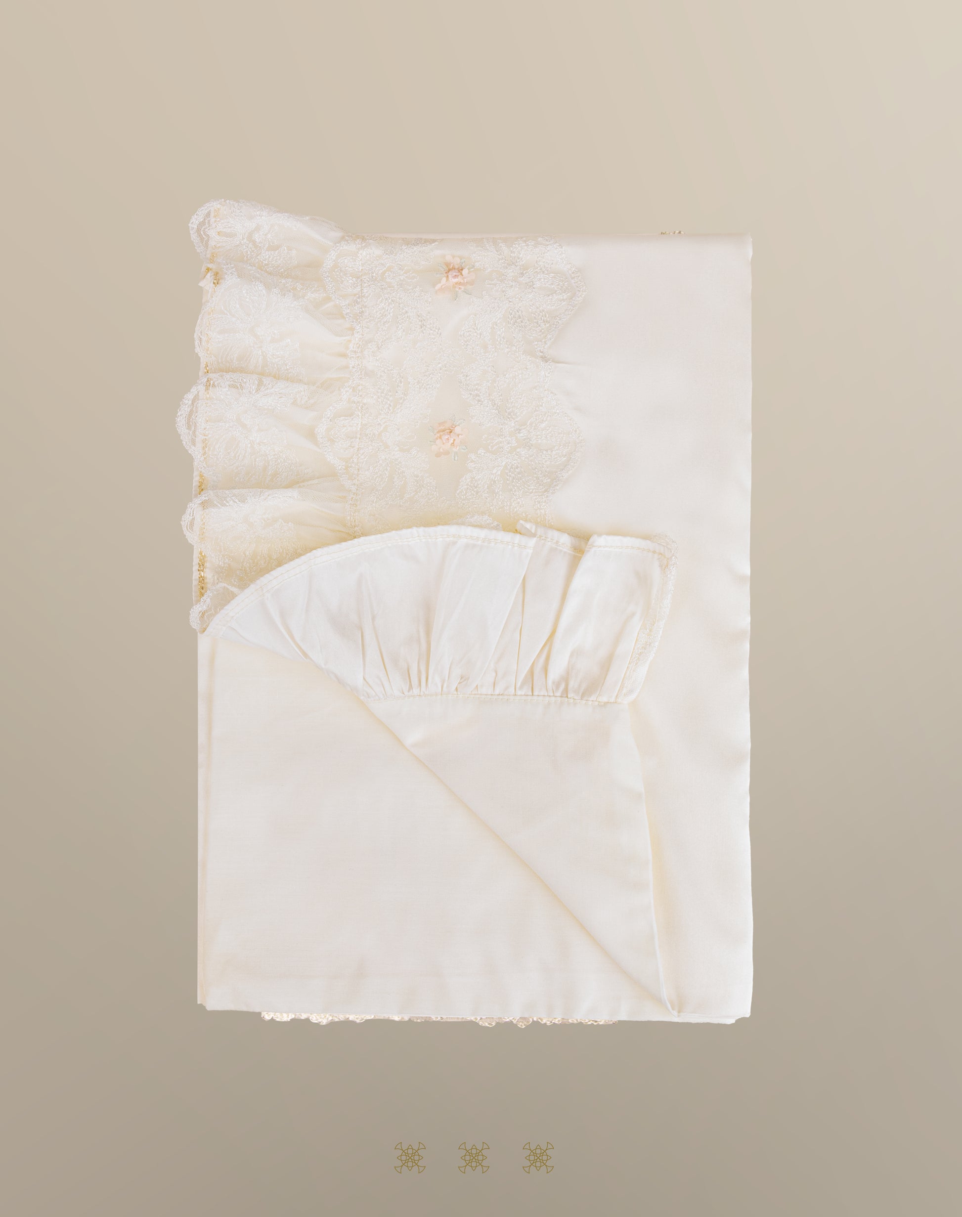 Sábana color hueso con rosa con ribete de encaje y aplicación de encaje rebordado hecho a mano.