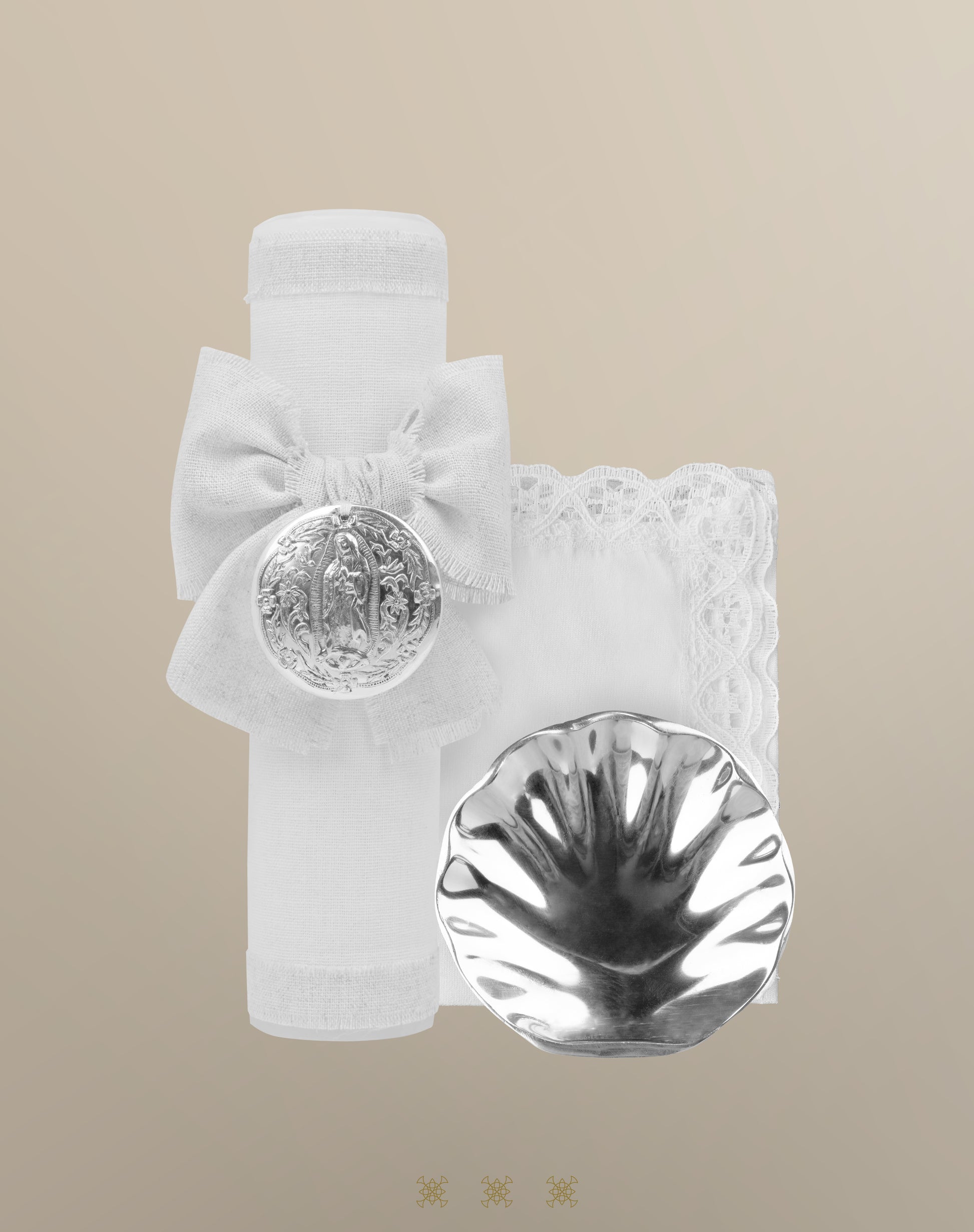 Juego de vela para bautizo color blanco con moño y medalla de la Virgen. Incluye vela, concha y fe.