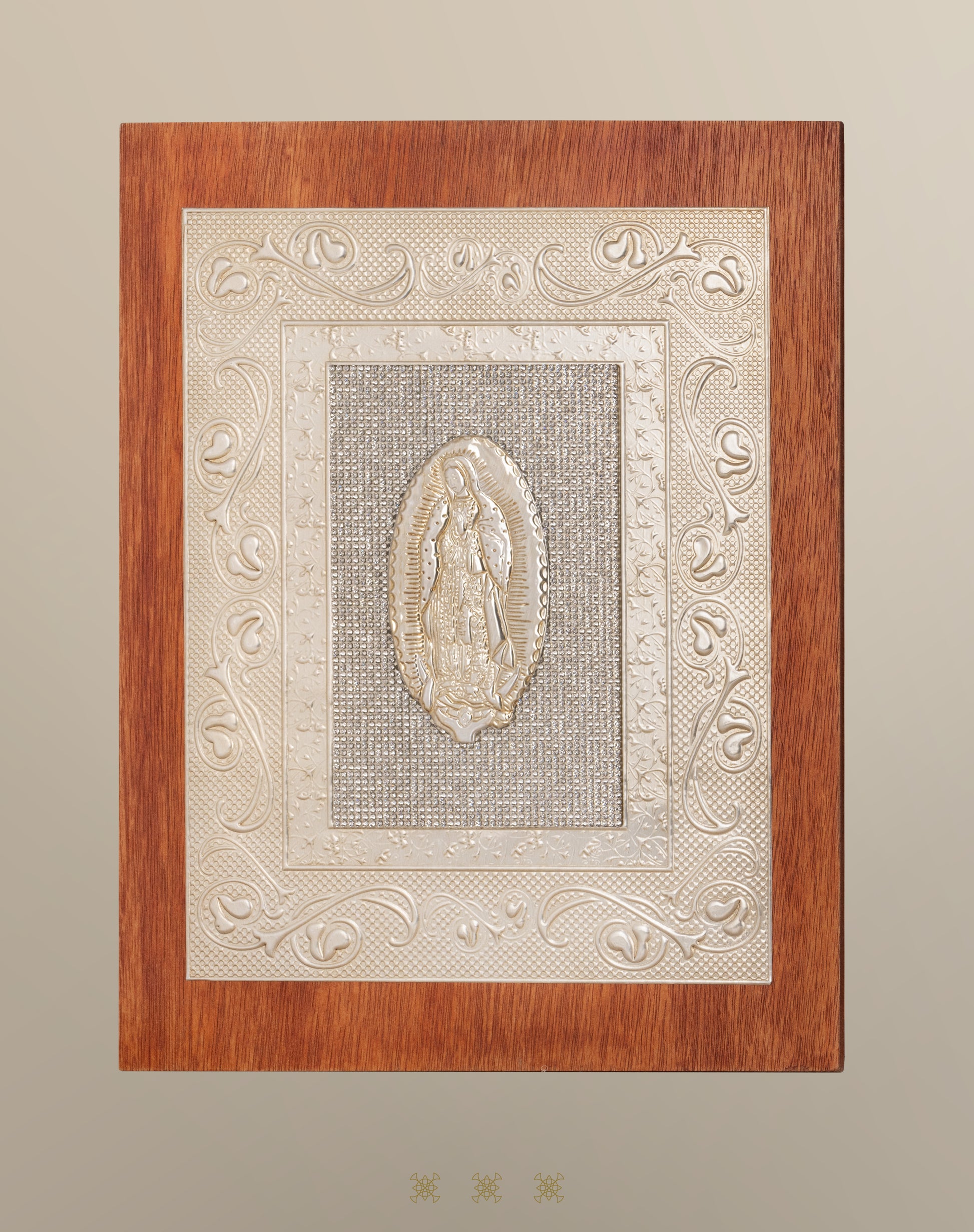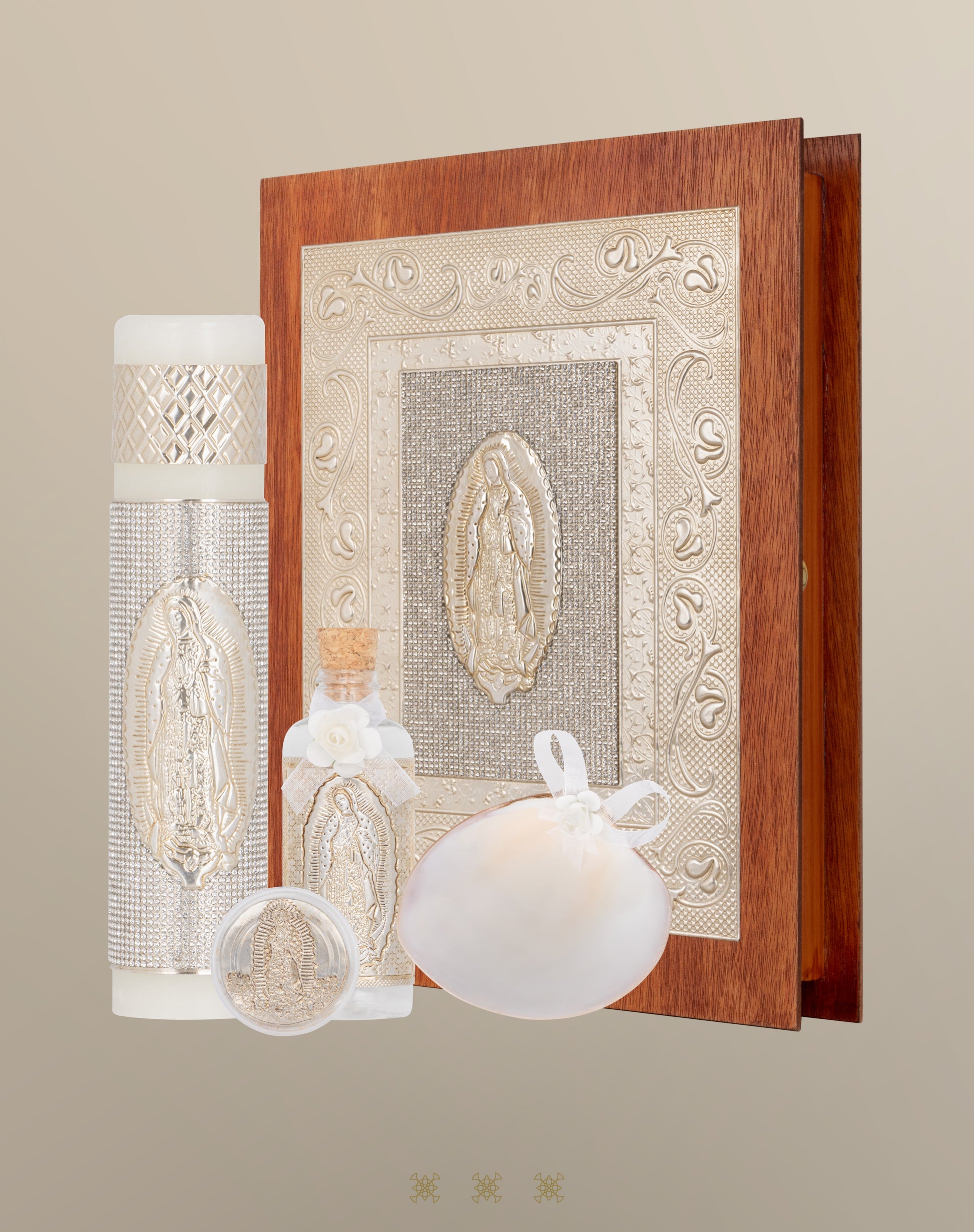 Set para Bautizo con cofre de madera, con imagen de la Virgen de Guadalupe, elaborado en repujado artesanal color dorado con detalles plateados y super brillo. Vela, botella para agua bendita y estuche de rosario decoradas con mismo motivo en repujado. Concha y botella con moño de listón de organza y flor color hueso. Fe de sedalina con ribete de galón.