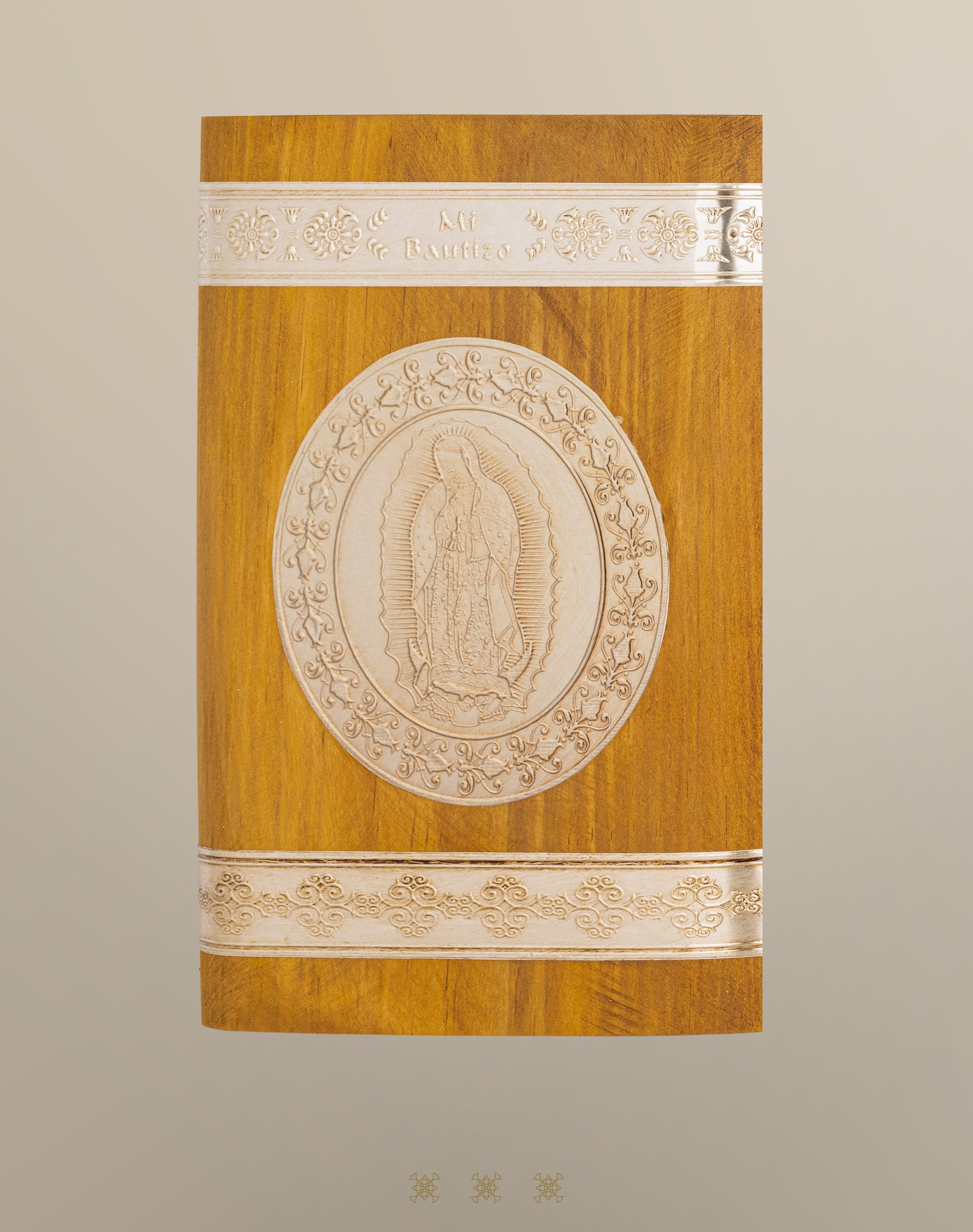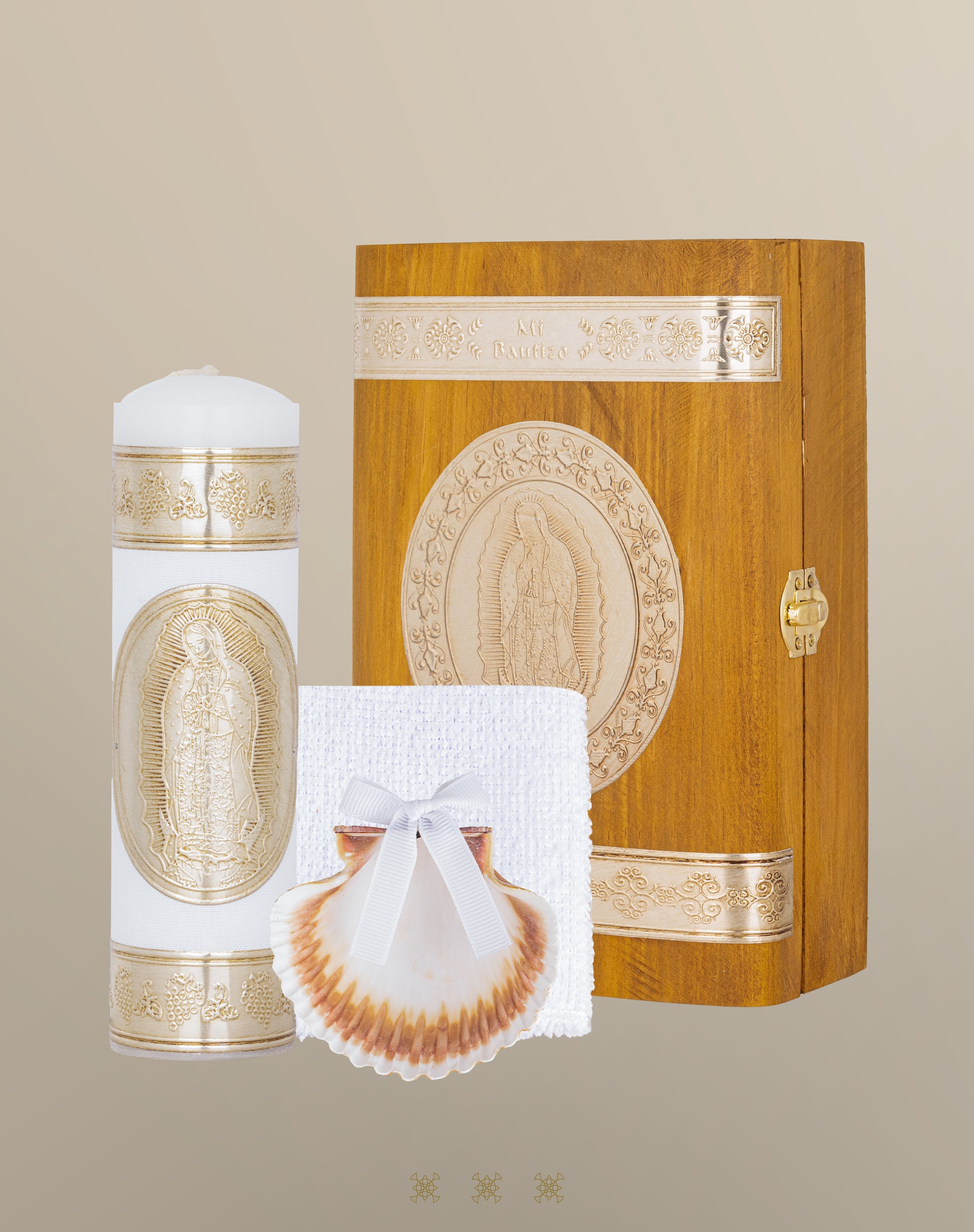 Set para Bautizo con cofre de madera, con imagen de la Virgen de Guadalupe, elaborado en repujado artesanal color dorado. Vela decorada con mismo motivo en repujado. Concha con moño de listón de organza y flor color hueso. Fe de algodón.