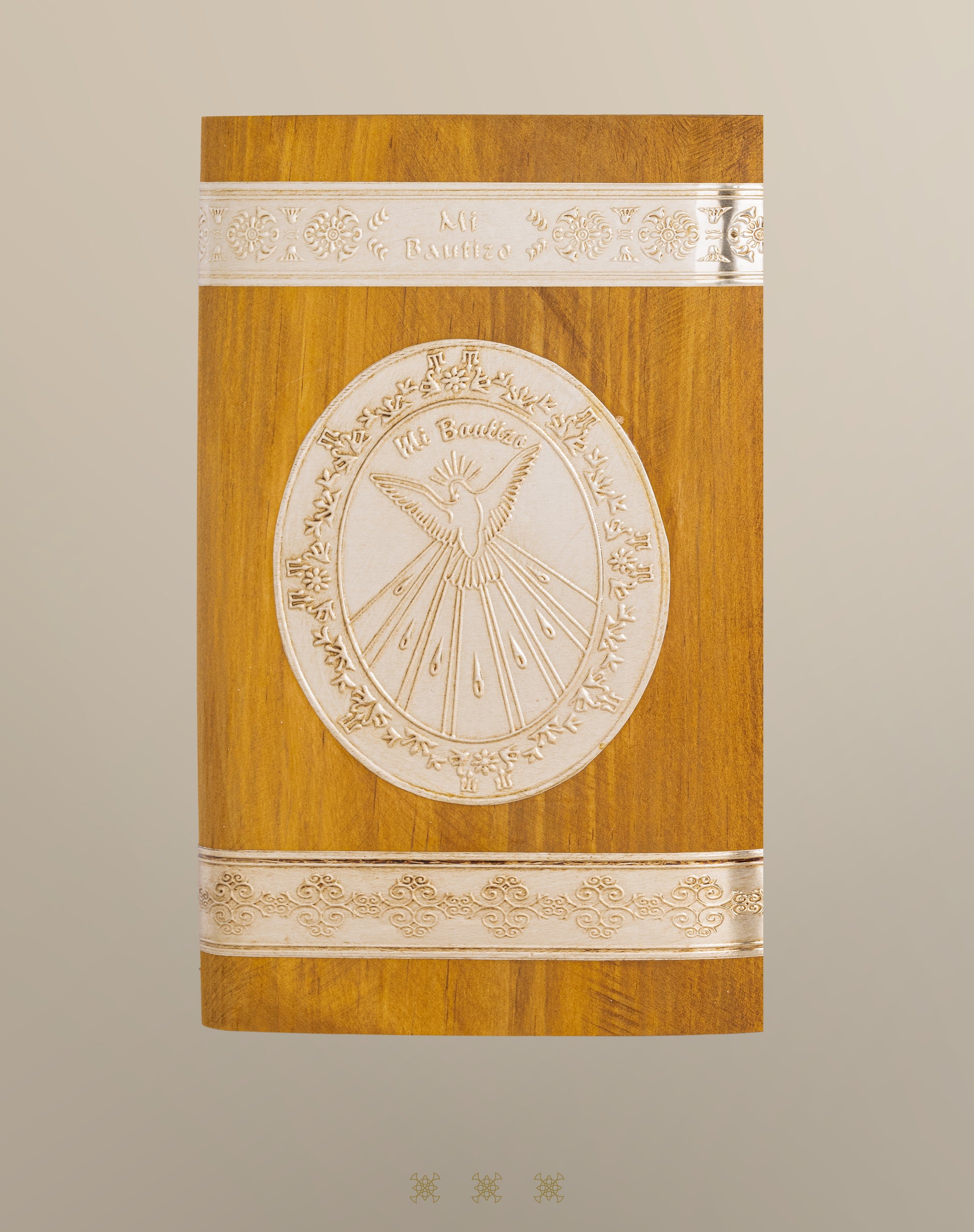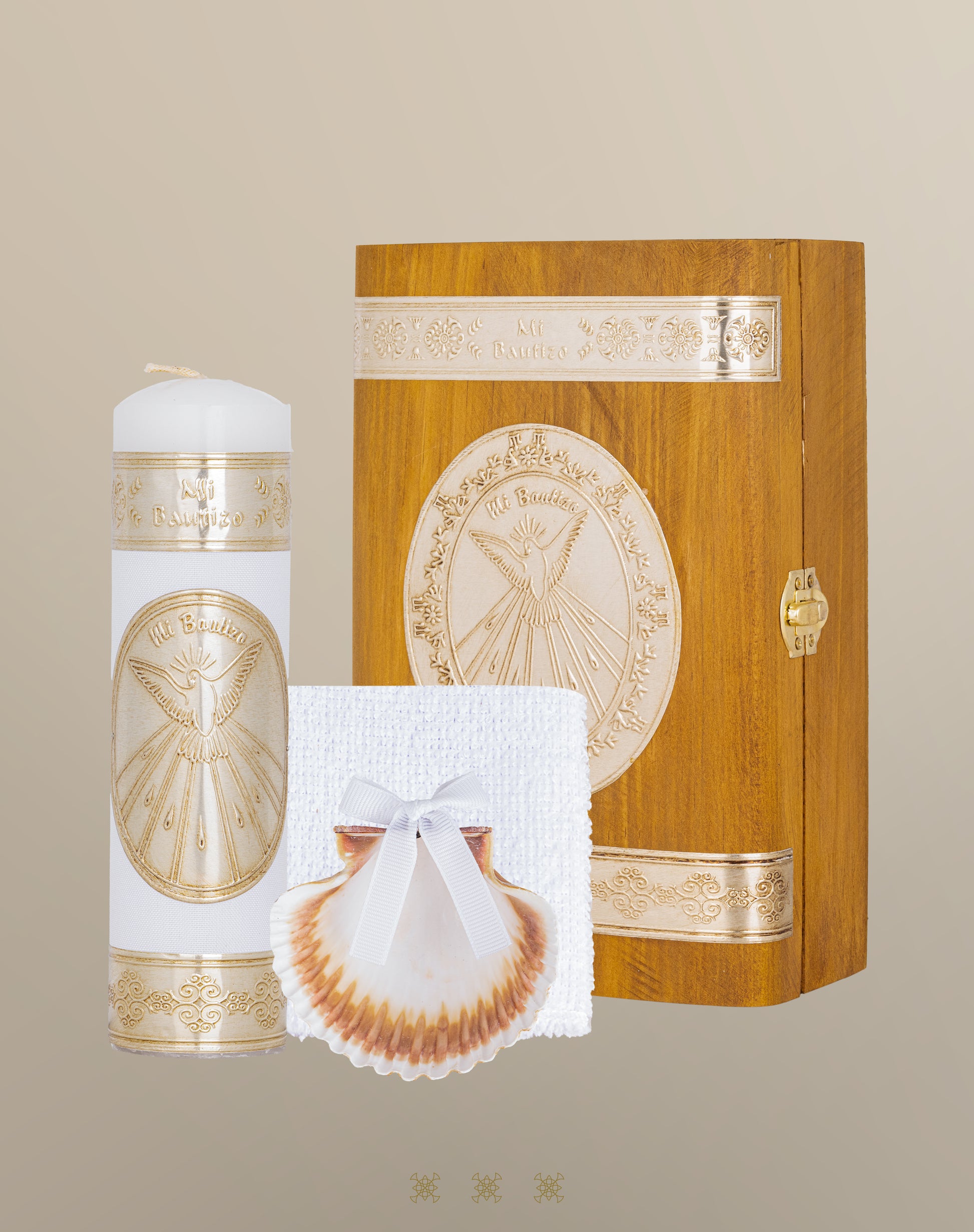 Set para Bautizo con cofre de madera, con imagen de angelito, elaborado en repujado artesanal color dorado. Vela decorada con mismo motivo en repujado. Concha con moño de listón de organza y flor color hueso. Fe de sedalina con ribete de galón.