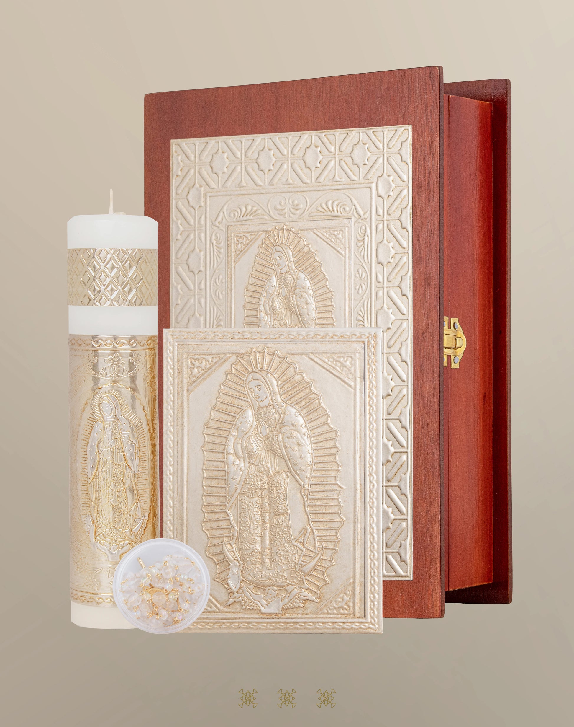 Set para Primera Comunión con cofre de madera. Decorado con imagen religiosa de la Virgen de Guadalupe, elaborado en repujado artesanal color dorado. Incluye: Cofre de madera, Biblia Latinoamericana, vela y rosario.